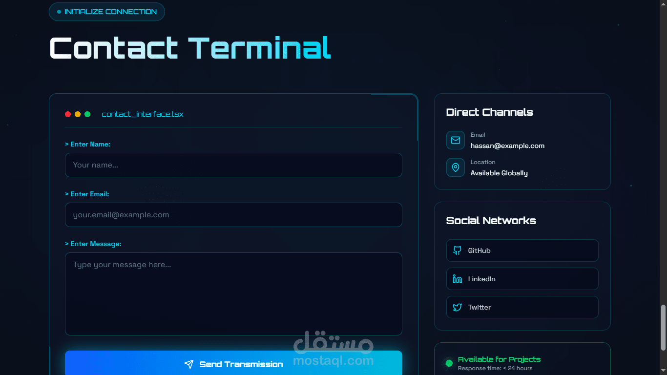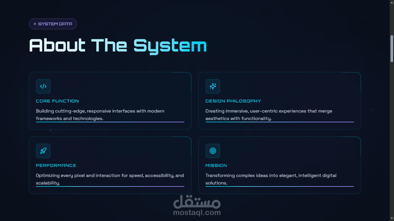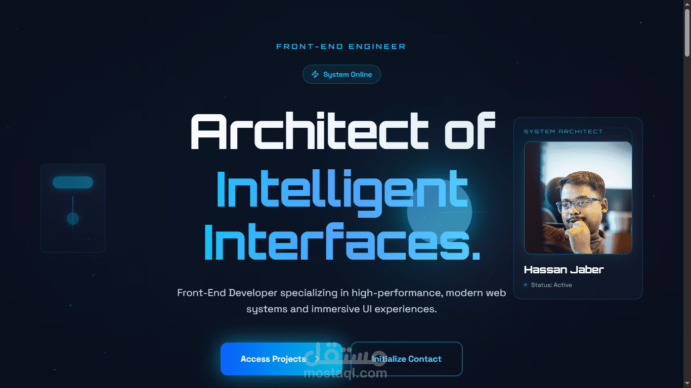قمت بتصميم وتطوير موقع إلكتروني شخصي متكامل ليعمل كواجهة رقمية تعرض سيرتي الذاتية، مهاراتي، وأعمالي السابقة بشكل عصري وتفاعلي. الهدف من المشروع كان تقديم تجربة مستخدم (UX) سلسة مع واجهة (UI) جذابة تعكس الهوية المهنية.
