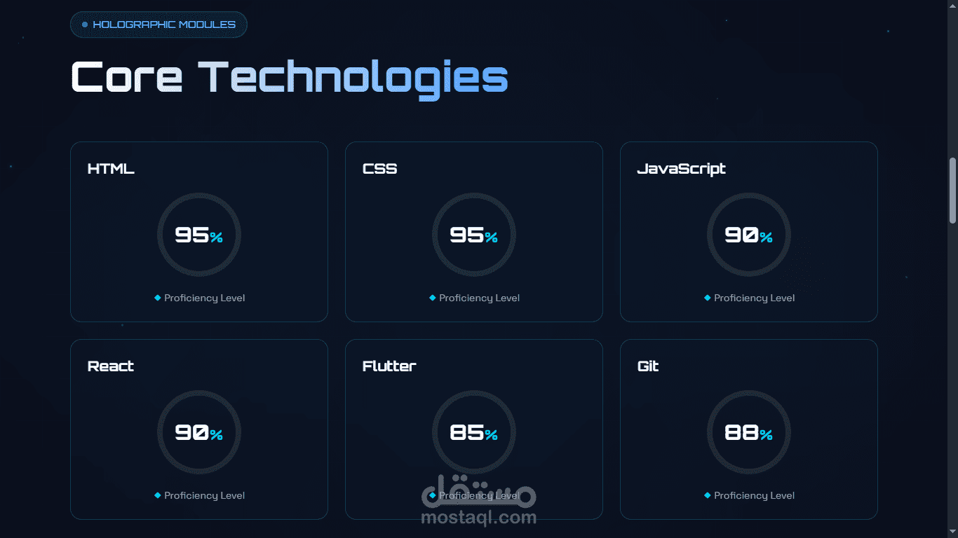 أقسام الموقع: يتضمن قسماً للتعريف الشخصي، المهارات التقنية، معرض الأعمال، ونموذج للتواصل.