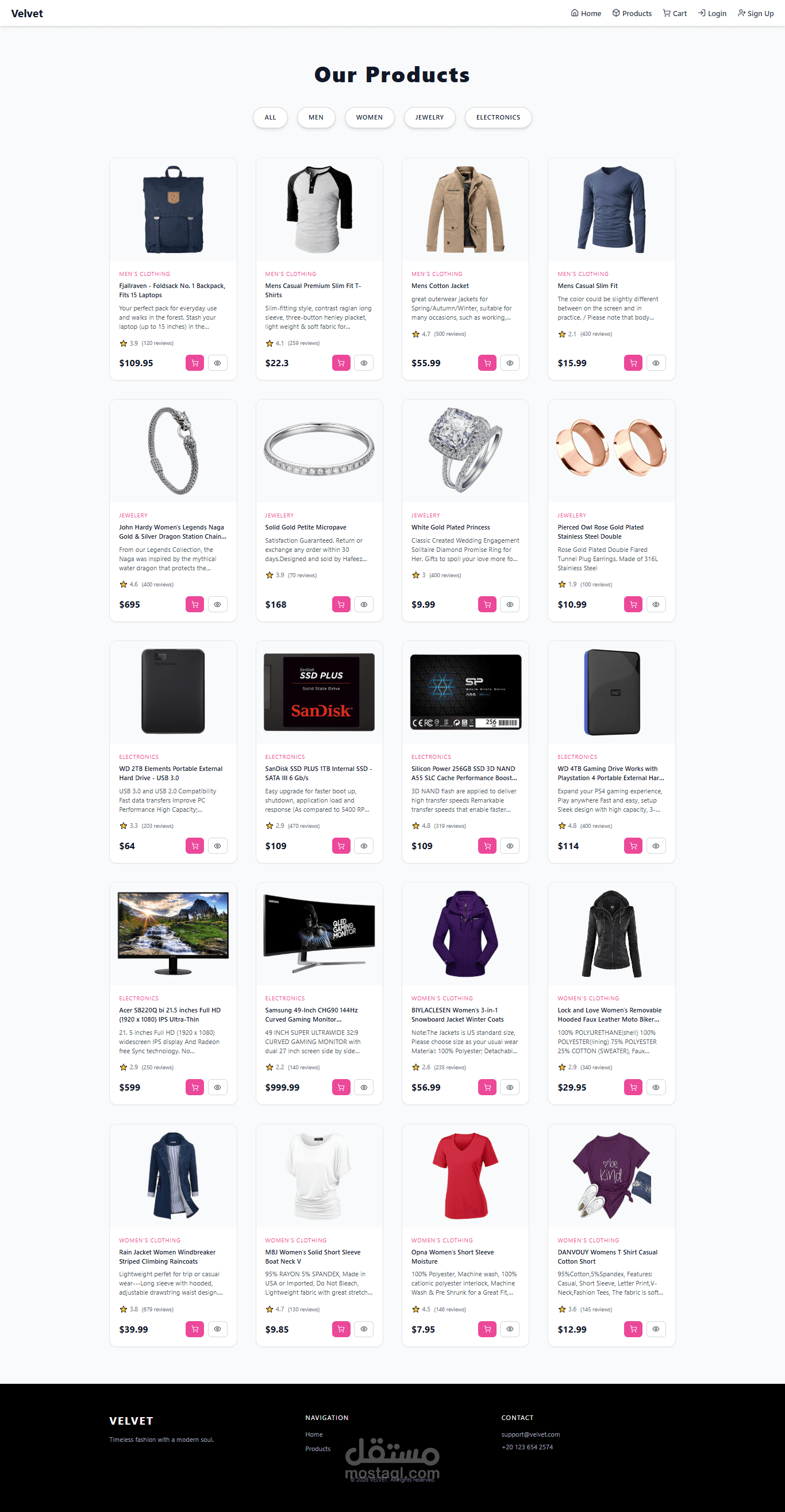 تم تطوير موقع متجر إلكتروني متكامل باستخدام React.js مع هيكل Component-Based Architecture احترافي وتصميم متجاوب بالكامل باستخدام Tailwind CSS. يحتوي الموقع على Hero Slider ديناميكي، أقسام فئات المنتجات بشكل جذاب، وعرض المنتجات من خلال API خارجي مع تحسين تجربة المستخدم وسرعة الأداء. ركّز المشروع على تنظيم الكود، القابلية للتوسع، وأفضل ممارسات تصميم واجهات الويب الحديثة.