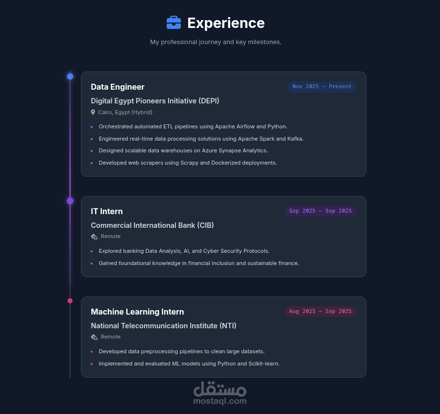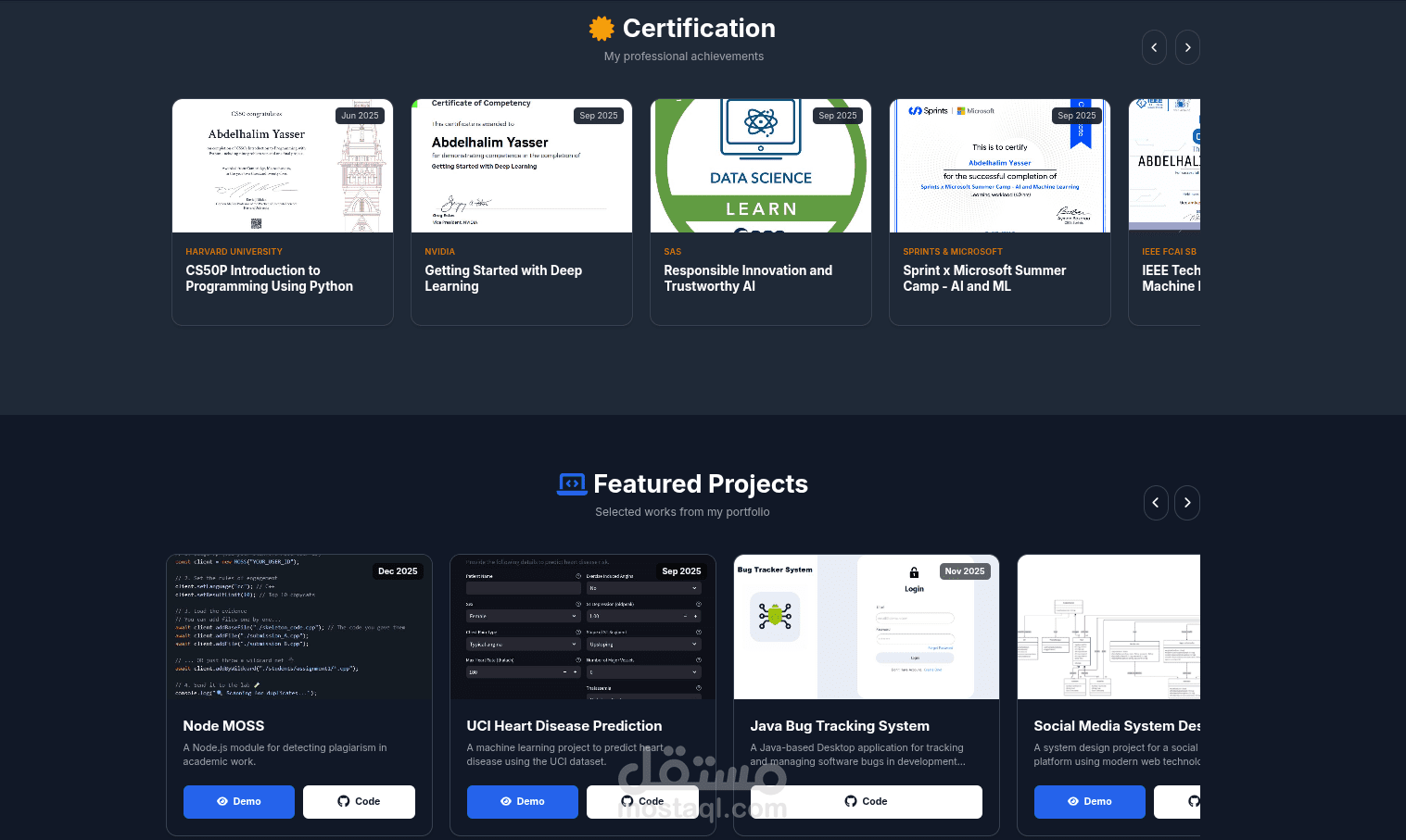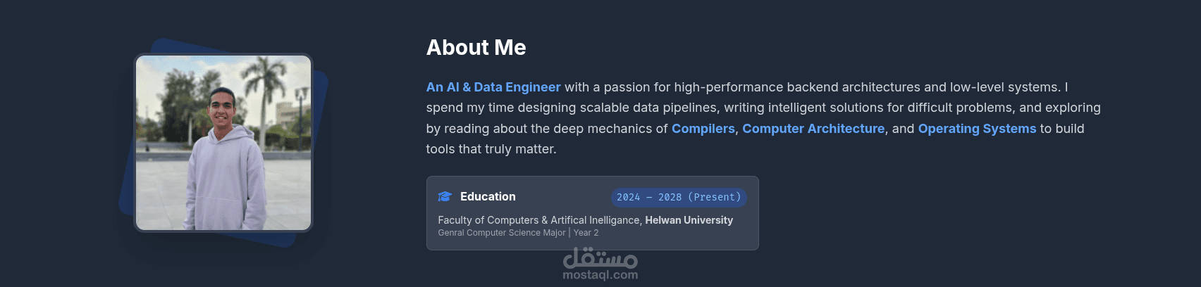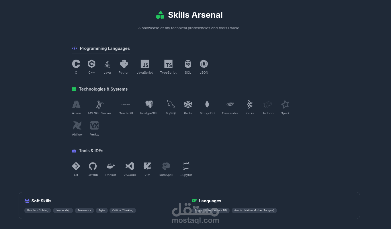 فصل البيانات عن التصميم؛ حيث يعتمد الموقع على ملفات JSON لتغذية المحتوى (المشاريع، المهارات، الخبرات).