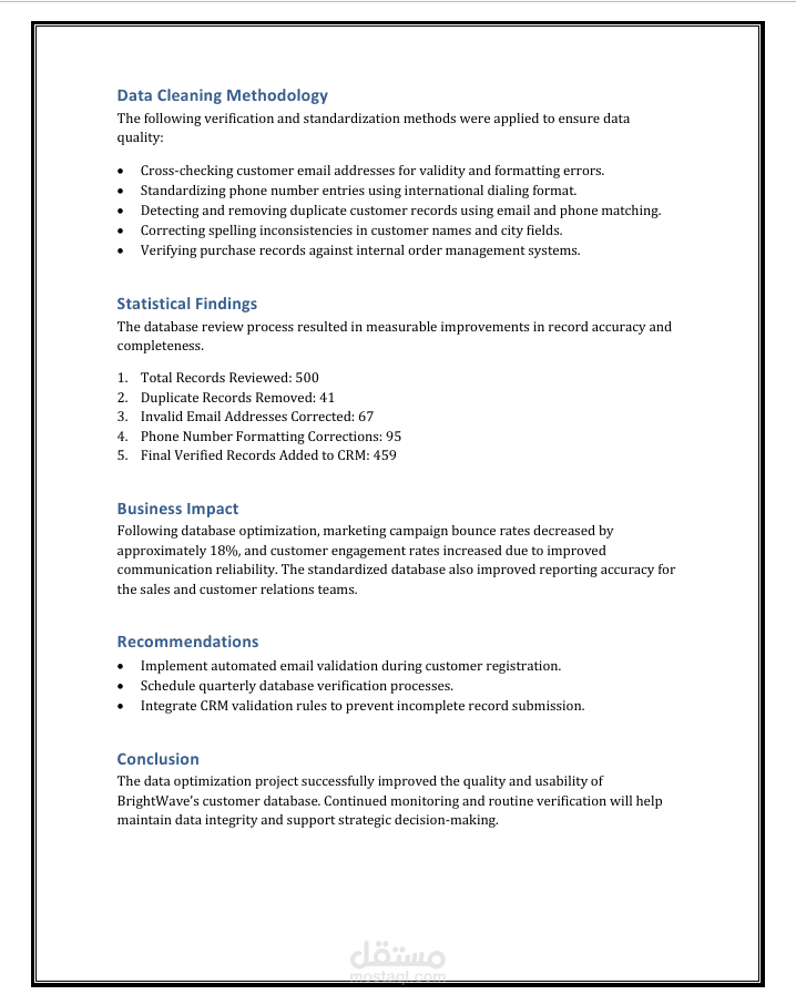 I completed a large-scale data entry and documentation project involving the organization, verification, and formatting of customer database records for BrightWave Marketing Solutions. The project required converting raw marketing and customer service records into a professionally structured Microsoft Word report.