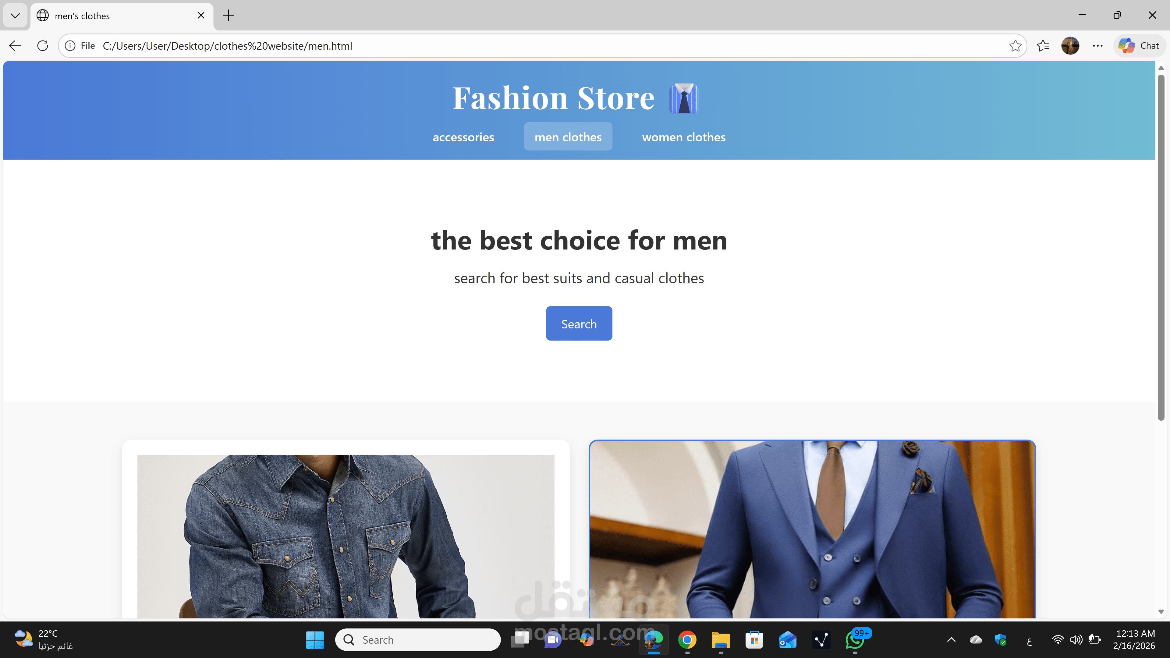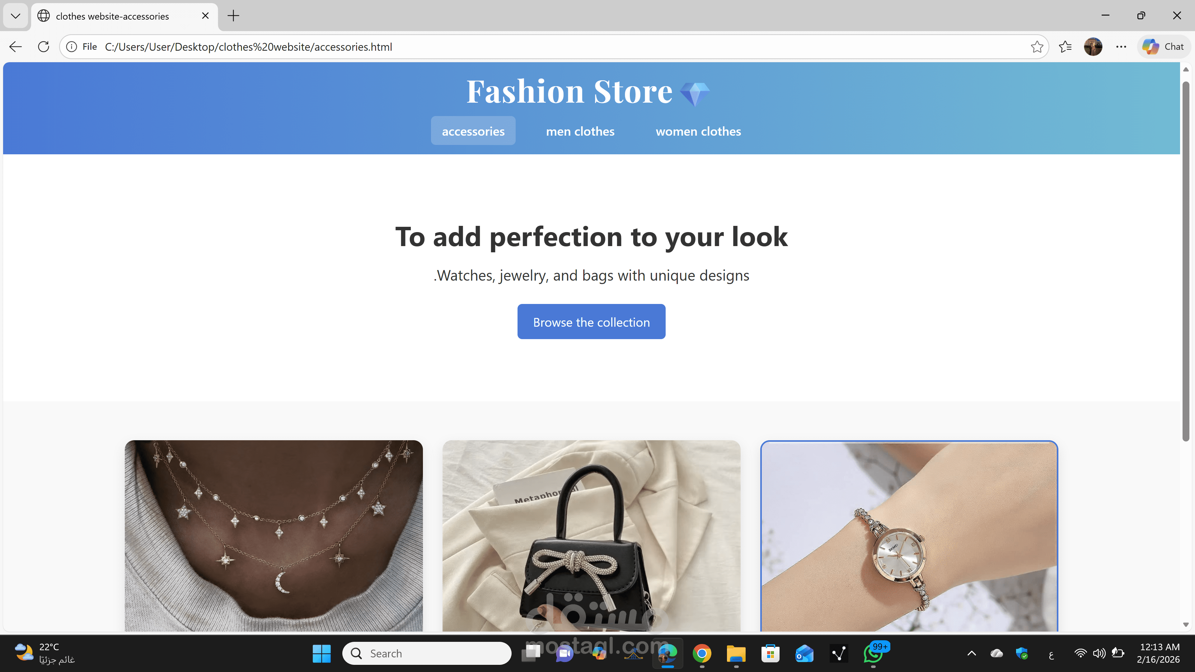تعدد الصفحات: المشروع يضم صفحات مخصصة لكل فئة (Women, Men, Accessories) لضمان تنظيم المحتوى وعدم تشتت العميل.