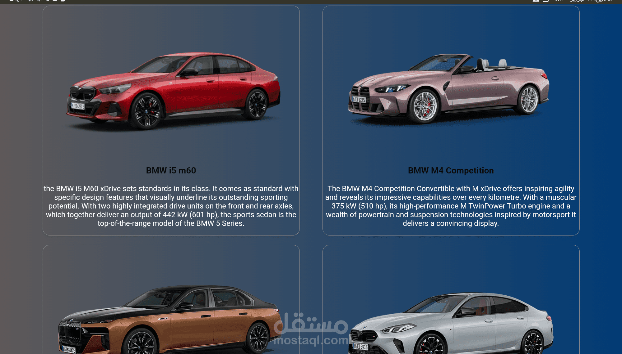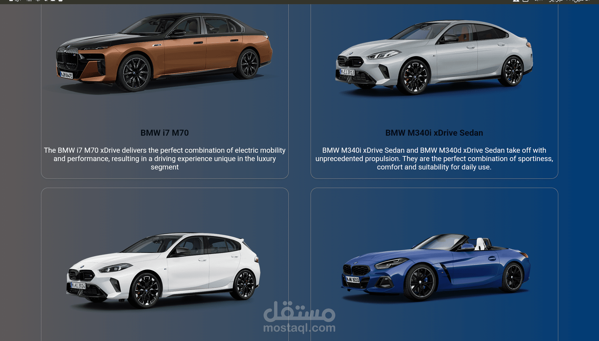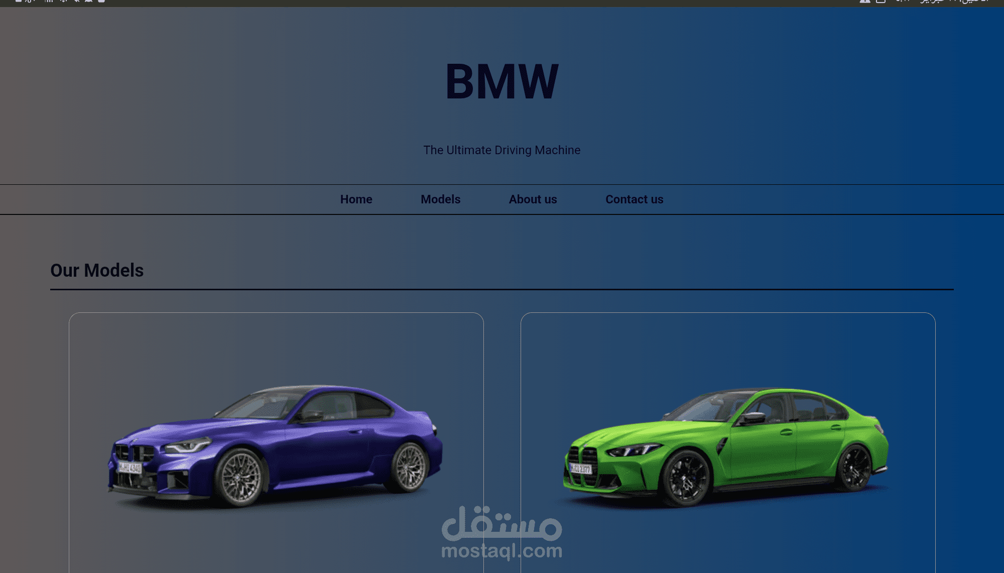 هذا مشروع واجهة موقع تفاعلي بسيط وعصري يعرض صفحة هبوط (Landing Page) مستوحاة من تصميم موقع BMW، تم تنفيذه باستخدام HTML و CSS و JavaScript.