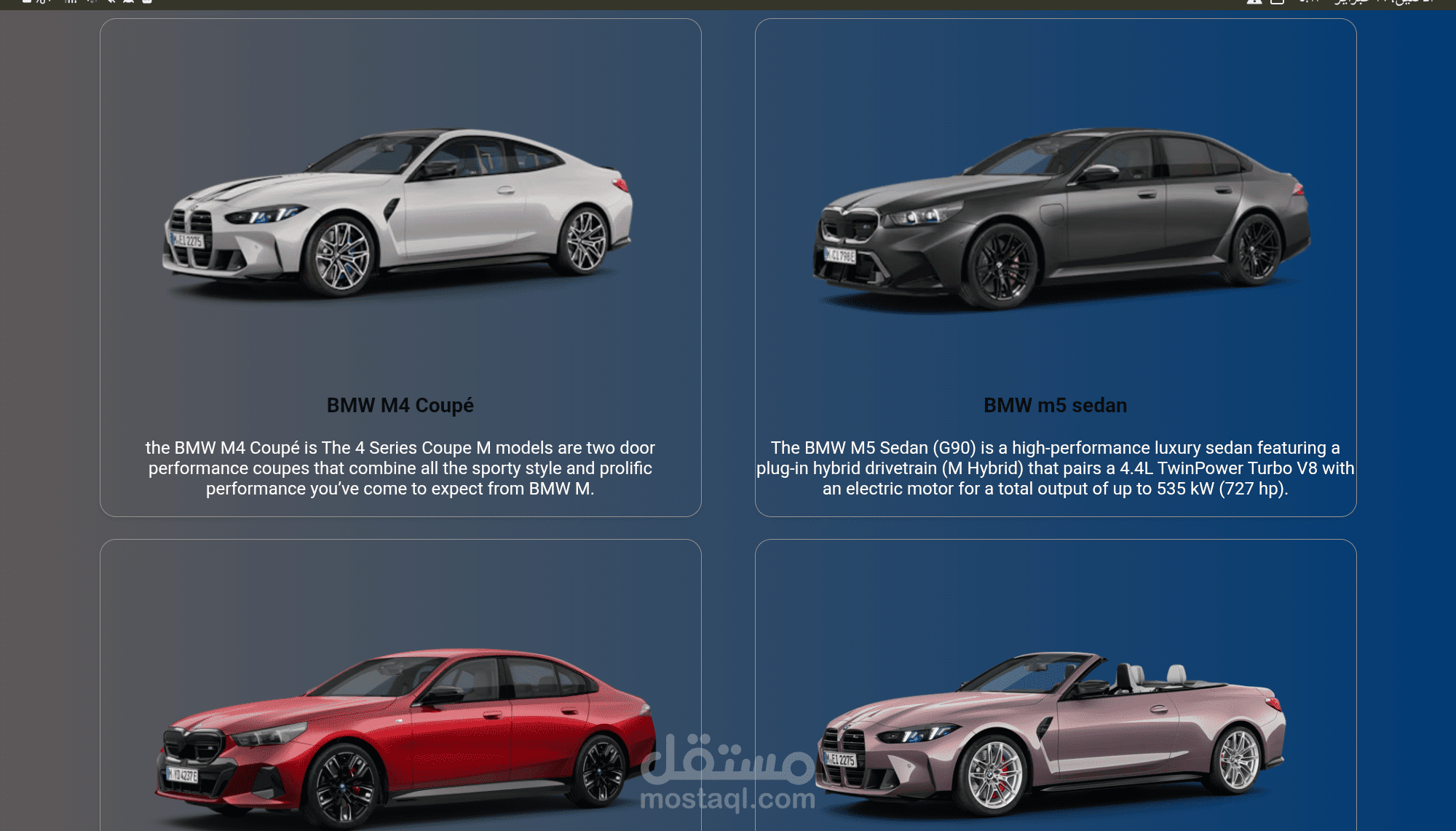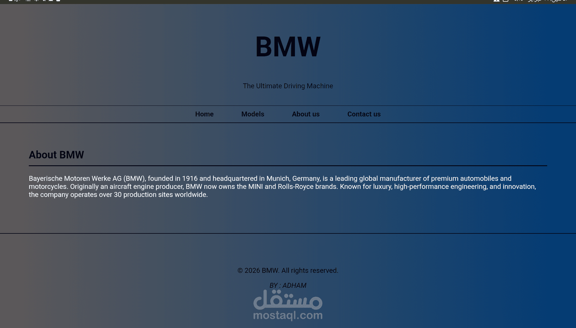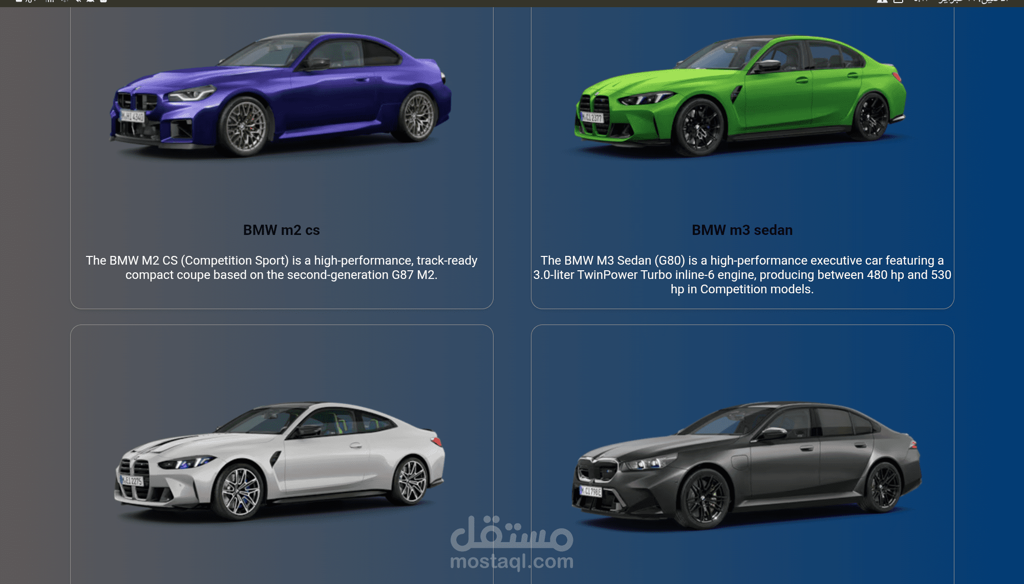 هذا مشروع واجهة موقع تفاعلي بسيط وعصري يعرض صفحة هبوط (Landing Page) مستوحاة من تصميم موقع BMW، تم تنفيذه باستخدام HTML و CSS و JavaScript.