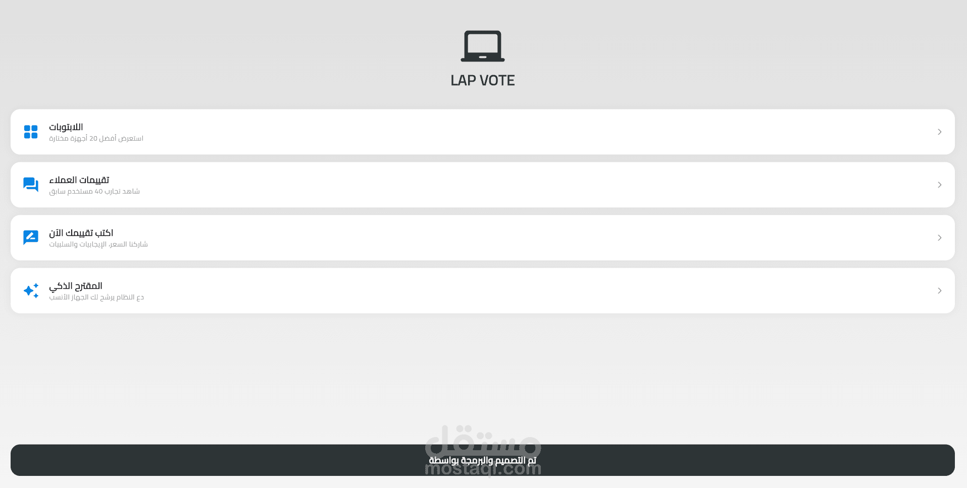 بناء واجهة مستخدم (UI) تفاعلية وسلسة ترشد المستخدم خلال عملية الاختيار.
