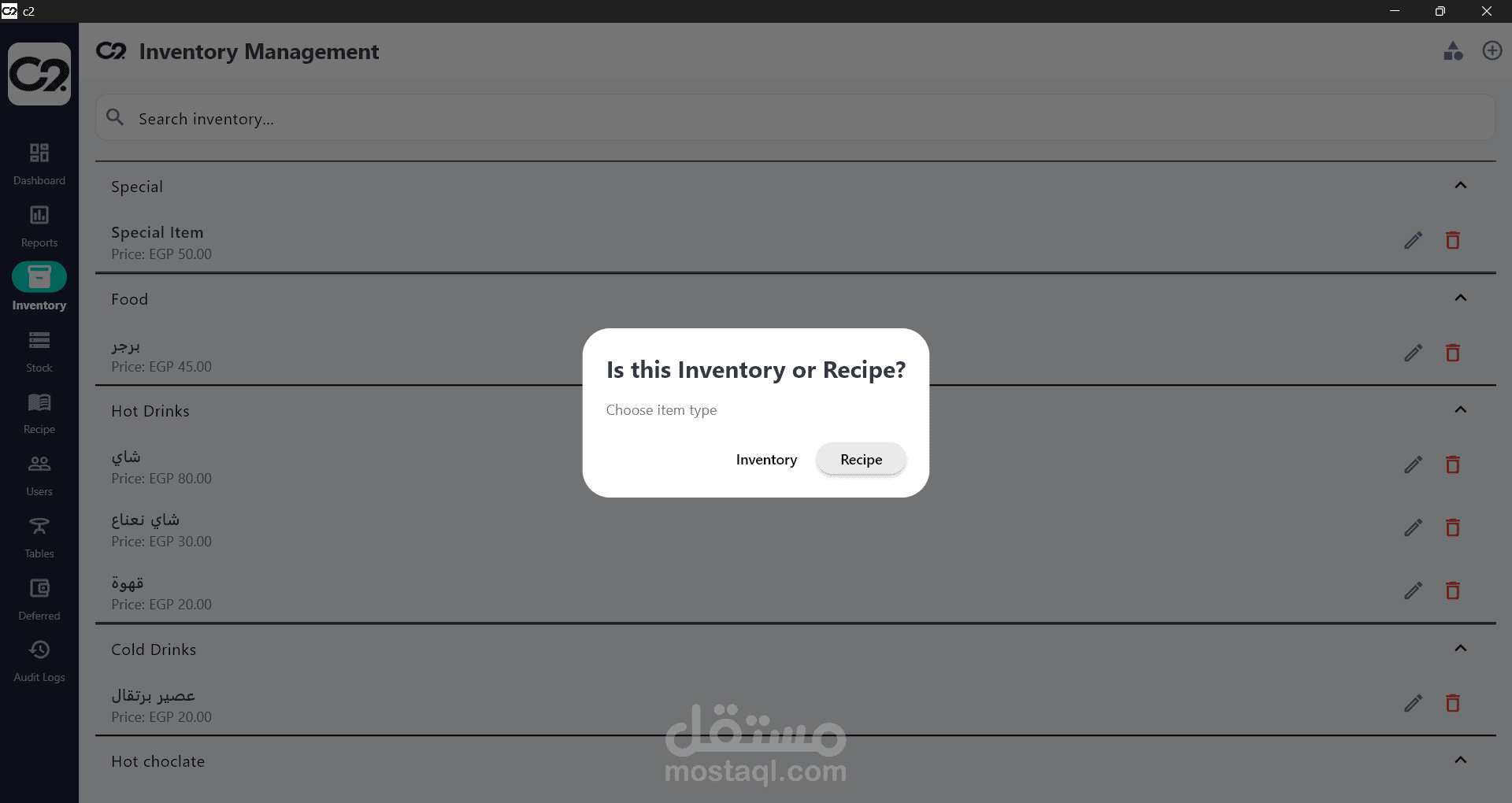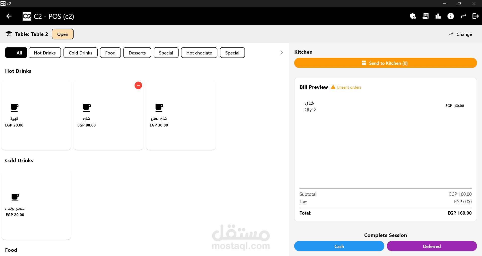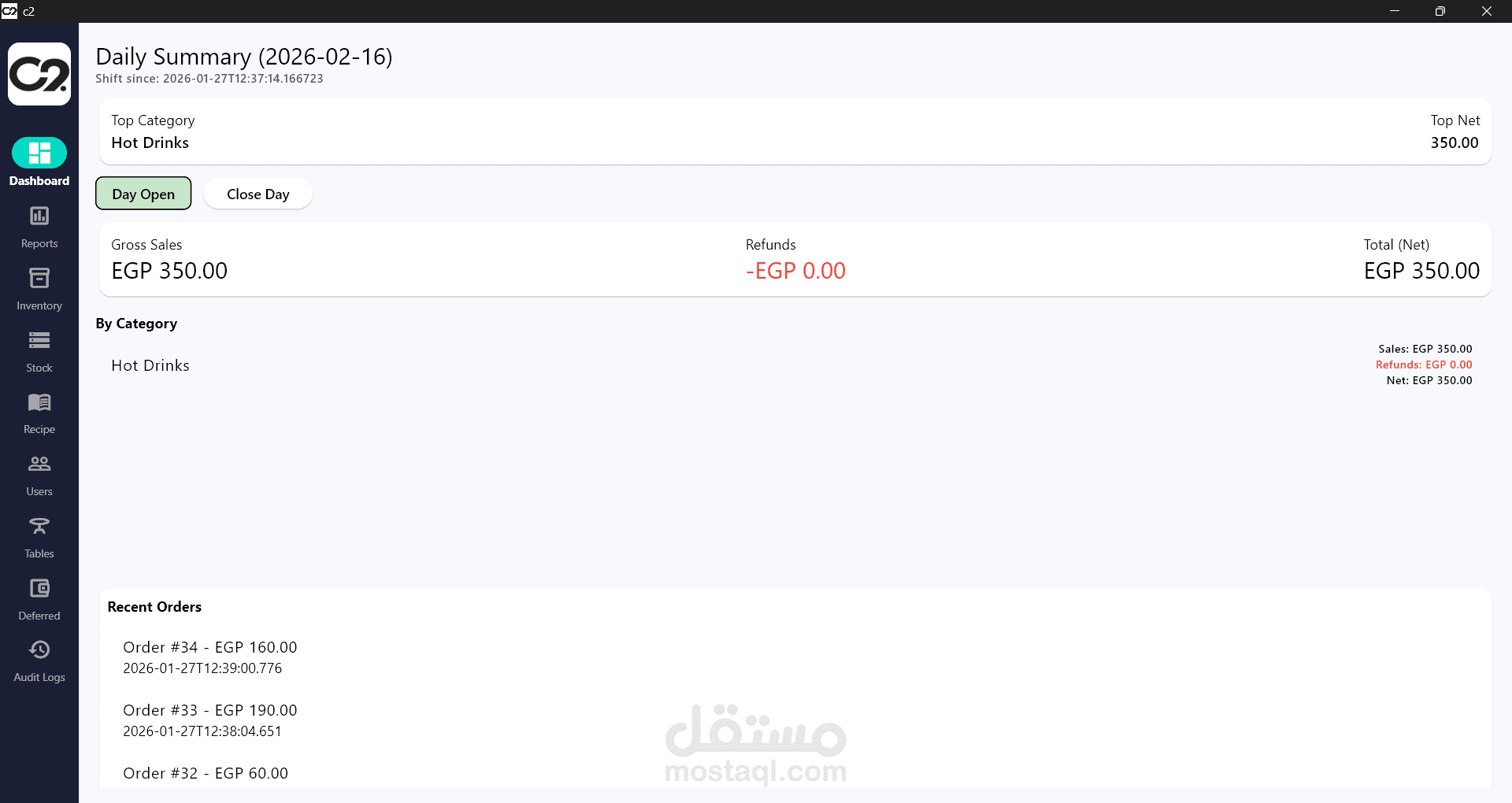 قمت بتطوير نظام نقاط بيع (POS) متكامل لكافيه C2 باستخدام Flutter، مصمم ليعمل بكفاءة عالية مع قاعدة بيانات محلية (Local Database) بدون الحاجة إلى اتصال دائم بالإنترنت.
