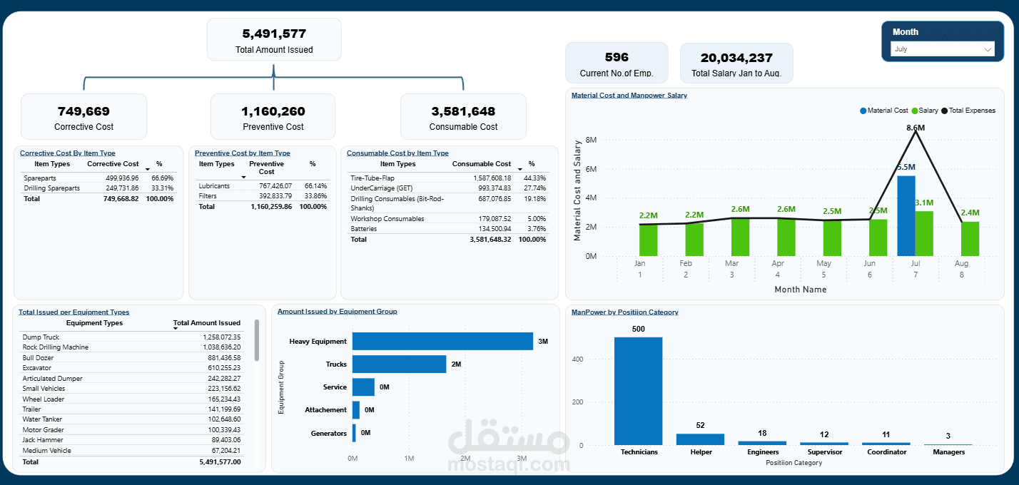 لوحة معلومات للمعدات تركز على متابعة إجمالي المبالغ المصروفة وتوزيعها حسب أنواع التكاليف التصحيحية والوقائية والاستهلاكية، مع تحليل الإنفاق حسب نوع المعدة والمجموعة التشغيلية. كما تعرض مقارنة تكلفة المواد ورواتب القوى العاملة شهريًا، وعدد الموظفين المرتبطين بالتشغيل. تتيح هذه اللوحة للإدارة مراقبة أداء الأصول، ضبط تكاليف الصيانة، وتحسين كفاءة إدارة المعدات واتخاذ قرارات مبنية على بيانات دقيقة.