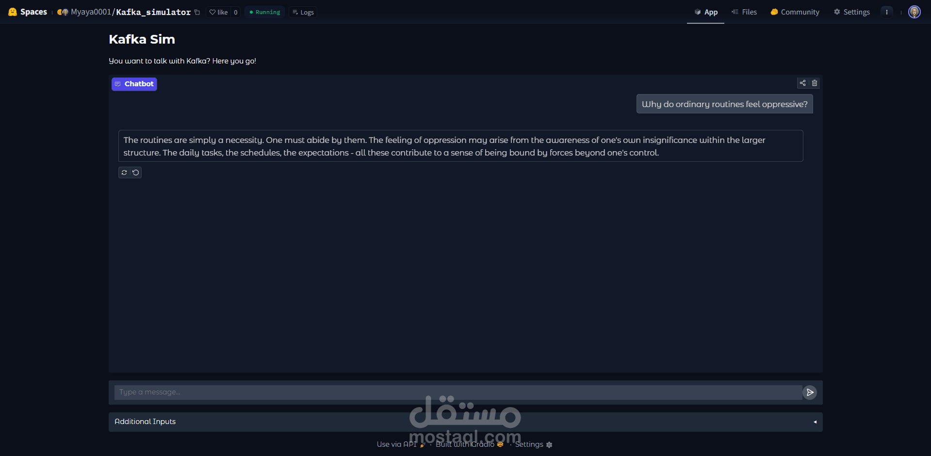 3️⃣ يقوم النموذج بتوليد رد بأسلوب أدبي يحاكي كافكا.