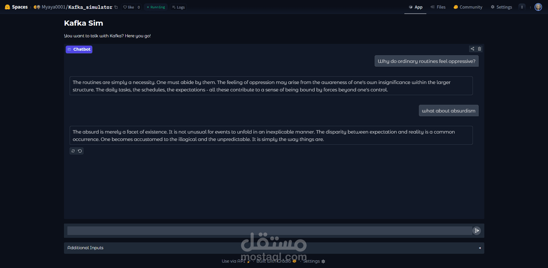 يعتمد النظام بالكامل على System Prompt Engineering لصناعة شخصية أدبية متكاملة تحاكي الأسلوب الكافكاوي (الوجودي – العبثي – القلق الداخلي) دون الاعتماد على قاعدة بيانات خارجية أو RAG.