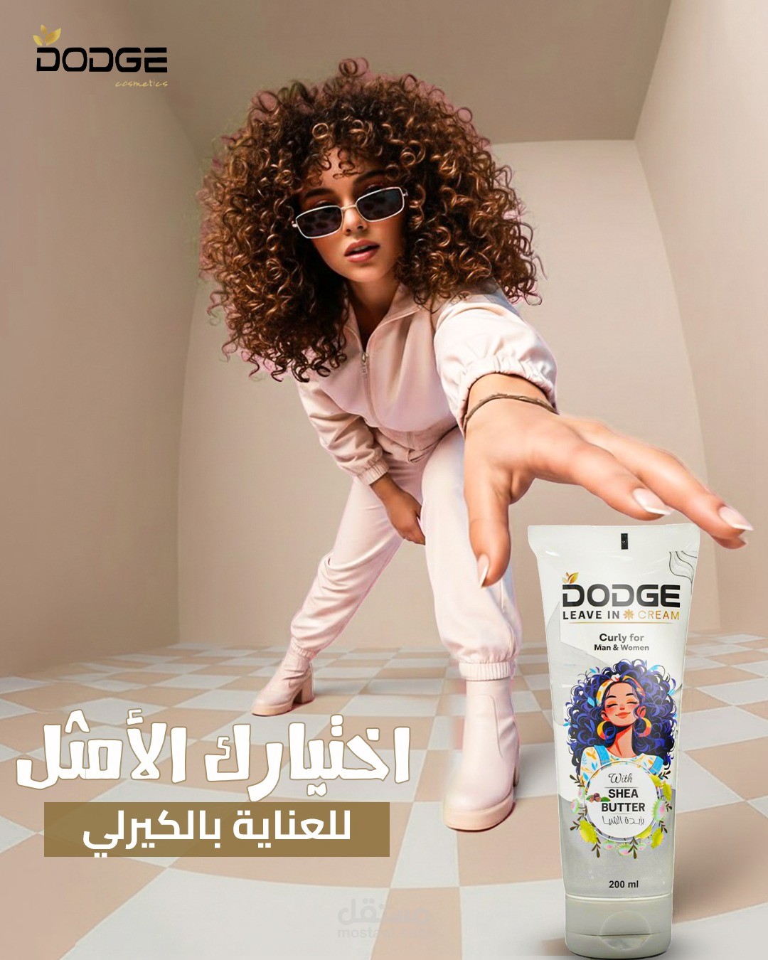 تصميم إعلاني لمنتج Dodge Leave-In Cream مستوحى من أجواء الحضارة المصرية القديمة، بيعكس فكرة “الجمال الأسطوري” من خلال شخصية ملكية داخل معبد فرعوني بإضاءة ذهبية فخمة.