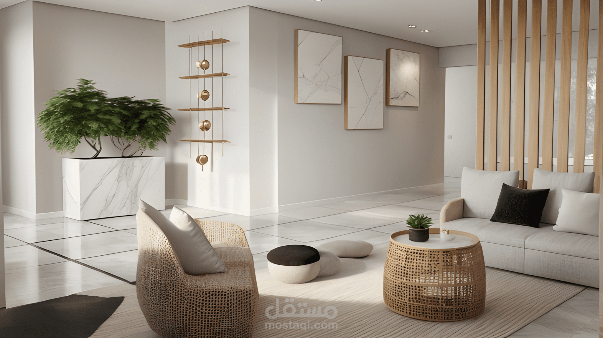 تصميم شقة سكنية متكاملة بأسلوب مودرن مينيمال يعتمد على البساطة والهدوء البصري مع استخدام خامات طبيعية وألوان محايدة لخلق بيئة معيشية مريحة وعصرية.