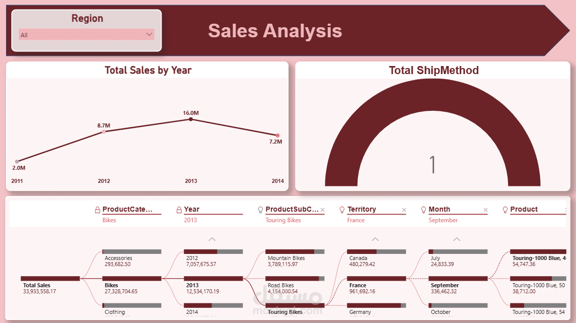 مشروع تدريبي لتحليل بيانات المبيعات باستخدام Power BI، يتضمن تصميم Dashboard تفاعلية تعرض مؤشرات الأداء الرئيسية وتحليل المبيعات حسب المنطقة، المنتج، حالة الطلب، والفترة الزمنية، مع استخدام DAX وإنشاء تقارير احترافية تدعم اتخاذ القرار.