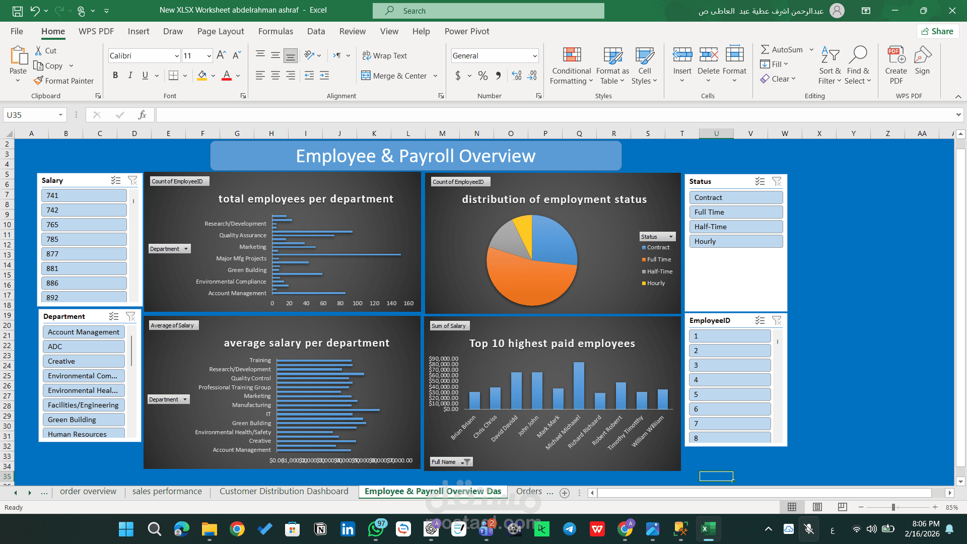 يهدف هذا المشروع إلى تحليل بيانات الموارد البشرية والرواتب من خلال تصميم Dashboard تفاعلية متكاملة تساعد الإدارة على فهم توزيع الموظفين، هيكل الرواتب، وتحليل الأداء المالي المرتبط بالقوى العاملة.