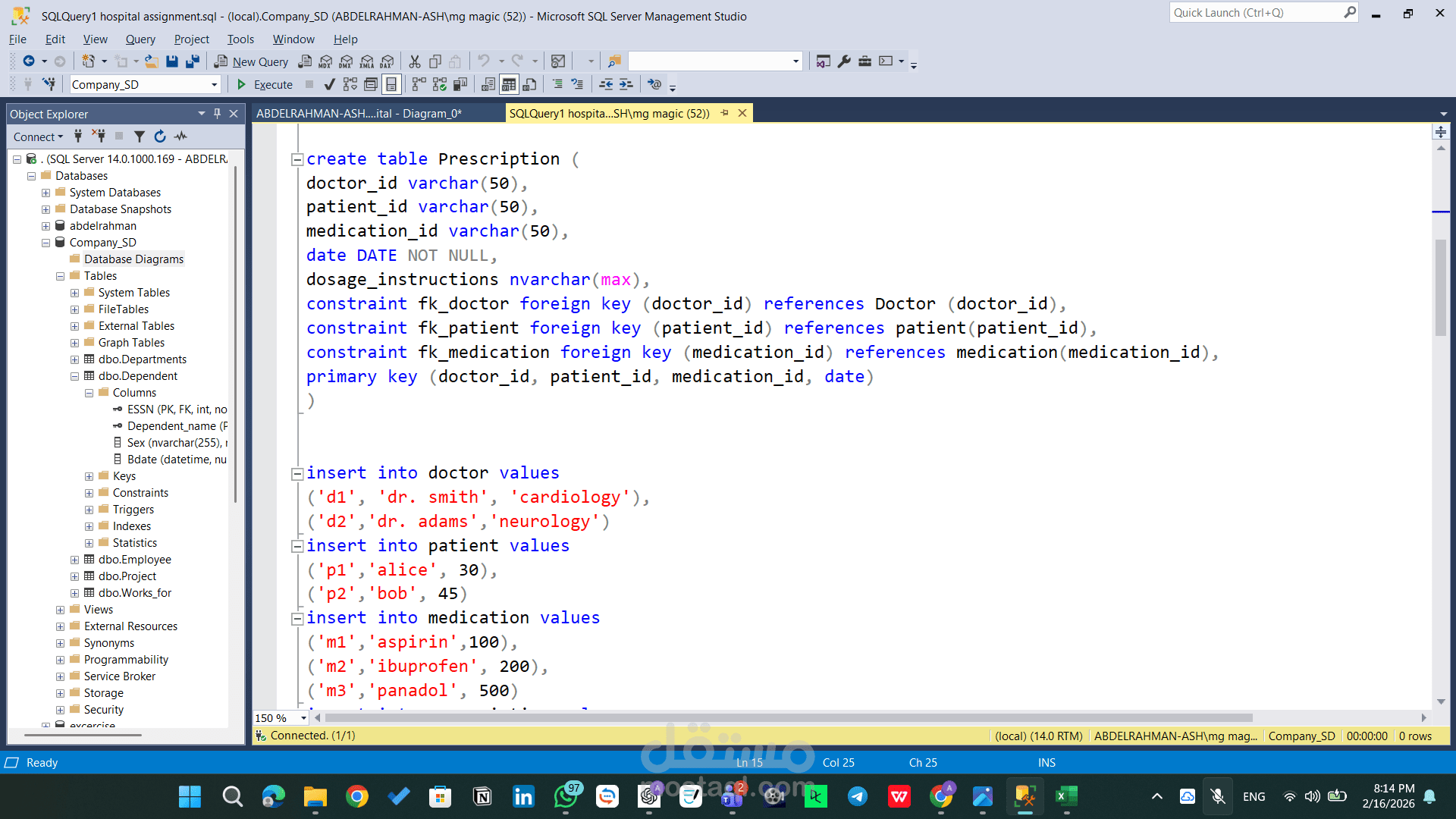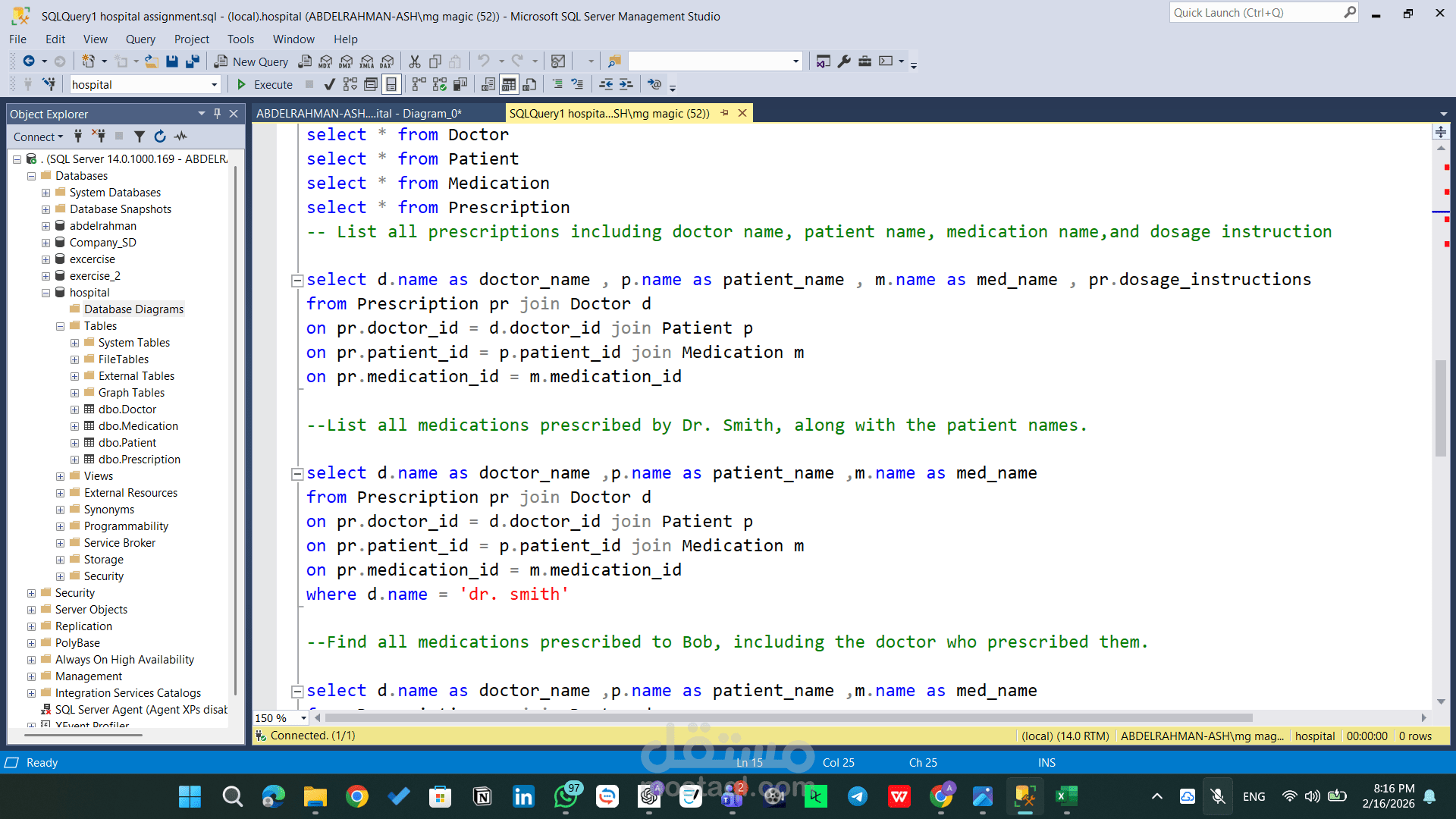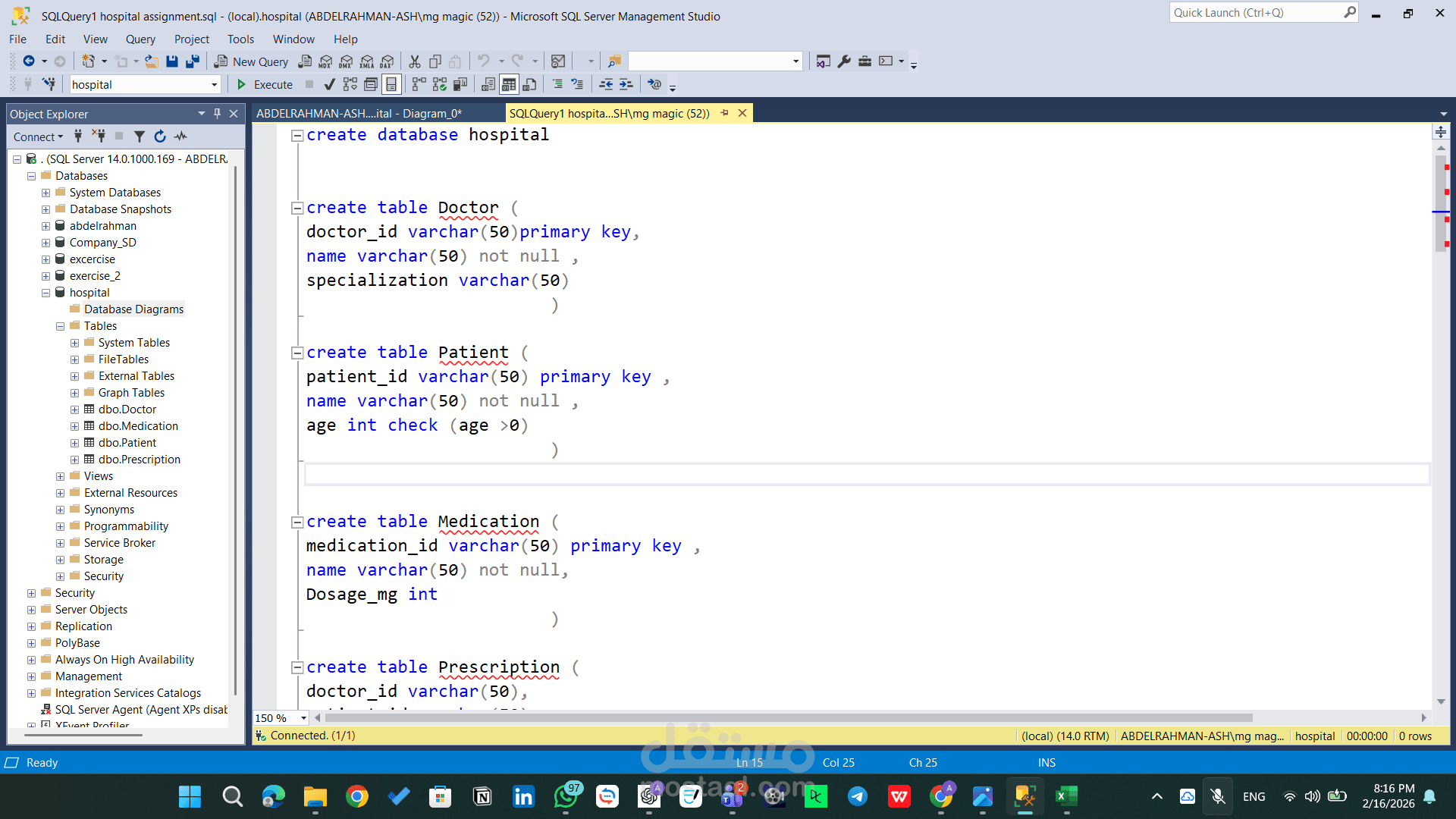 هذا المشروع يهدف إلى تصميم وتنفيذ قاعدة بيانات علائقية (Relational Database) لإدارة بيانات نظام مستشفى، مع التركيز على تنظيم العلاقات بين الأطباء والمرضى والوصفات الطبية والأدوية.