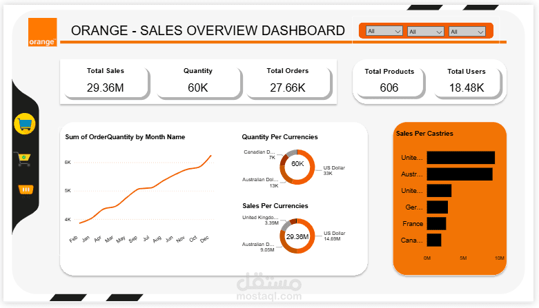 يتكون المشروع من عدة صفحات مترابطة (Home – Overview – Sales Breakdown)، تتيح تحليل الأداء من أكثر من منظور، مع تصميم احترافي يعكس هوية العلامة التجارية ويُركز على تجربة مستخدم واضحة وسهلة التفاعل.