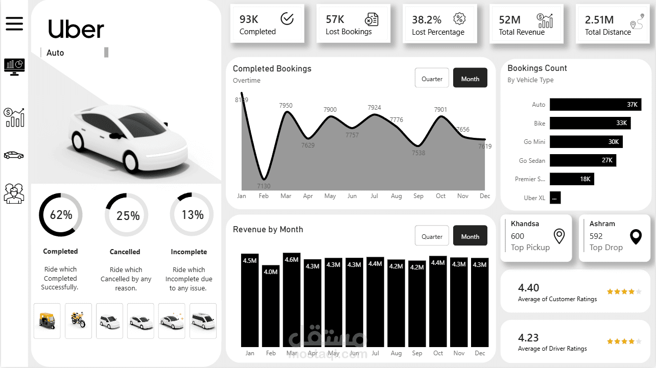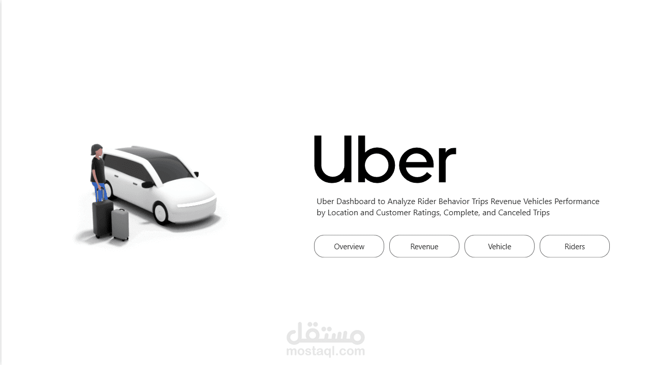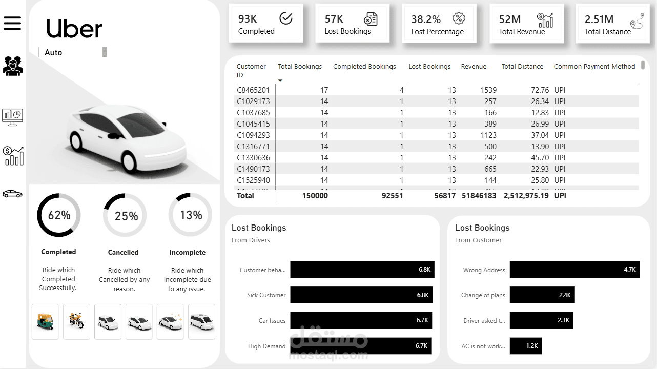 مشروع تحليلي متقدم يعتمد على بيانات رحلات شركة Uber، يهدف إلى تقديم رؤية شاملة حول الأداء المالي والتشغيلي. تم تصميم اللوحة بواجهة مستخدم (UI) احترافية تتضمن Sidebar Navigation Menu لسهولة التنقل بين 6 أقسام تحليلية مختلفة.