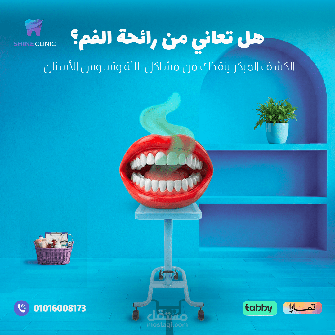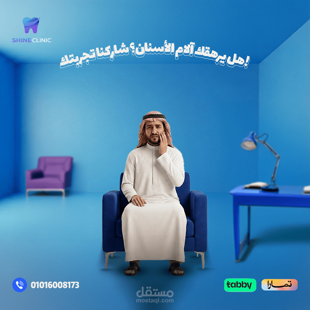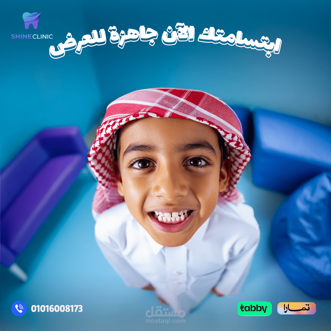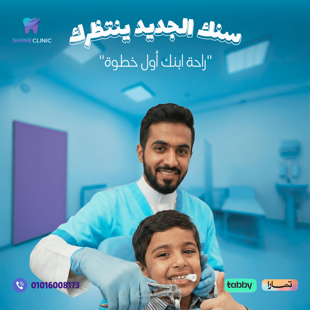 هذا العمل عبارة عن تصميم بوستر إعلاني احترافي لعيادة أسنان (Shine Clinic) يهدف إلى طمأنة الأطفال وأولياء الأمور بأن بيئة العيادة آمنة ومريحة وخالية من الخوف.