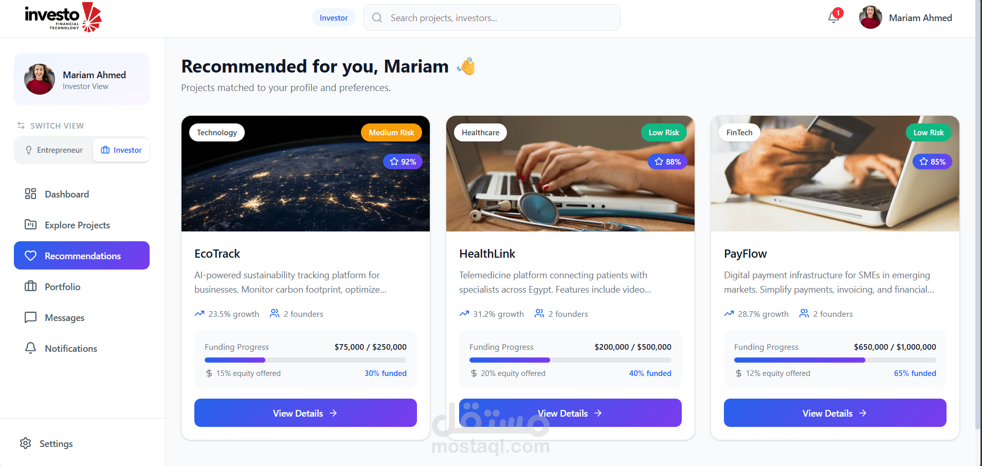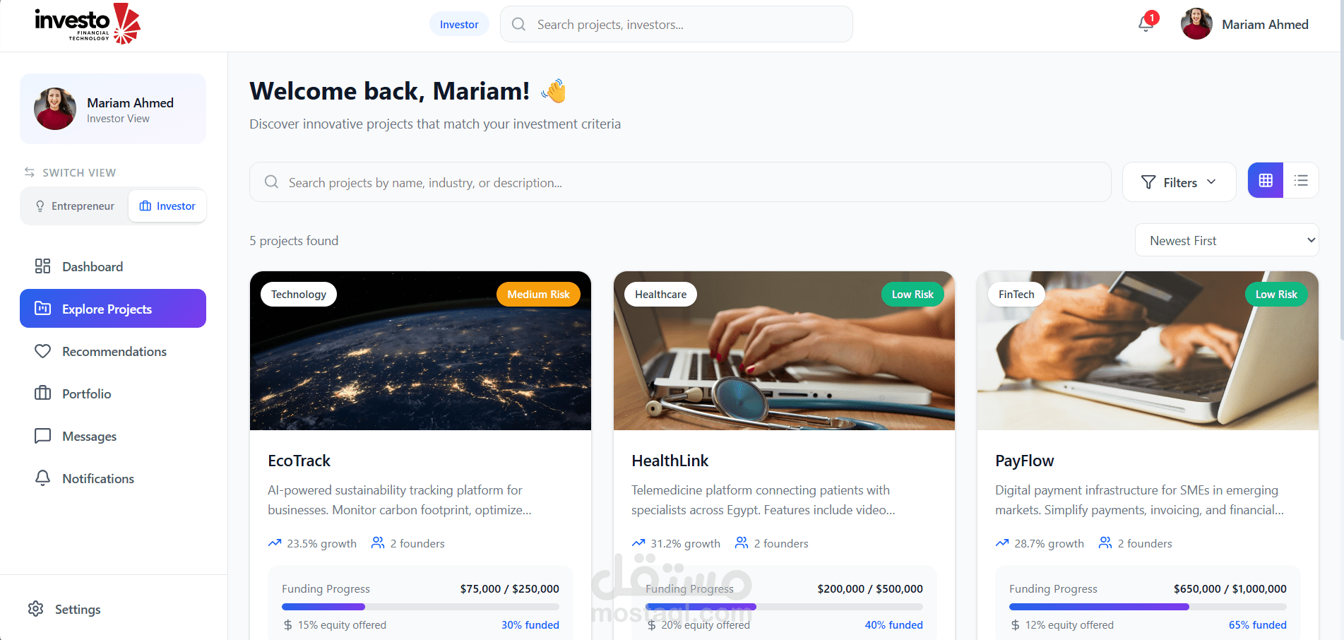 يهدف هذا المشروع إلى معالجة واحدة من أبرز التحديات التي تواجه المشروعات الصغيرة والمتوسطة في مصر، وهي صعوبة الحصول على تمويل مناسب ومستدام. فالكثير من رواد الأعمال يعانون من محدودية الوصول إلى المستثمرين، وضعف أدوات عرض وتحليل البيانات المالية، بالإضافة إلى التخوف من أنظمة التمويل التقليدية القائمة على الفائدة لأسباب أخلاقية أو دينية.