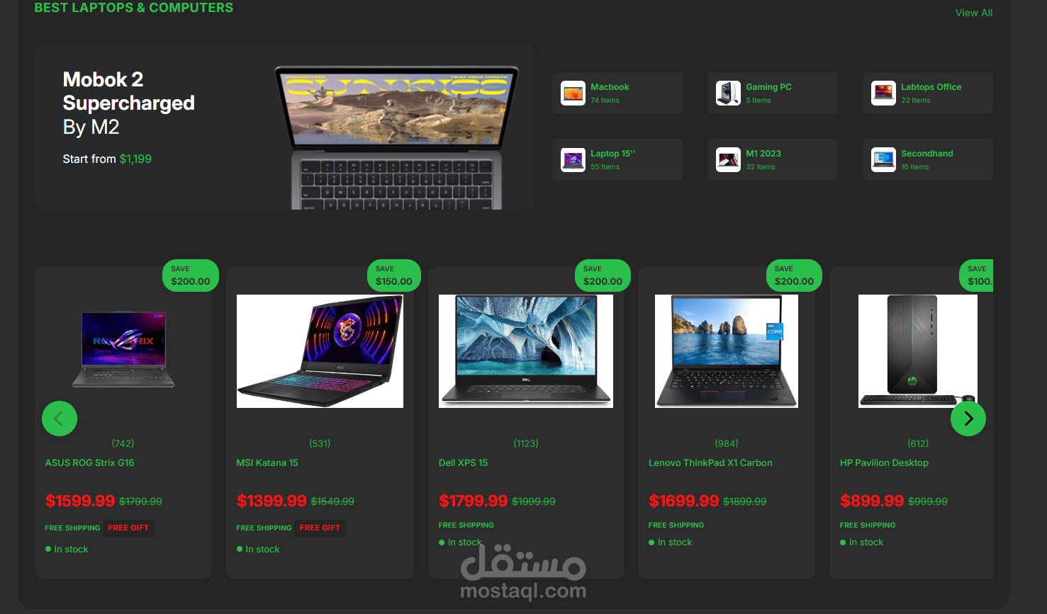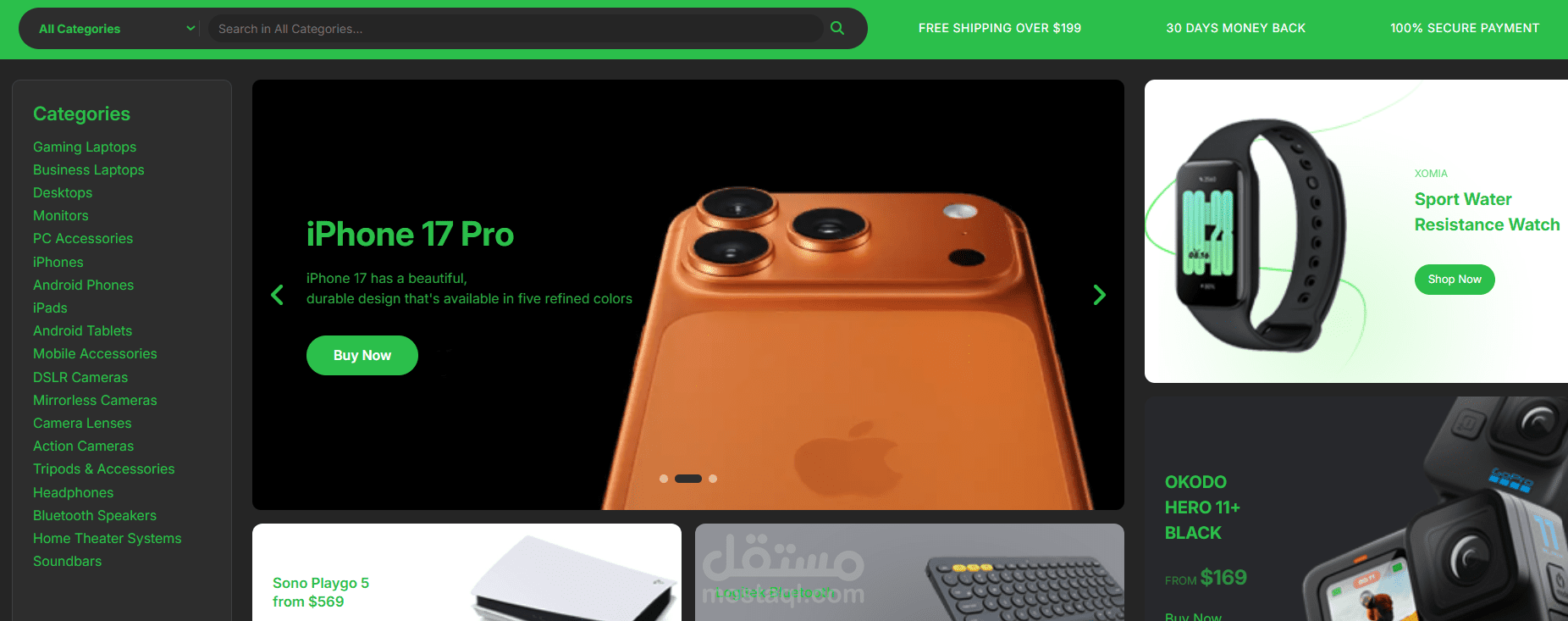 تطبيق ويب متكامل للتجارة الإلكترونية يهدف إلى تقديم تجربة تسوق متميزة وسلسة مع محاكاة دقيقة لمنصة تجارية ضخمة (Multi-Vendor Style) مخصصة للإلكترونيات، تم بناؤها بتركيز عالٍ على الأداء، التجاوب مع مختلف الشاشات، ونظافة الكود المصدري.