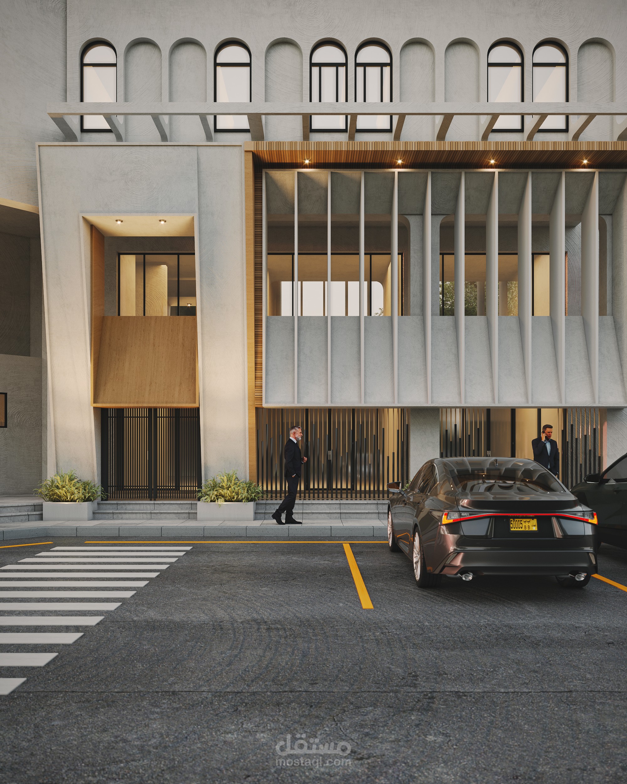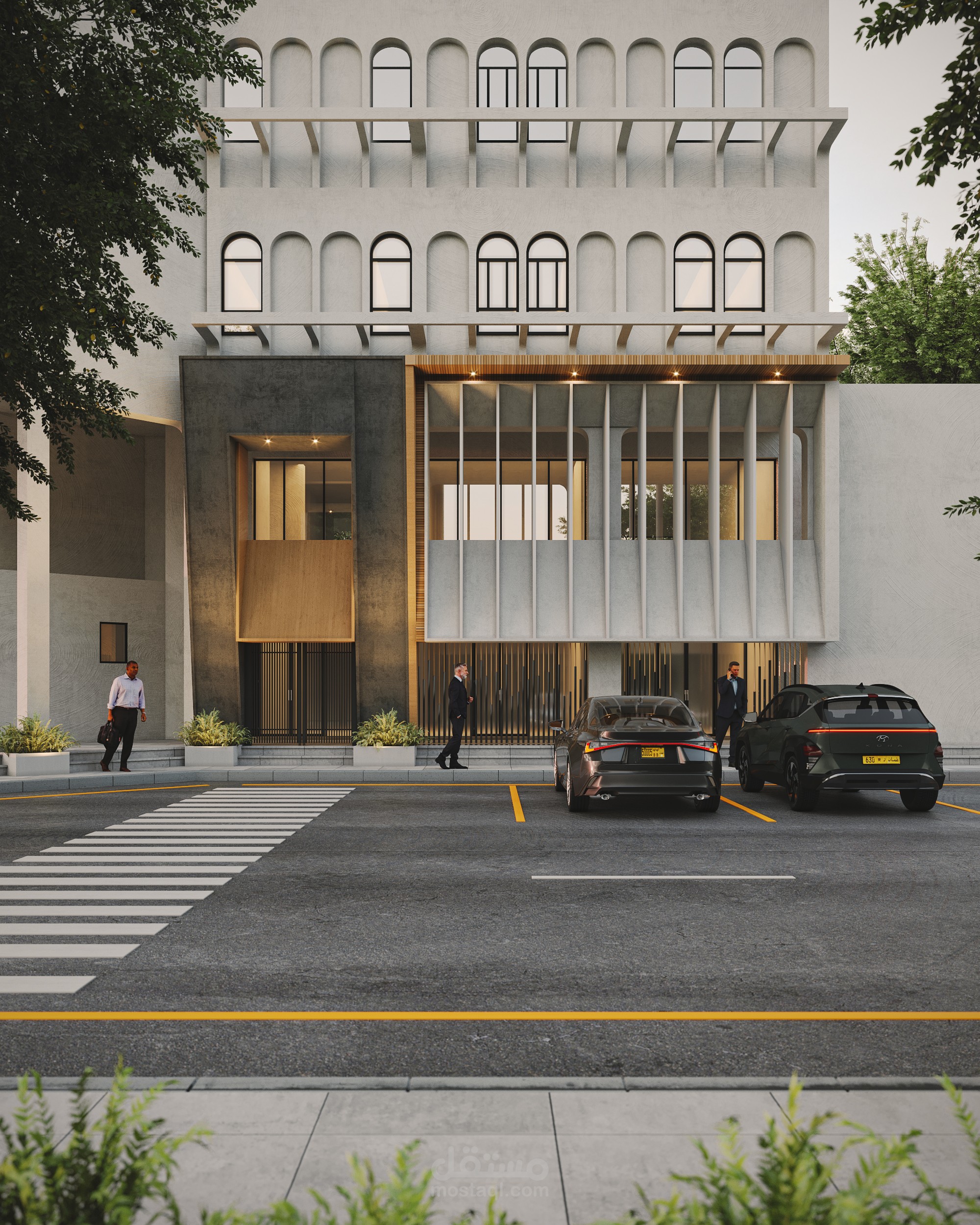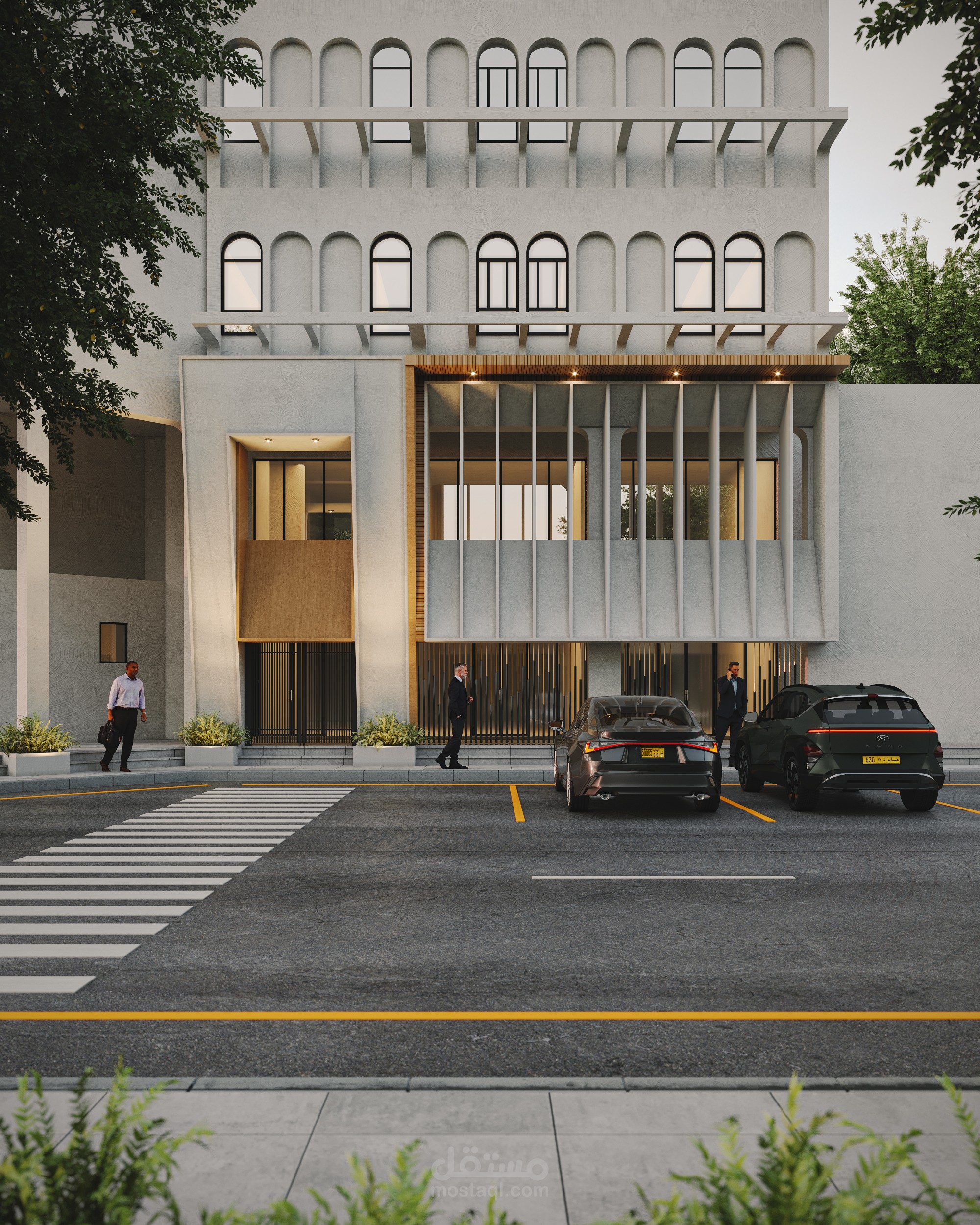 إعادة تصميم واجهة مبنى تجاري في مسقط بأسلوب معماري حديث يهدف إلى تعزيز الهوية البصرية وجذب الانتباه.