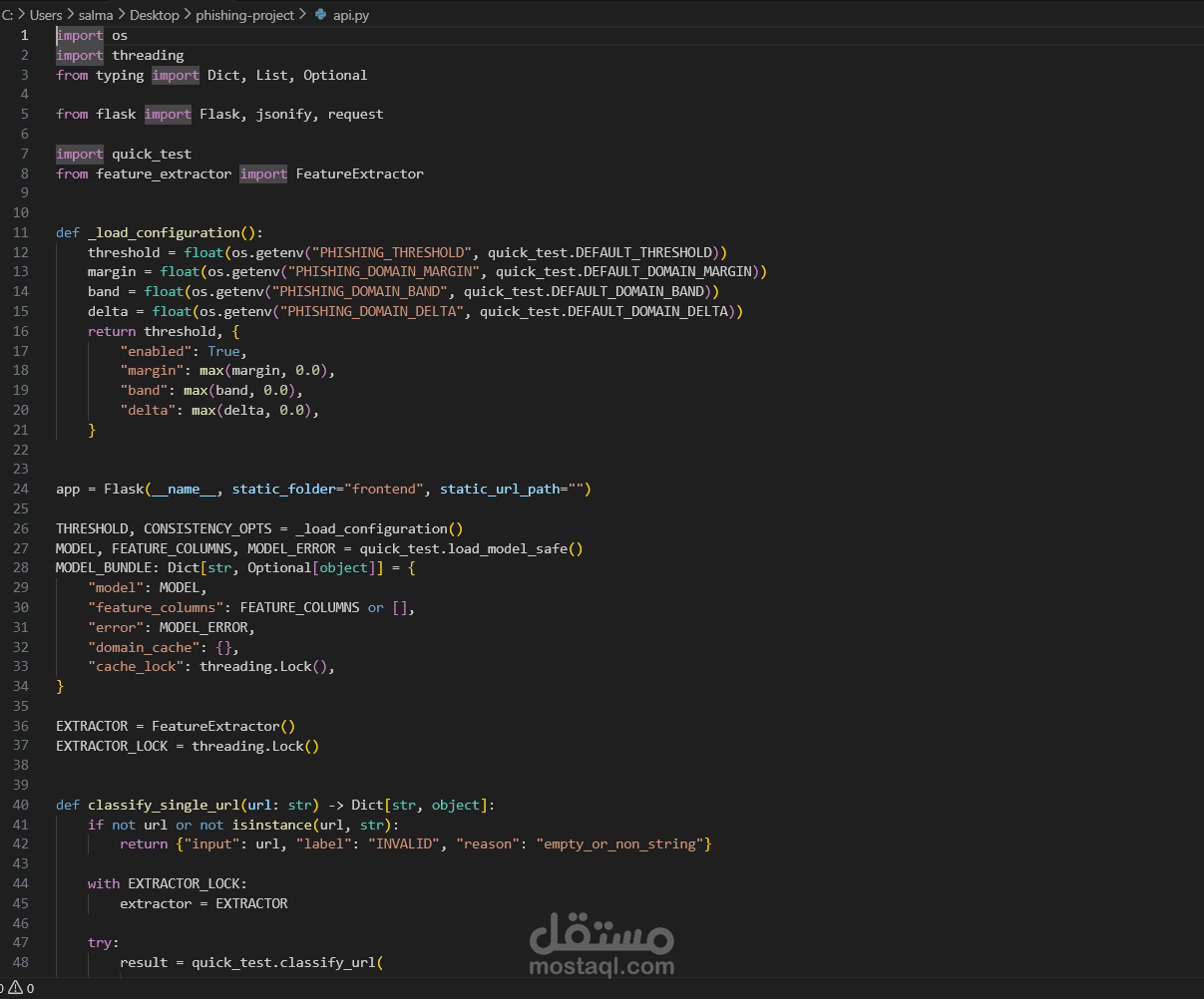 كما تضمن تنفيذ المشروع عدة مراحل عملية، شملت تحليل مشكلة التصيد الاحتيالي من منظور تقني، وتجميع وتجهيز البيانات الخاصة بالروابط، وتنفيذ مراحل المعالجة المسبقة واستخراج الخصائص، ثم تدريب ومقارنة النماذج المختلفة لاختيار النموذج الأمثل، وأخيرًا تطوير نظام متكامل يربط النموذج بواجهة استخدام تفاعلية مع اختبار الأداء وتحسين دقة النتائج.