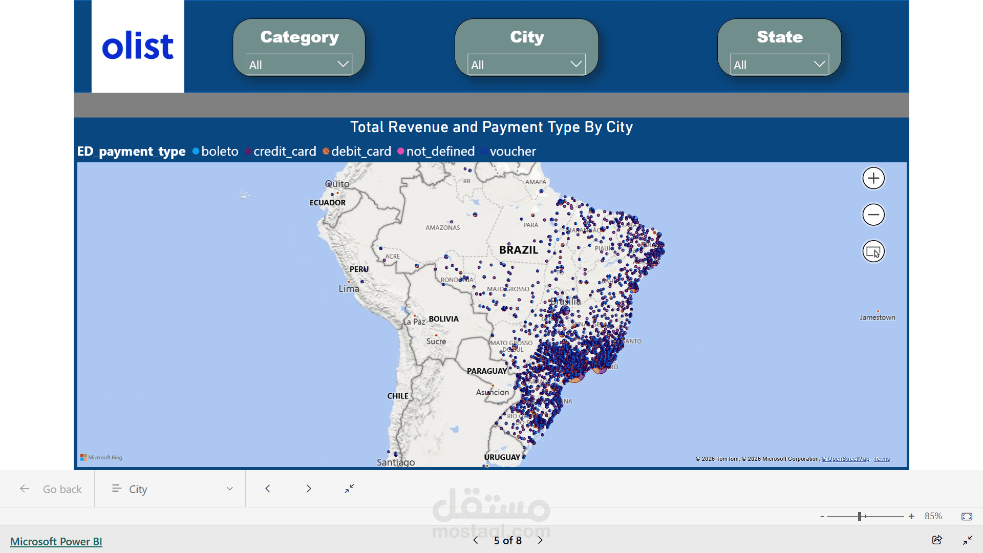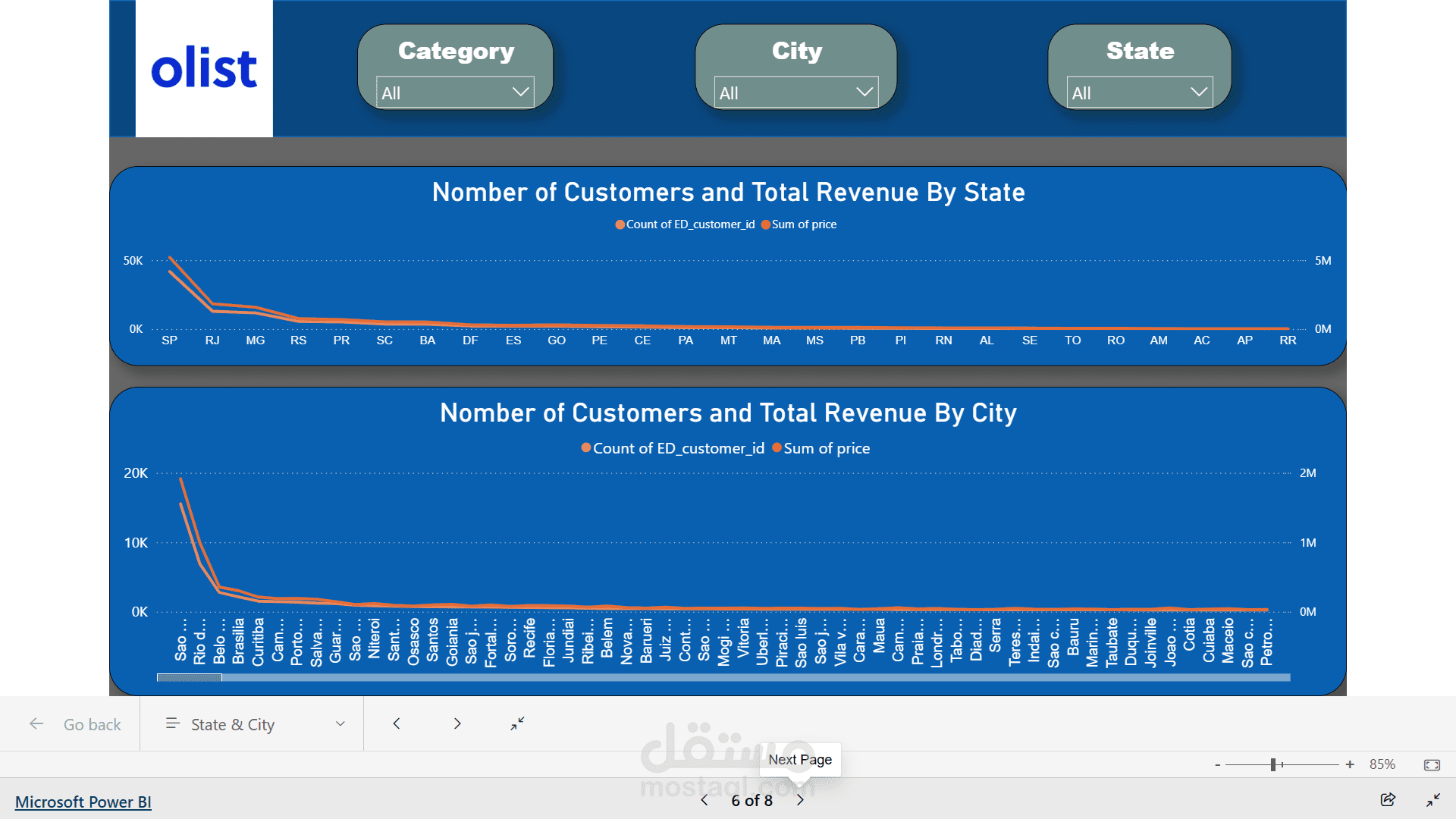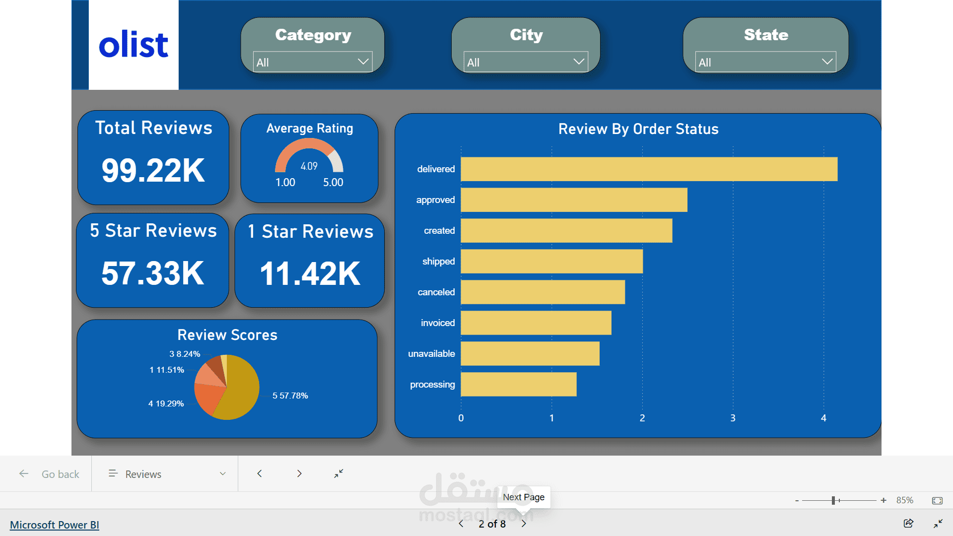 I started with **data cleaning and transformation** using SQL and Power BI, where I handled missing values, standardized data types, and built a well-structured data model by defining relationships between orders, customers, products, payments, and reviews tables.