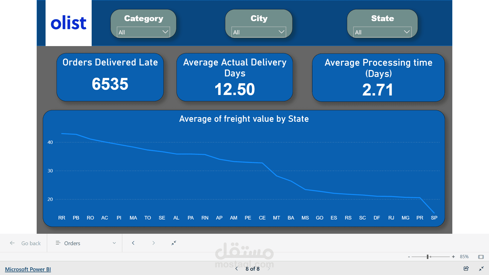 I also applied DAX calculations to measure shipping delays, average delivery time, and order approval duration, which helped highlight operational bottlenecks in the order fulfillment process