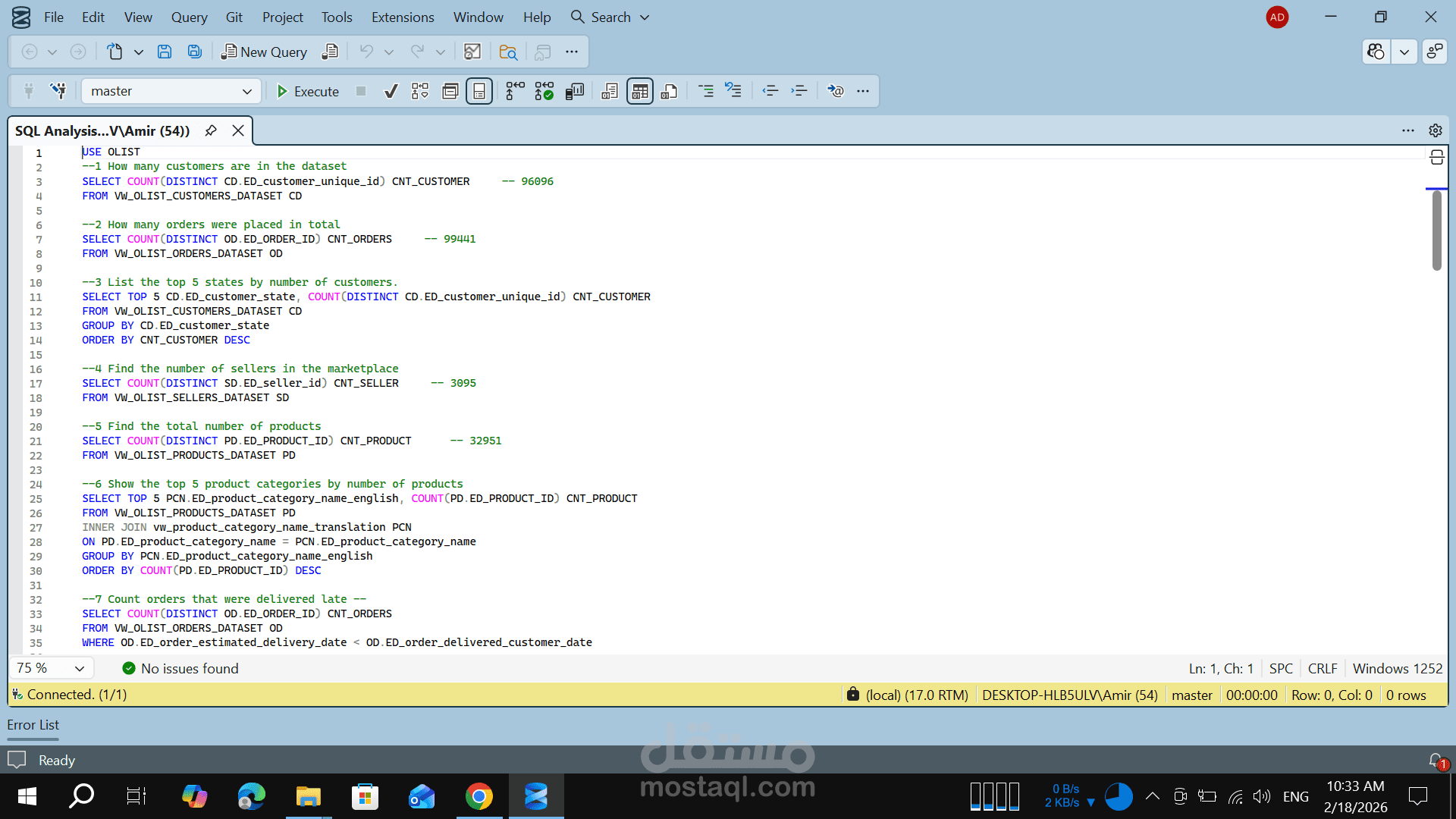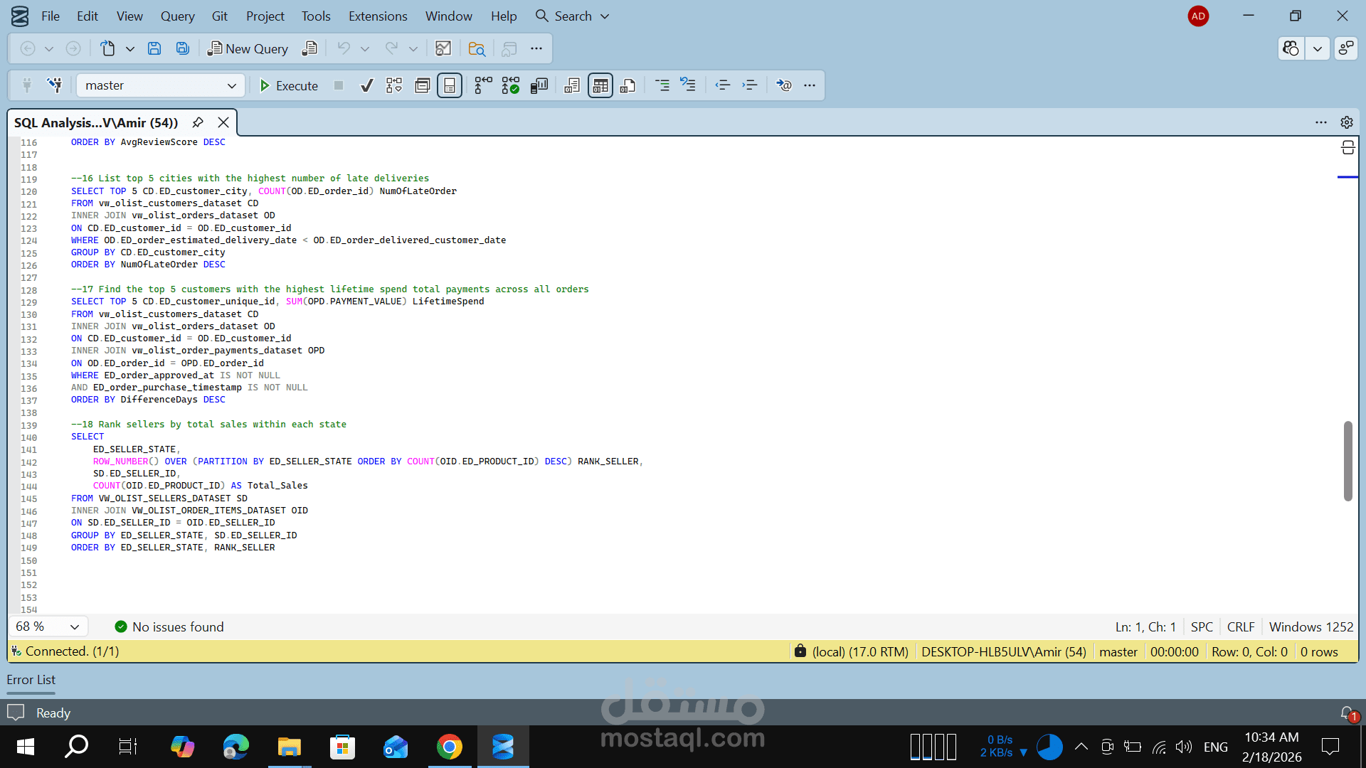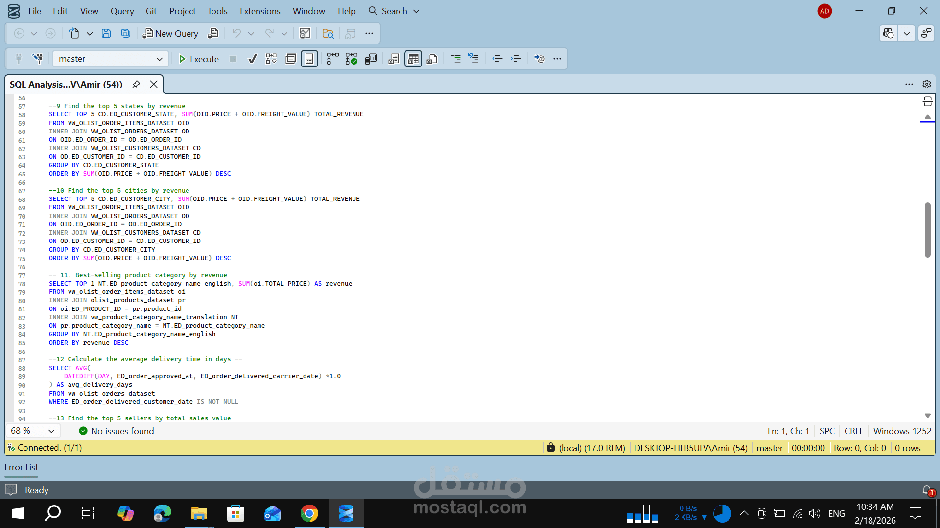 In this project, I performed an end-to-end data analysis on the Olist Brazilian E-commerce dataset to extract actionable business insights and evaluate sales performance, customer behavior, and operational efficiency.