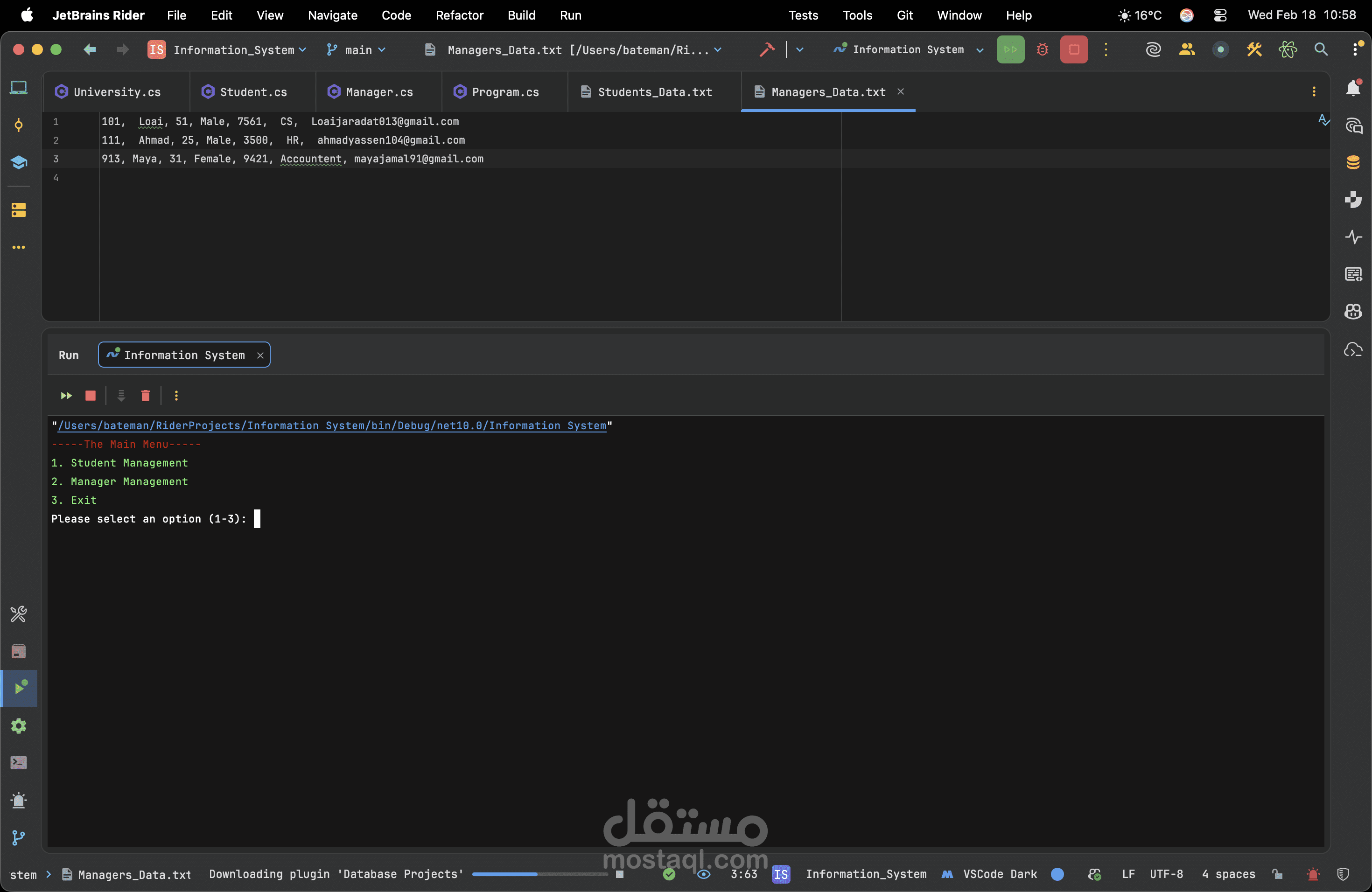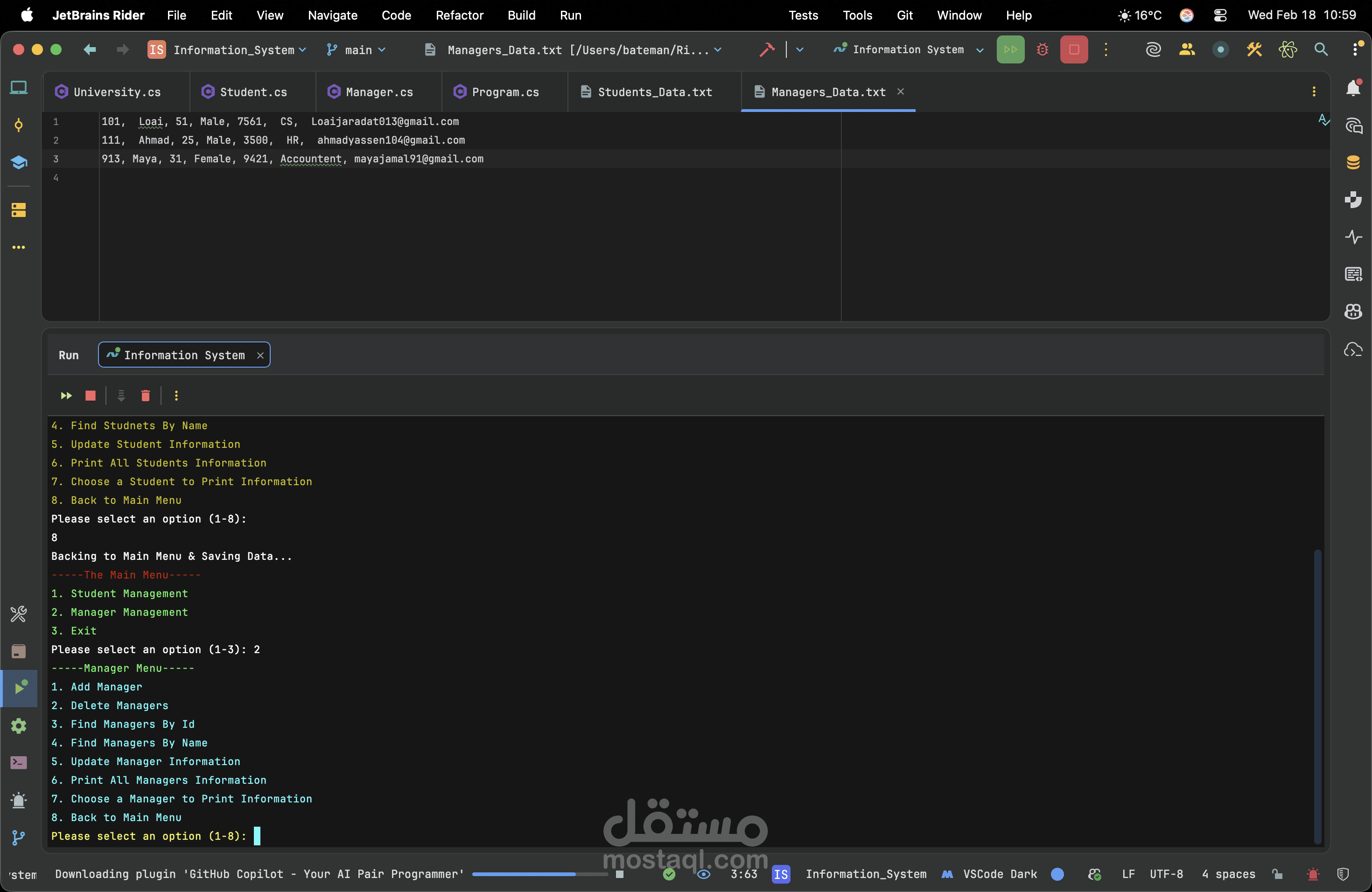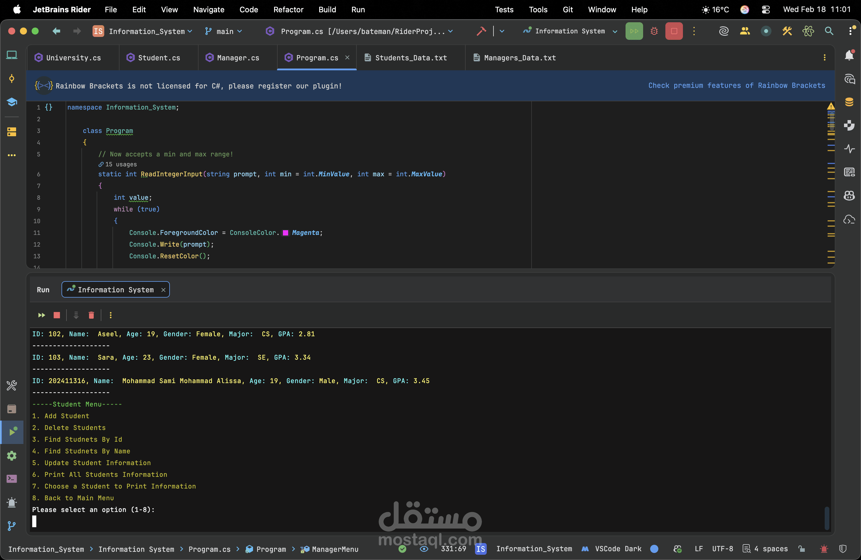 A robust console application developed in C# utilizing the .NET framework to efficiently manage student records. This project demonstrates my ability to build logical backend systems through a clean Object-Oriented architecture. By implementing core OOP concepts such as encapsulation and utilizing generic collections for dynamic CRUD operations, the system ensures optimal data handling. Furthermore, I integrated advanced search algorithms and comprehensive error handling to guarantee smooth, crash-free performance. Ultimately, this project highlights my dedication to writing readable, maintainable code and solving real-world management problems effectively.