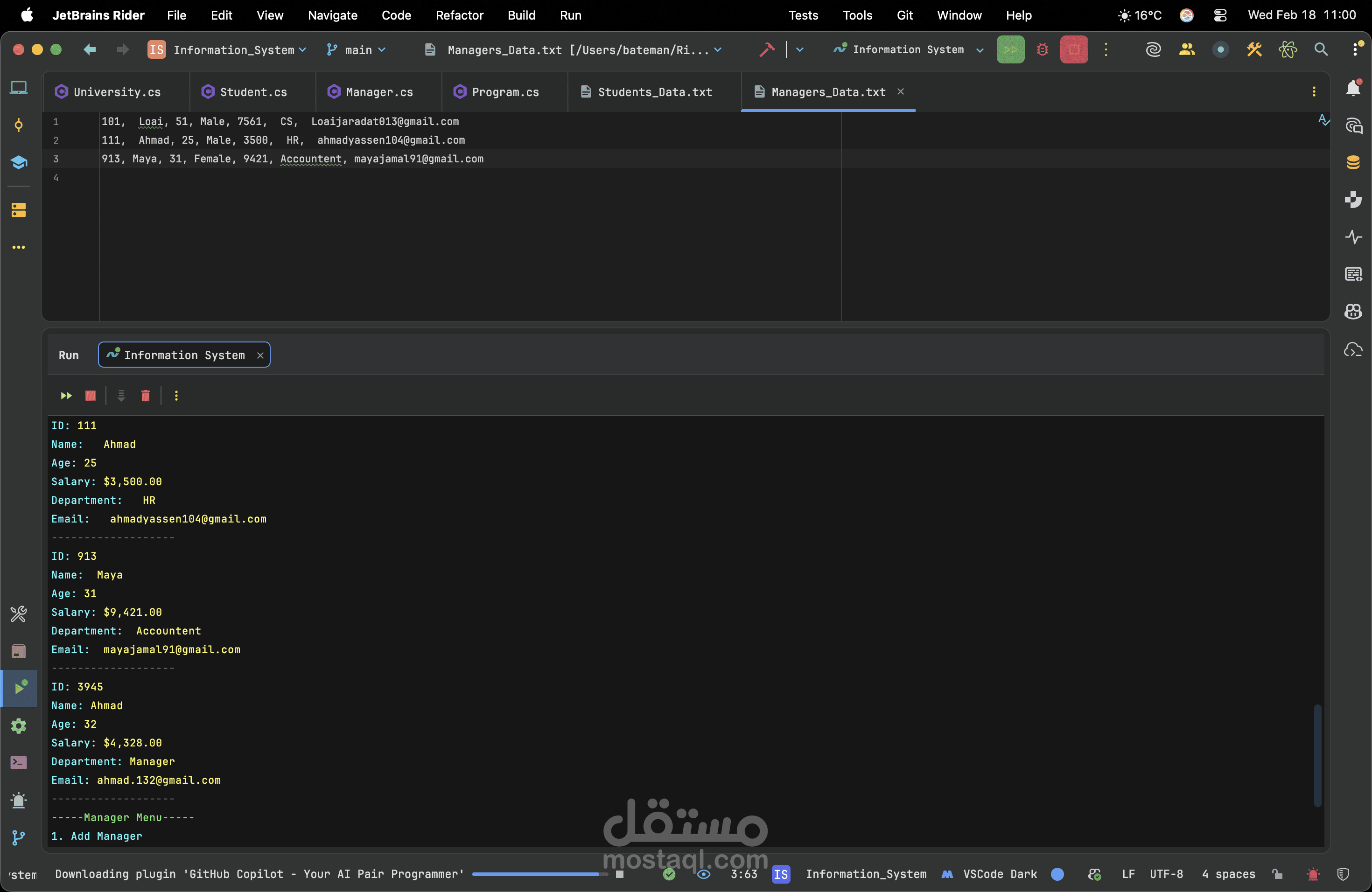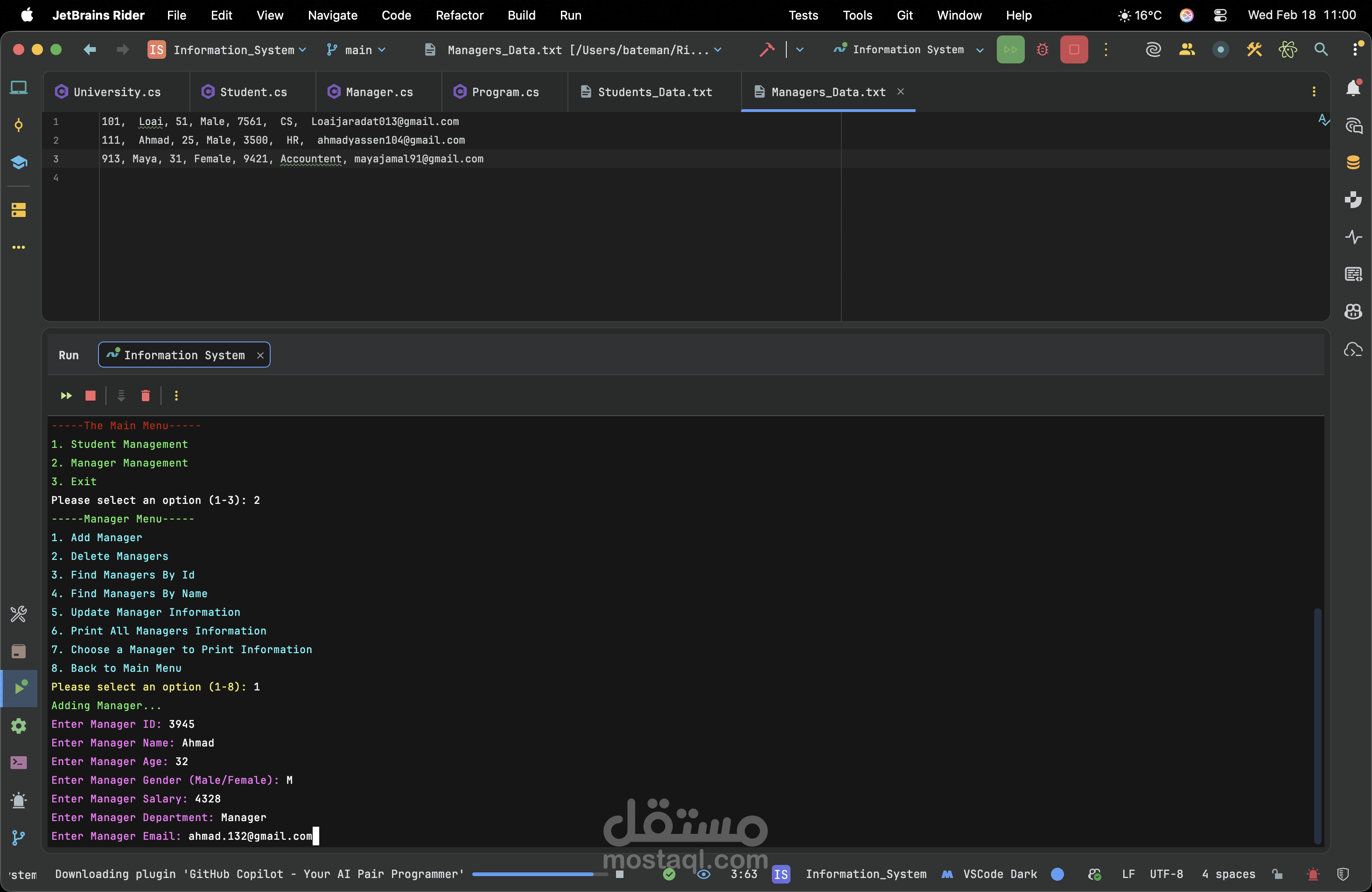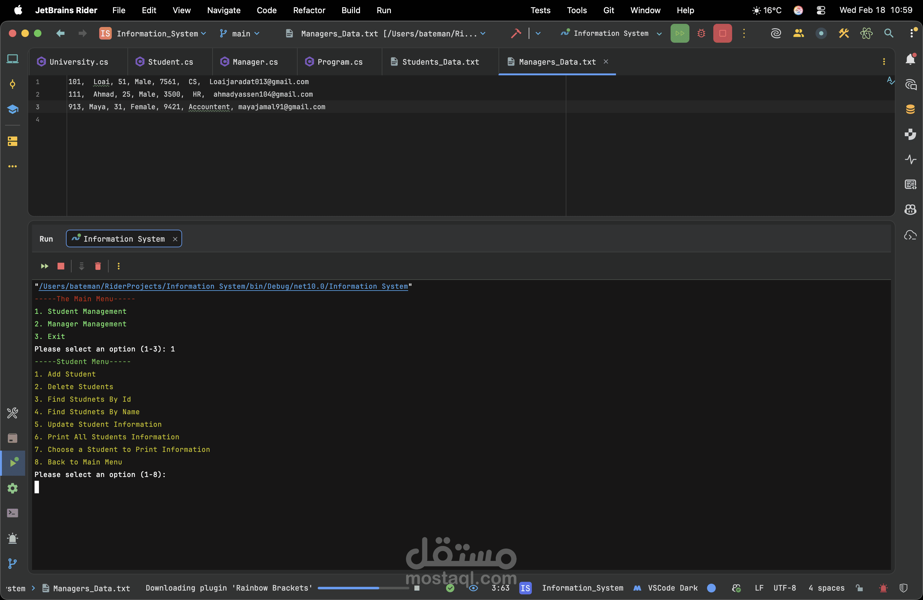 A robust console application developed in C# utilizing the .NET framework to efficiently manage student records. This project demonstrates my ability to build logical backend systems through a clean Object-Oriented architecture. By implementing core OOP concepts such as encapsulation and utilizing generic collections for dynamic CRUD operations, the system ensures optimal data handling. Furthermore, I integrated advanced search algorithms and comprehensive error handling to guarantee smooth, crash-free performance. Ultimately, this project highlights my dedication to writing readable, maintainable code and solving real-world management problems effectively.