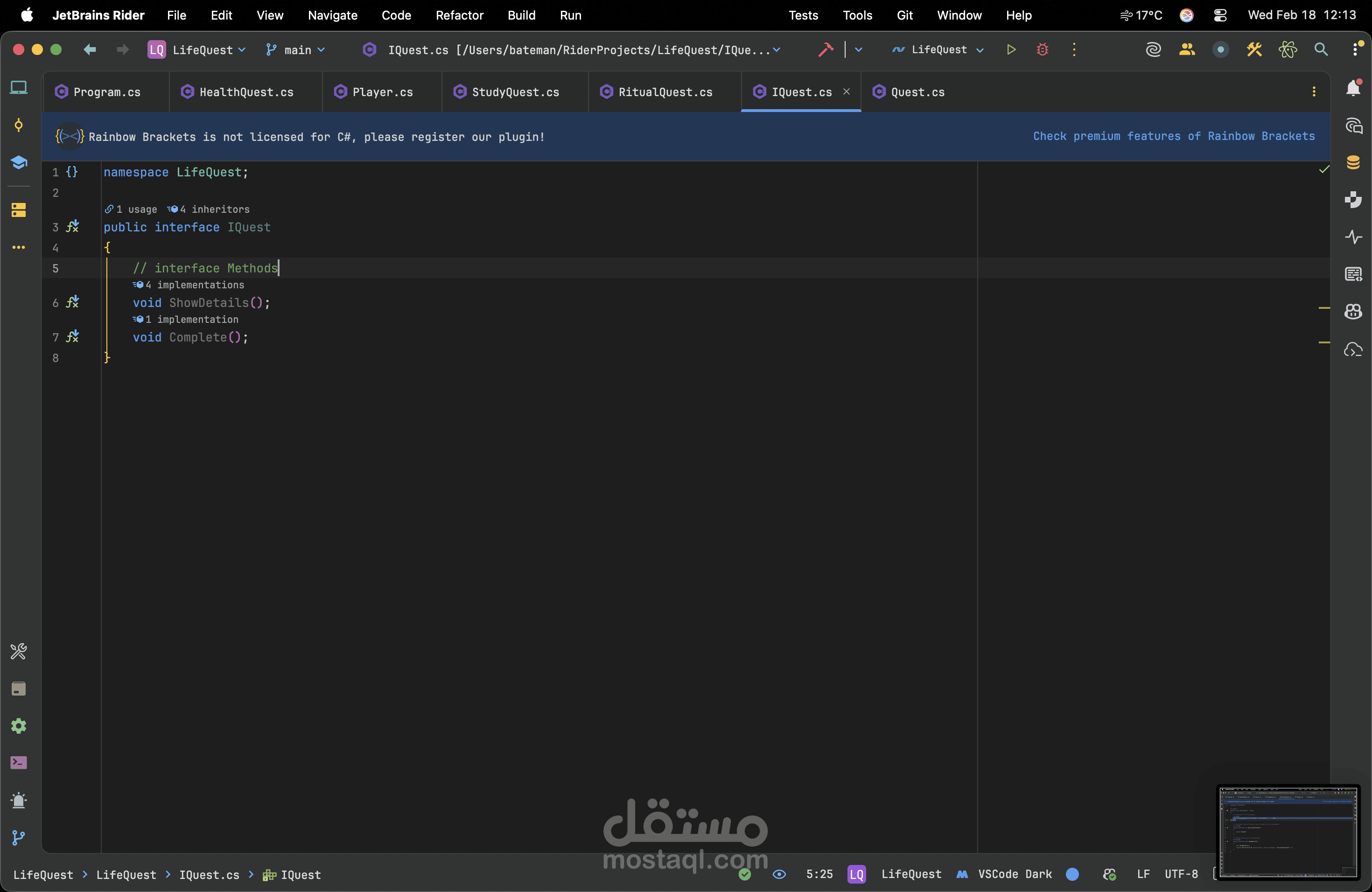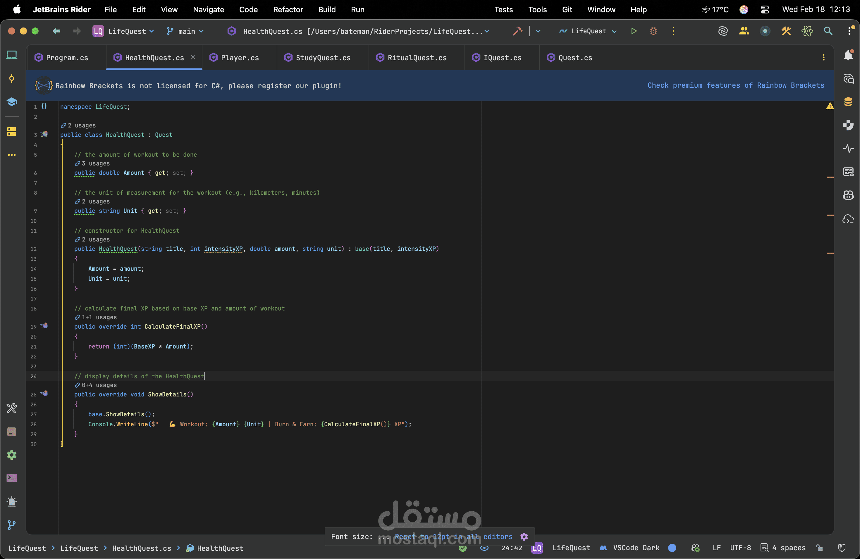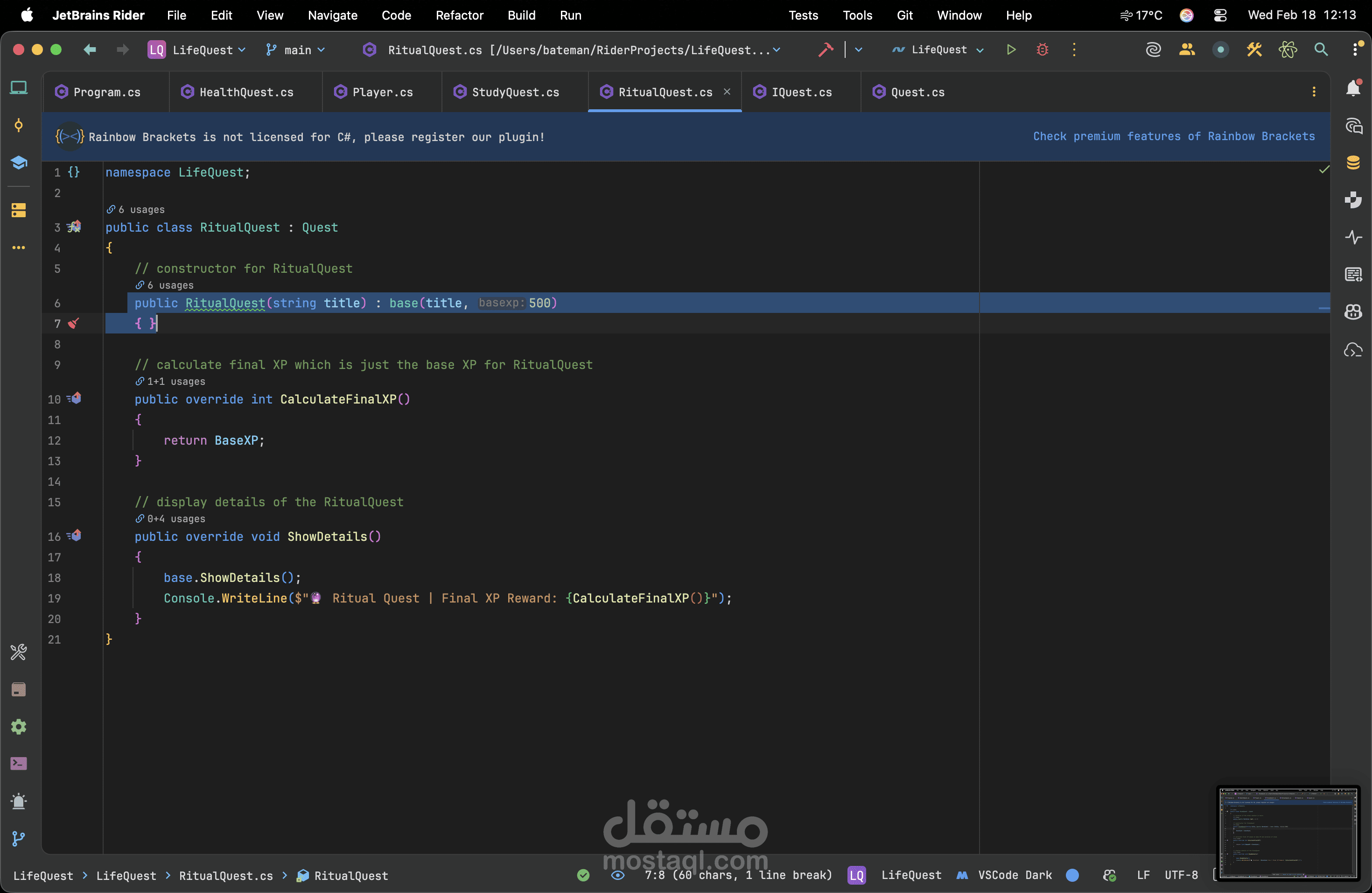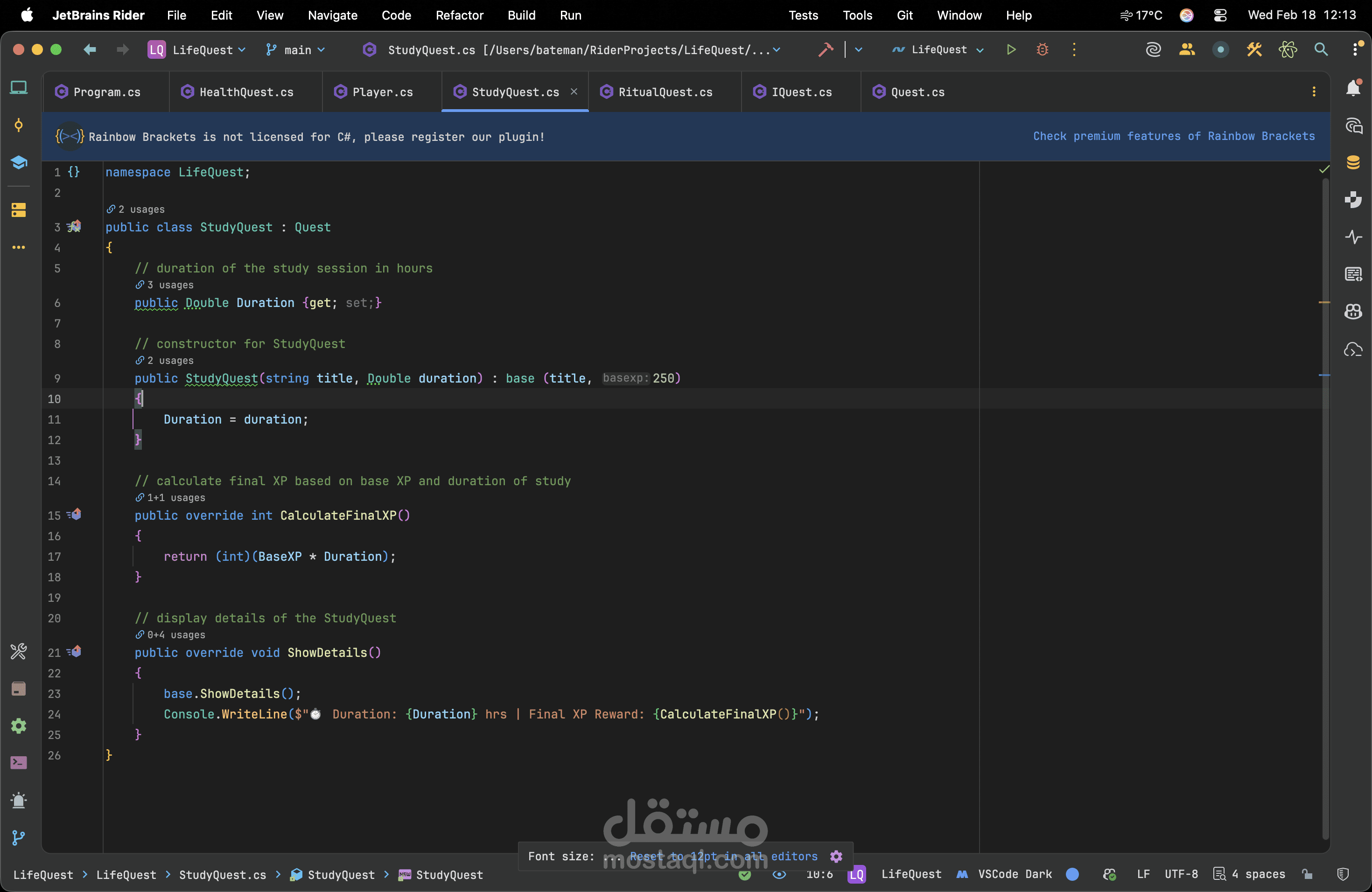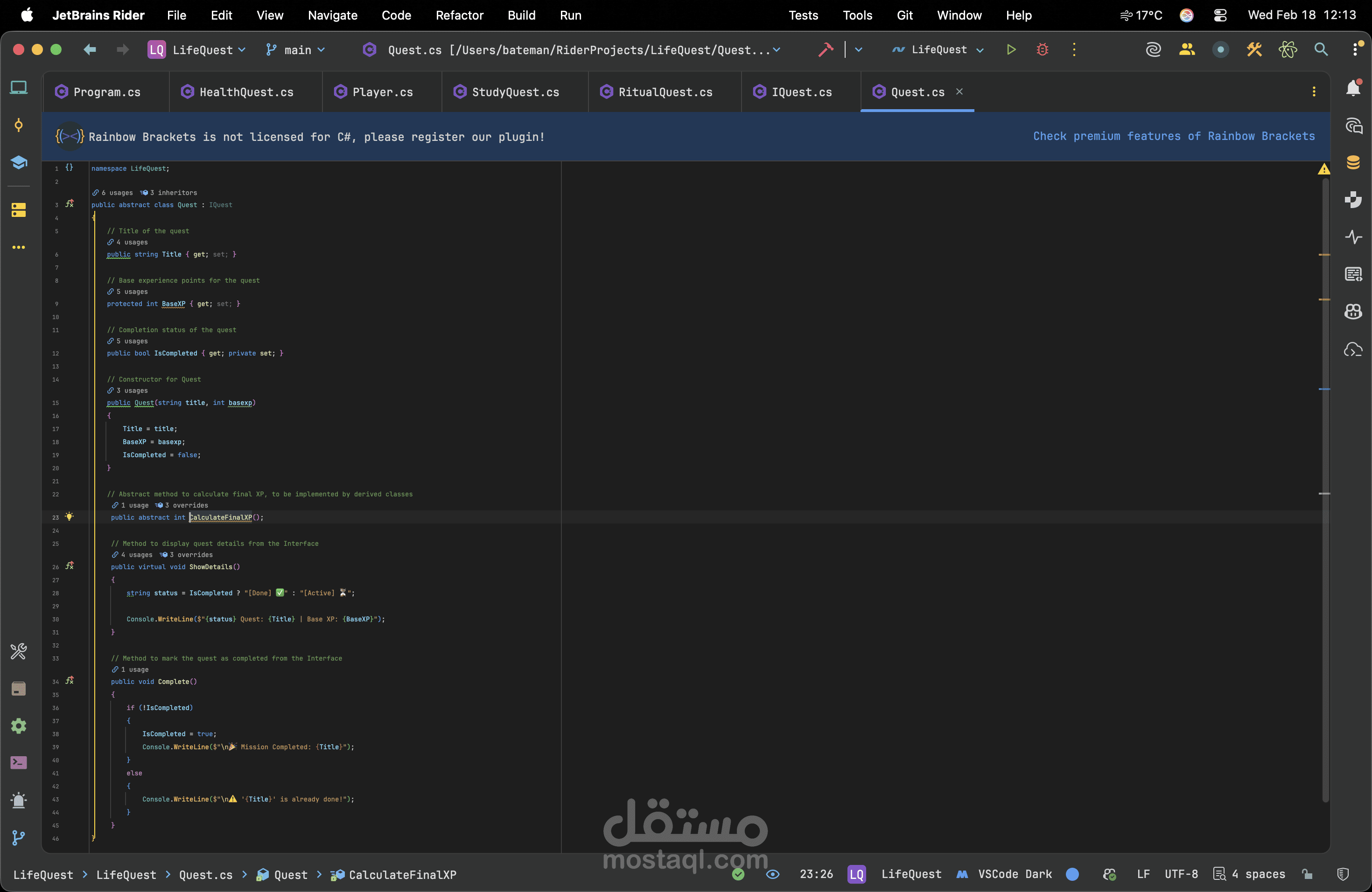 A creative C# application built on the .NET Core framework designed to transform daily routines into an interactive RPG-style experience. The system is architected entirely on Object-Oriented Programming principles to ensure long-term scalability and maintainability. Instead of relying on simple procedural logic, I implemented a polymorphic architecture featuring a base class alongside specialized derived classes, allowing for the seamless addition of new features without modifying the core codebase. By utilizing core concepts such as inheritance, polymorphism, and encapsulation, the project achieves a clean separation of concerns between player mechanics and quest logic. Ultimately, the application simulates engaging game dynamics through a robust system that tracks progress and handles level progression based on real-world task completion.