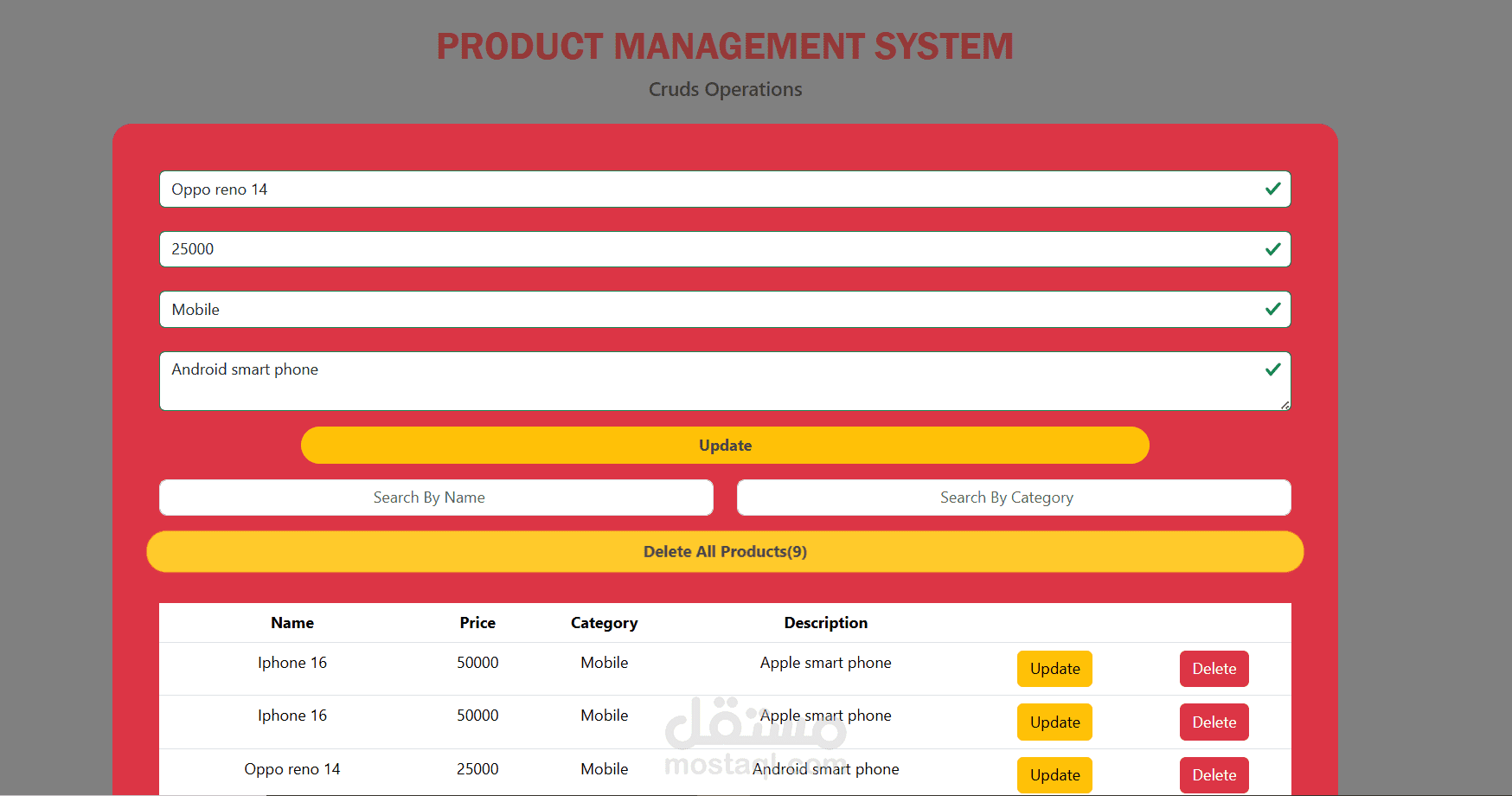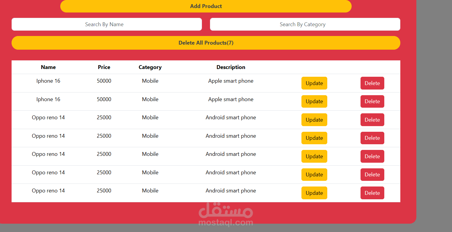 • قمت ببناء تطبيق ويب لإدارة المنتجات مستجيب مع وظائف CRUD كاملة لإضافة وتحديث وحذف والبحث عن المنتجات.