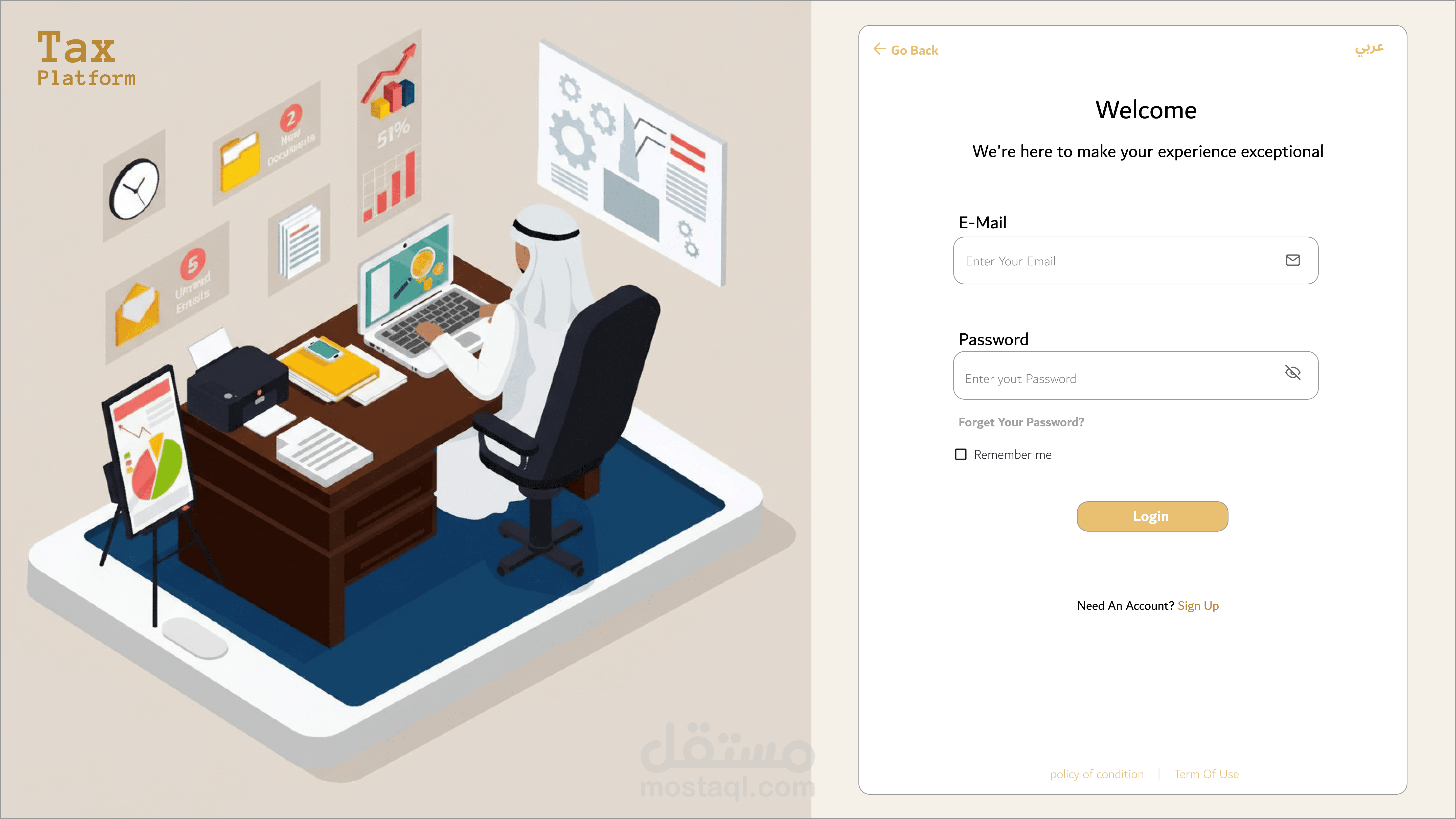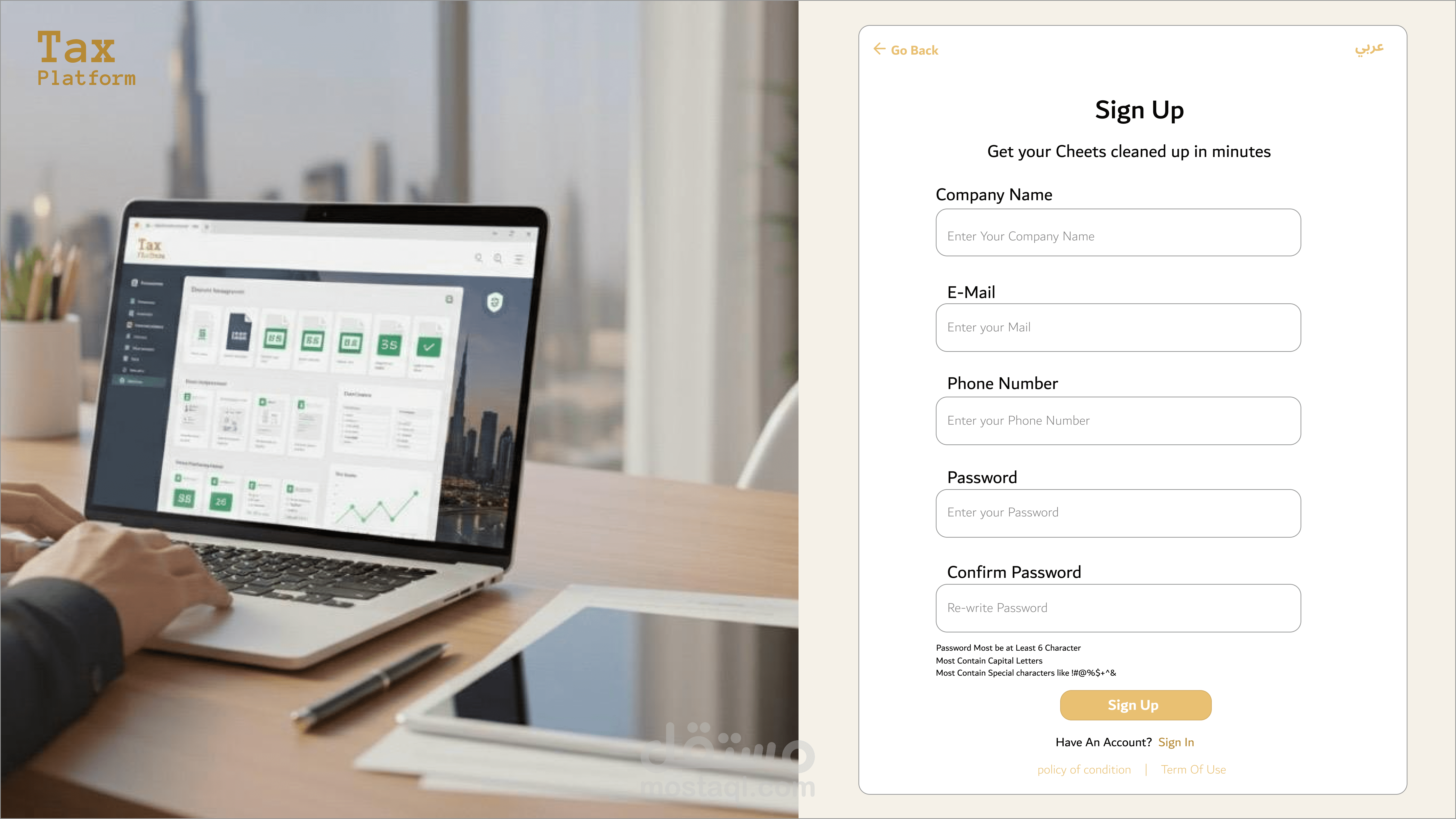 _نظام وصول آمن ومنظم: ابتكار نماذج تسجيل دخول (Login) واشتراك (Sign-up) توازن بين طلب البيانات الحساسة وسهولة الإكمال، لضمان تجربة مستخدم سريعة وخالية من التعقيد.