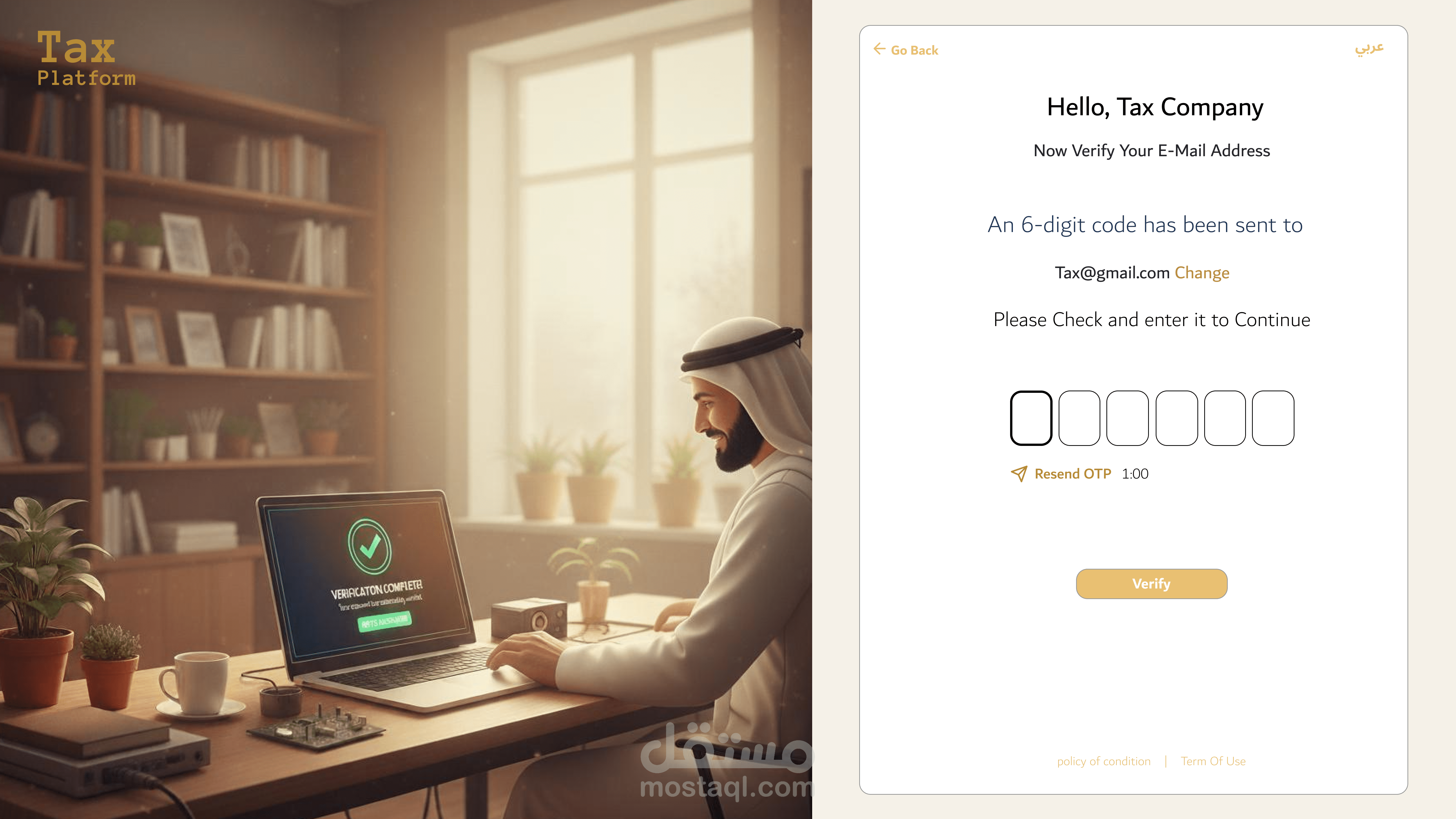 هذا العمل هو جزء من مشروع ضخم ومتكامل قمت بتصميمه لخدمة قطاع الضرائب والتدقيق المالي. أركز في هذا العرض التقديمي على المرحلة التأسيسية للمشروع، والتي تشمل واجهات التعريف (Splash Screens) ورحلة تسجيل الدخول والاشتراك، حيث تم بناء هذه الواجهات لتكون المدخل الأساسي لمنصة مالية معقدة تتطلب أعلى معايير الدقة والثقة.