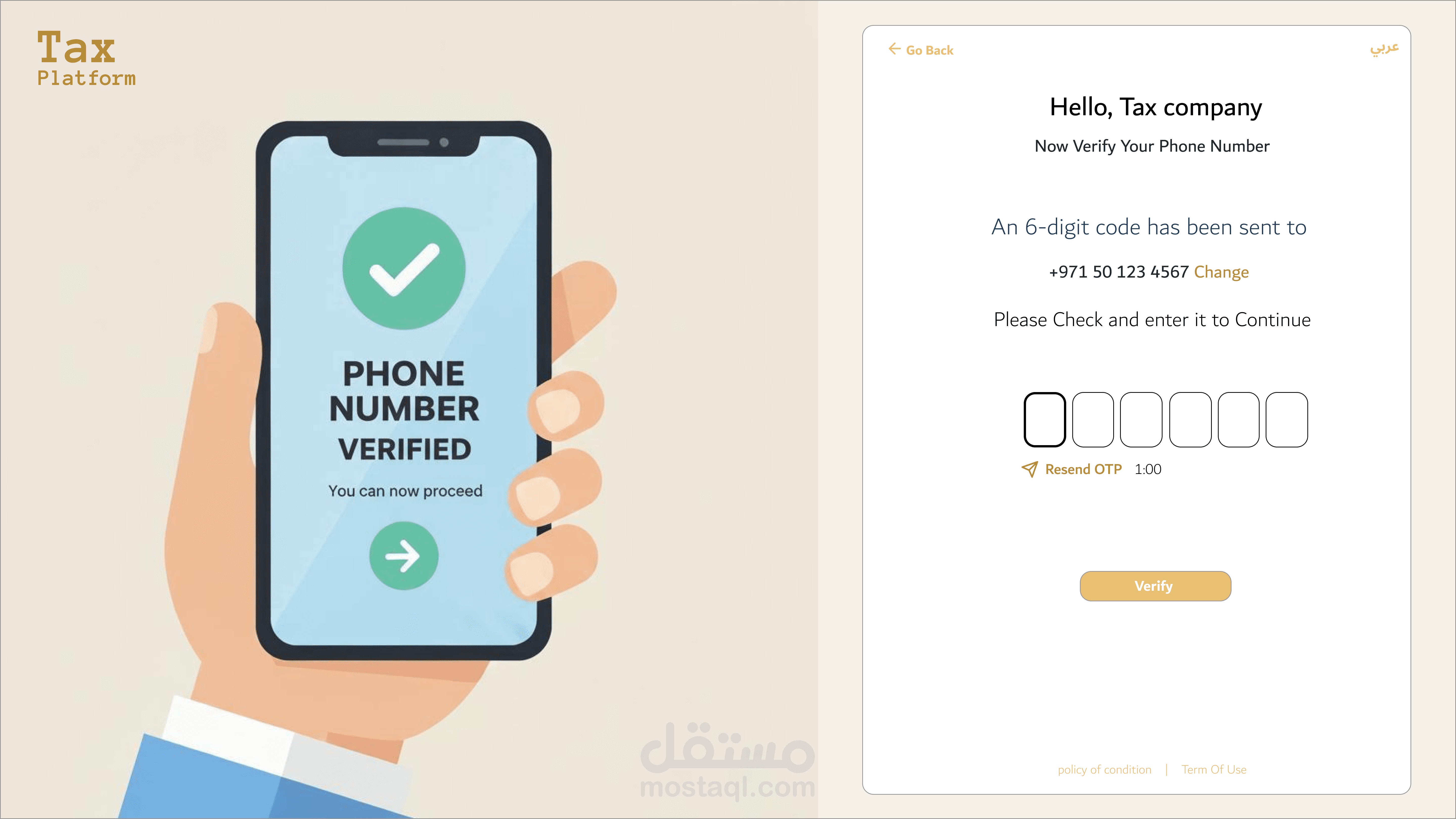 _واجهات تعريفية ذكية (Splash Screens): تصميم شاشات بصرية تشرح القيمة المضافة للمنصة وتبسط مفهوم التدقيق الضريبي للمستخدم الجديد.