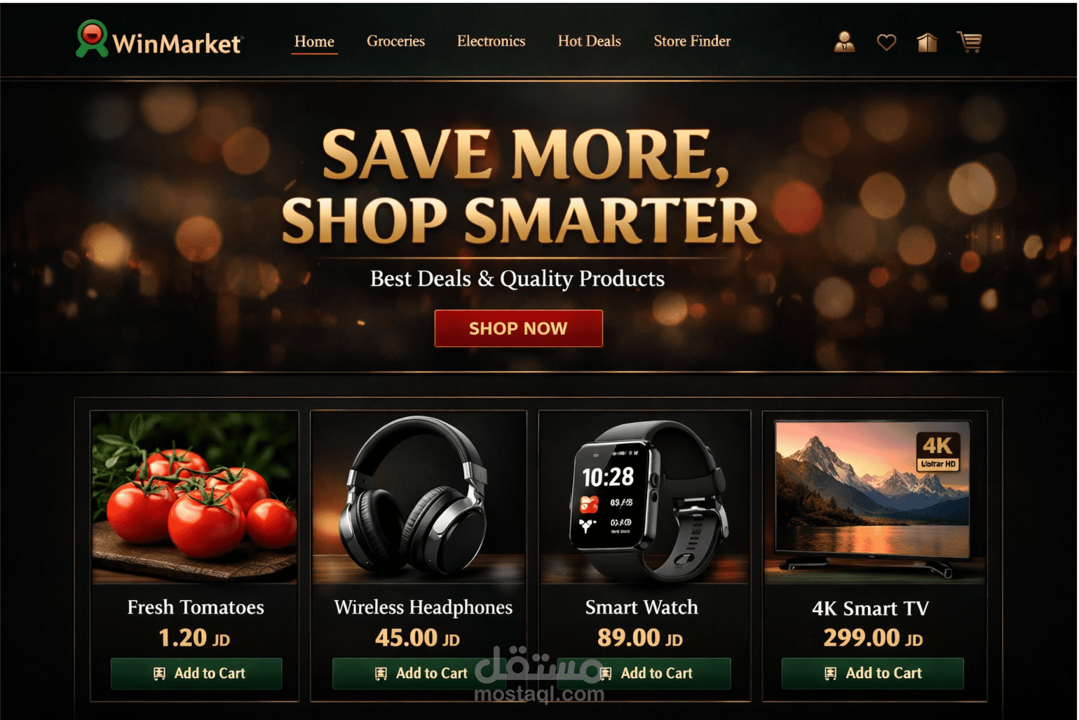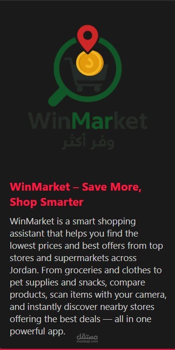 وين ماركت (WinMarket) هو منصة رقمية متطورة وتطبيق ذكي صمم ليكون الرفيق الأمثل للمستهلك في الأردن يهدف المشروع إلى إحداث ثورة في تجربة التسوق اليومي من خلال تمكين المستخدمين من العثور على أقل الأسعار وأفضل العروض المتاحة في كبرى المتاجر والأسواق المركزية (السوبر ماركت) في جميع أنحاء المملكة.