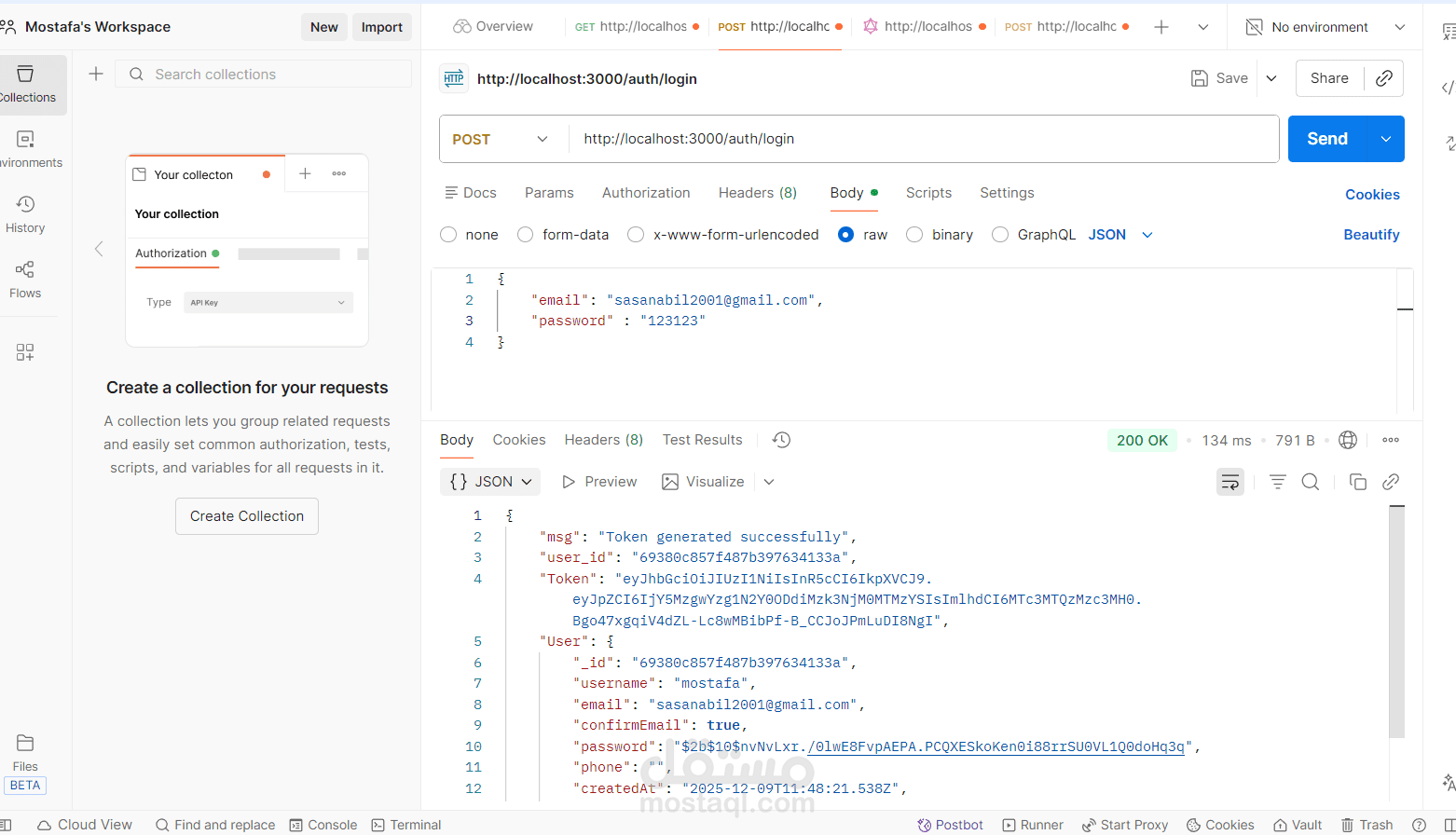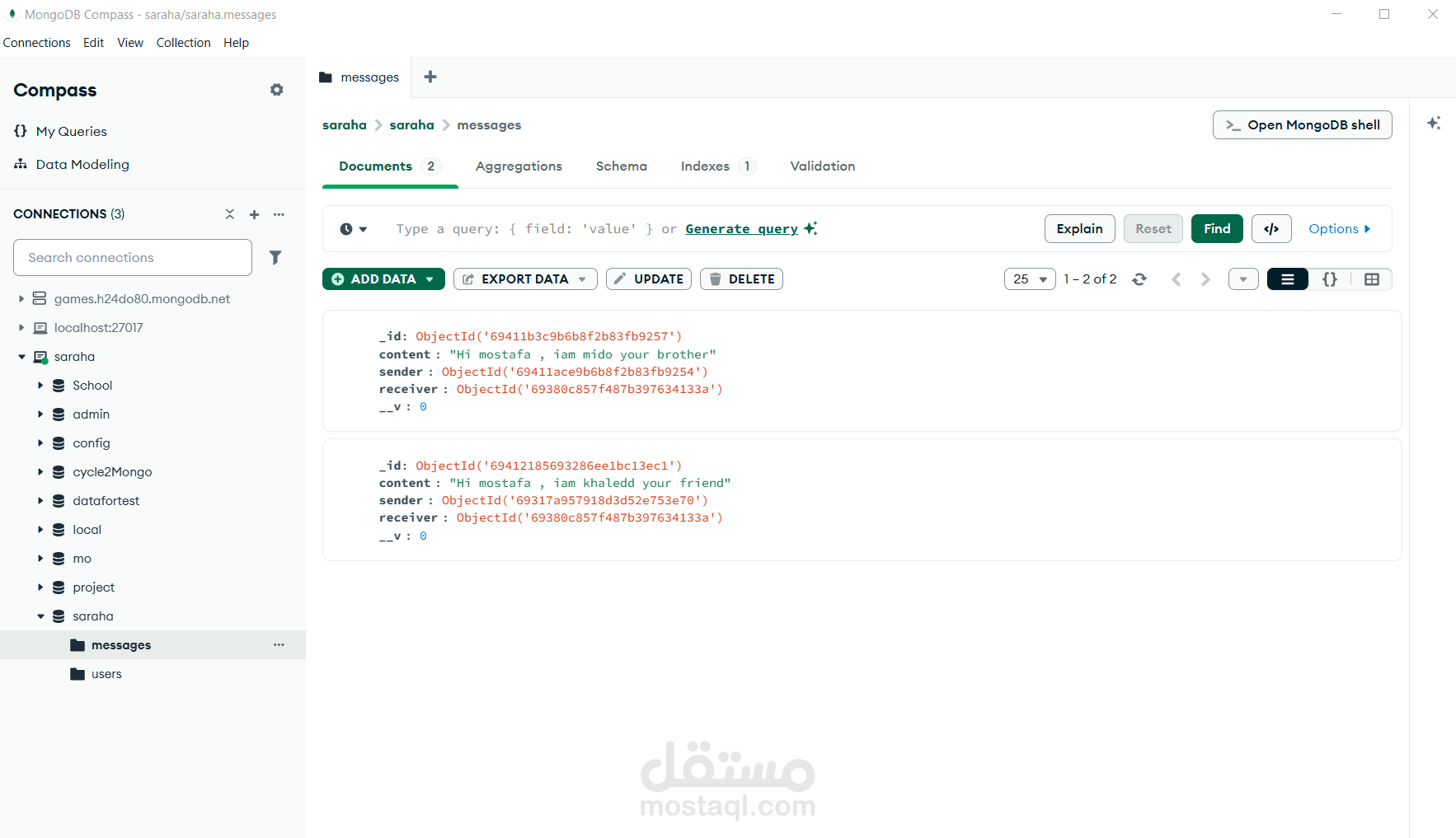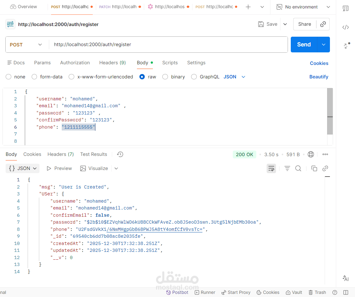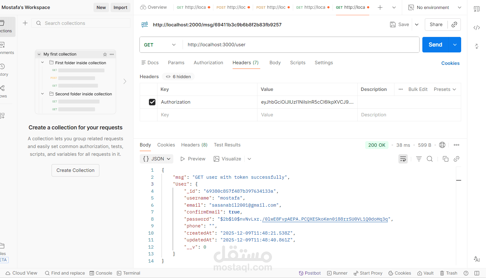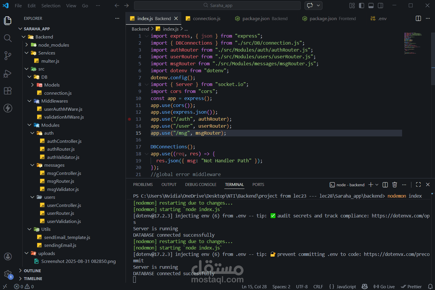 - أنشأت نقاط نهاية CRUD للرسائل ودمجت Multer لتحميل الملفات (صور الملف الشخصي والمرفقات).