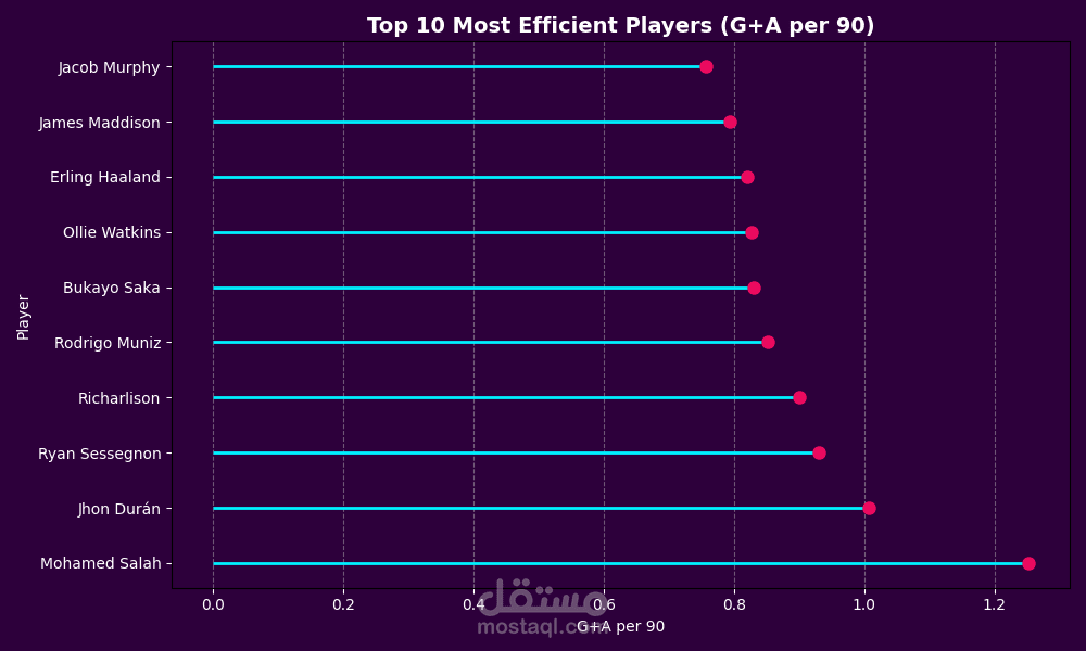حساب مؤشر الكفاءة الهجومية (Goals + Assists per 90) لقياس التأثير الحقيقي لكل لاعب بغض النظر عن عدد الدقائق.