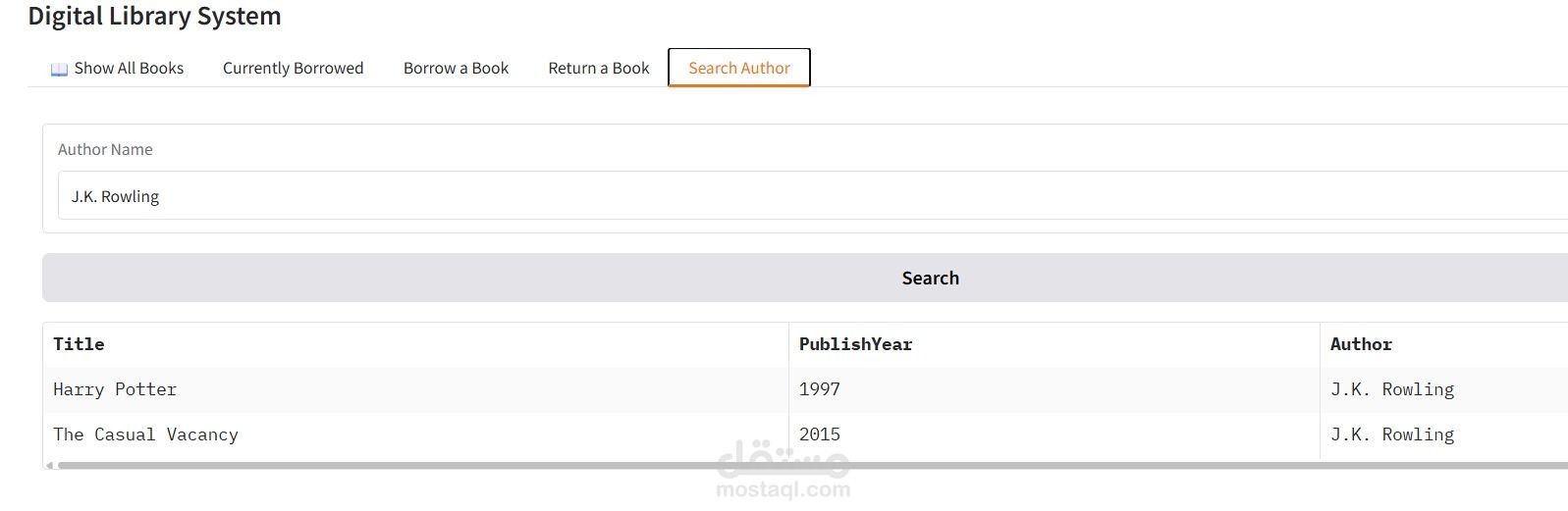 * Use of SQL aggregate queries (e.g., most borrowed author, currently borrowed books)