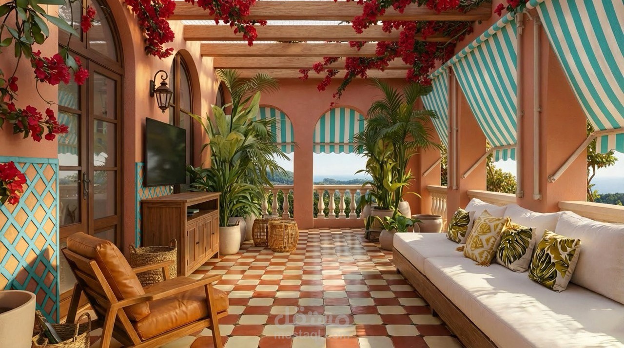 The Balcony: A Mediterranean-style escape with terracotta tiles, striped awnings, and lush bougainvillea, offering a seamless indoor-outdoor flow.