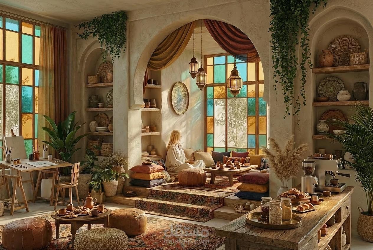 A cozy, compact apartment design blending Modern Moroccan architecture with Bohemian flair. The space is reimagined as a sanctuary for art and serenity, maximizing every square meter through clever layering and natural light.