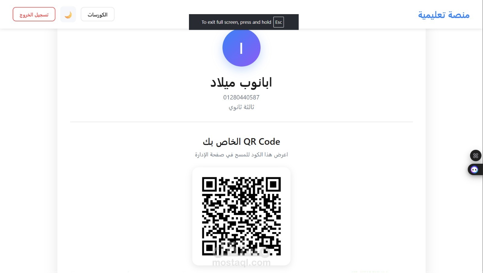 منصه تعليميه يجود بها لي كل طالب بروفيل الخاص به الكود الخاص به وي qr اقدر اسكان لي كل طالب عشان اسجلو حضور كل حصه المنصه شغاله تمام لكن لا يجود بها محتوي ويجود صفحه لي الادمن