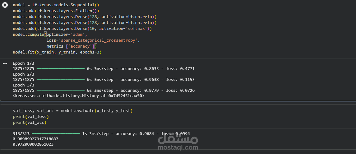 التدريب (Fit): تم تدريب النموذج لمدة 3 دورات (epochs).