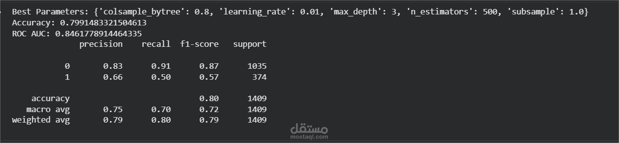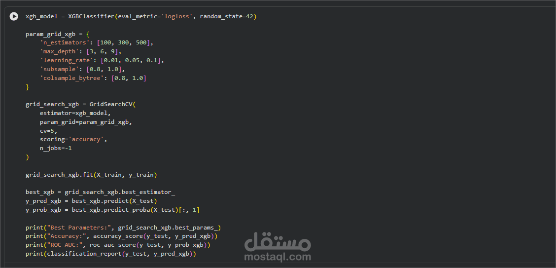 البحث عن أفضل "الإعدادات ": الكود يقوم بتجربة مجموعه كبيرة من الإعدادات المختلفة للموديل (مثل عمق الأشجار وسرعة التعلم) بشكل آلي باستخدام أداة تسمى GridSearchCV.