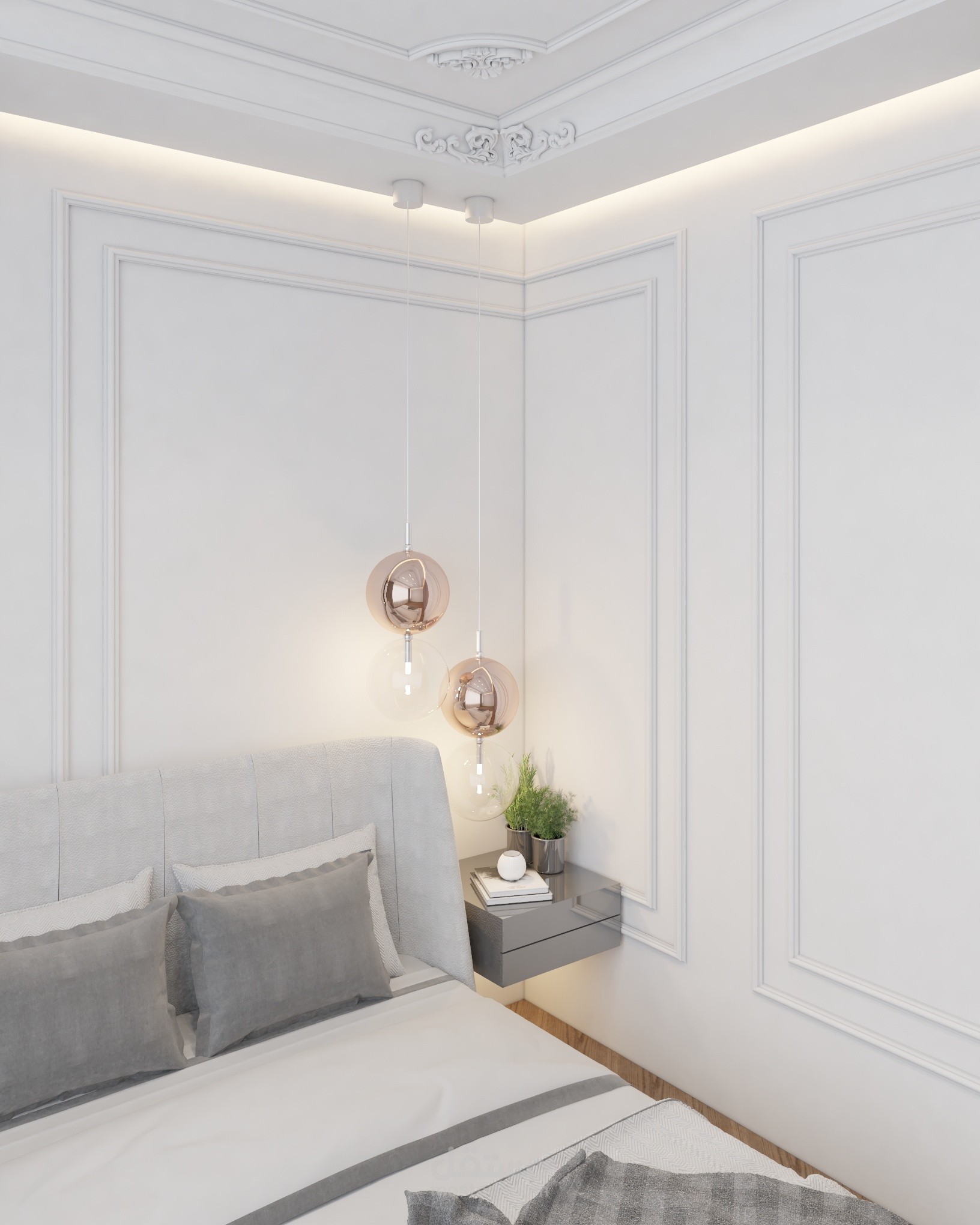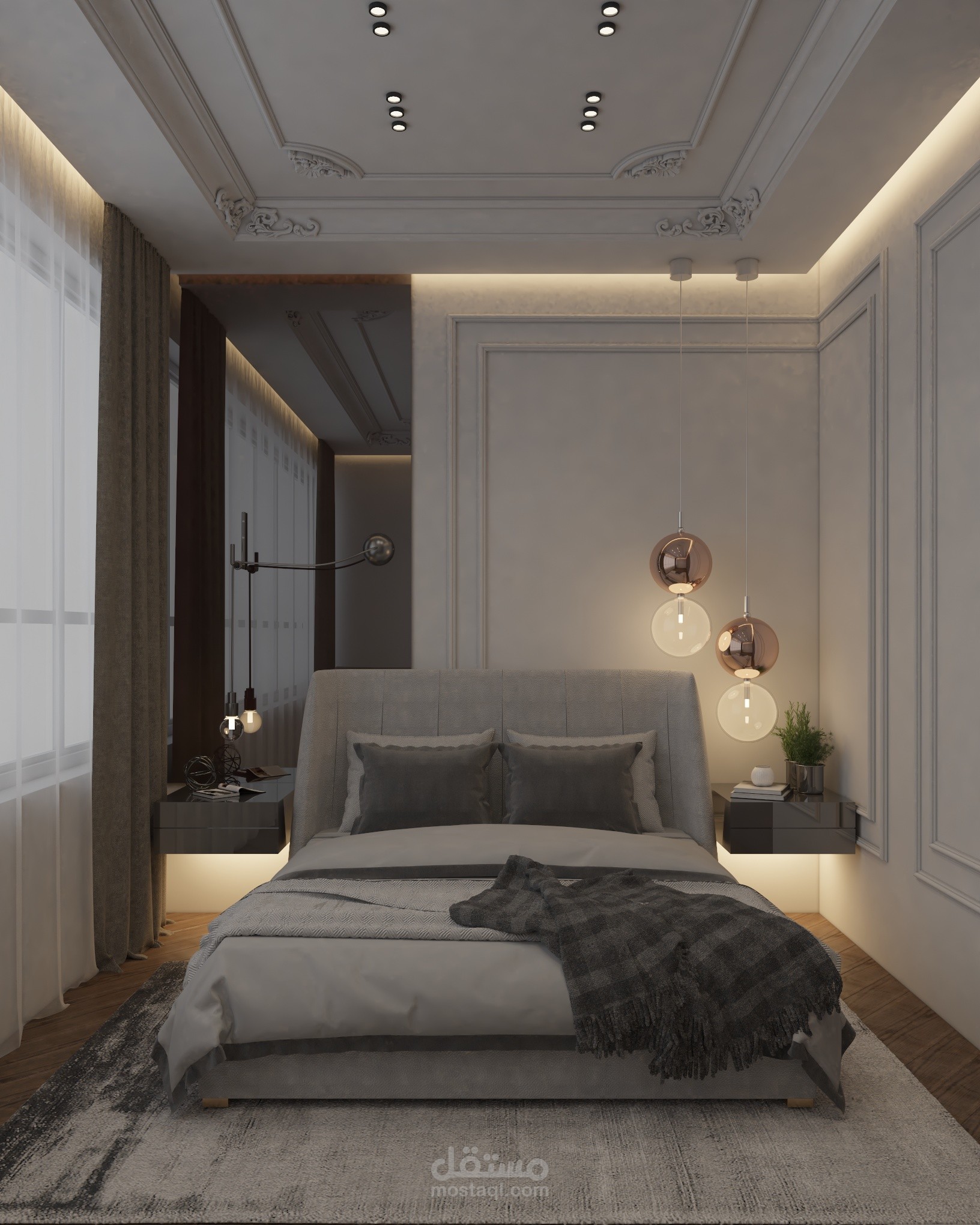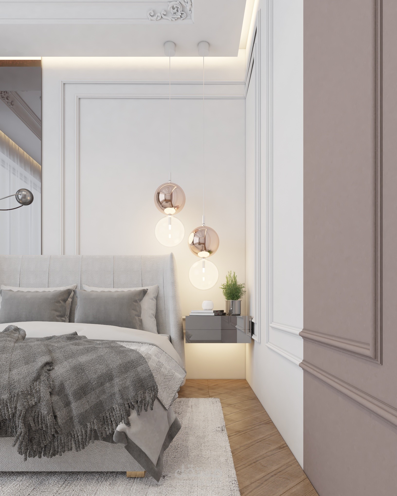 A modern bedroom designed with a calm, neutral palette that blends white, gray, and beige for a serene atmosphere. The space features clean lines, soft textures, and elegant pendant lighting that adds warmth and sophistication. The upholstered headboard serves as the room’s focal point, complemented by layered curtains that filter natural light beautifully. Wooden flooring and a large area rug enhance the cozy feel, creating a balanced and luxurious environment that reflects contemporary comfort and refined simplicity.