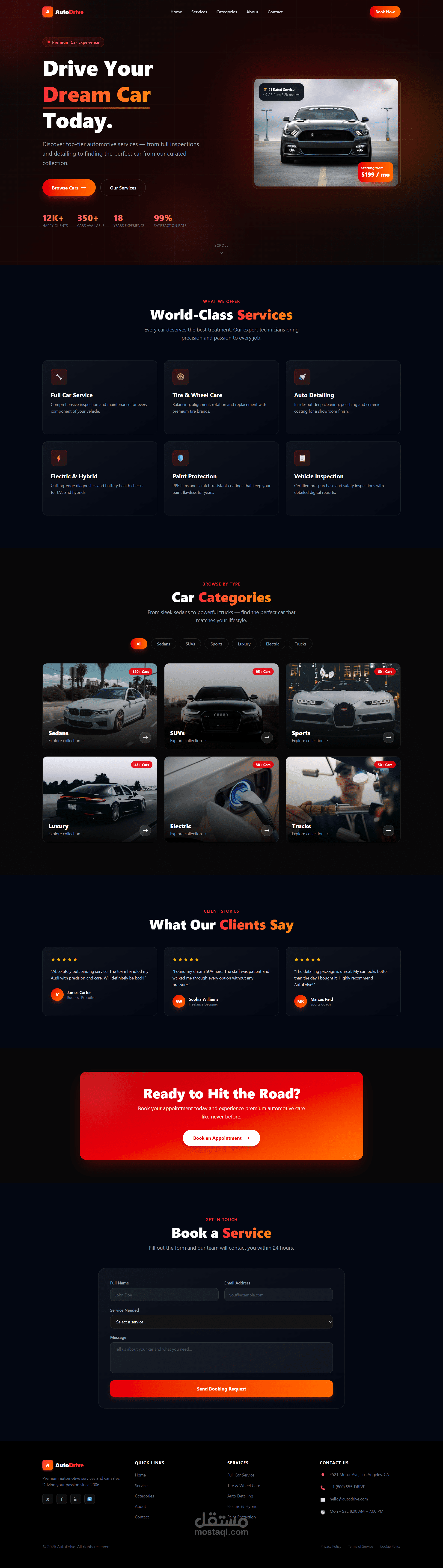 صفحة هبوط عصرية بأسلوب حديث وجريء مخصصة لمواقع خدمات وصيانة السيارات، تعتمد على تدرجات لونية دافئة (أحمر × برتقالي) مع خلفيات داكنة تمنح إحساسًا بالفخامة والطاقة والحركة.