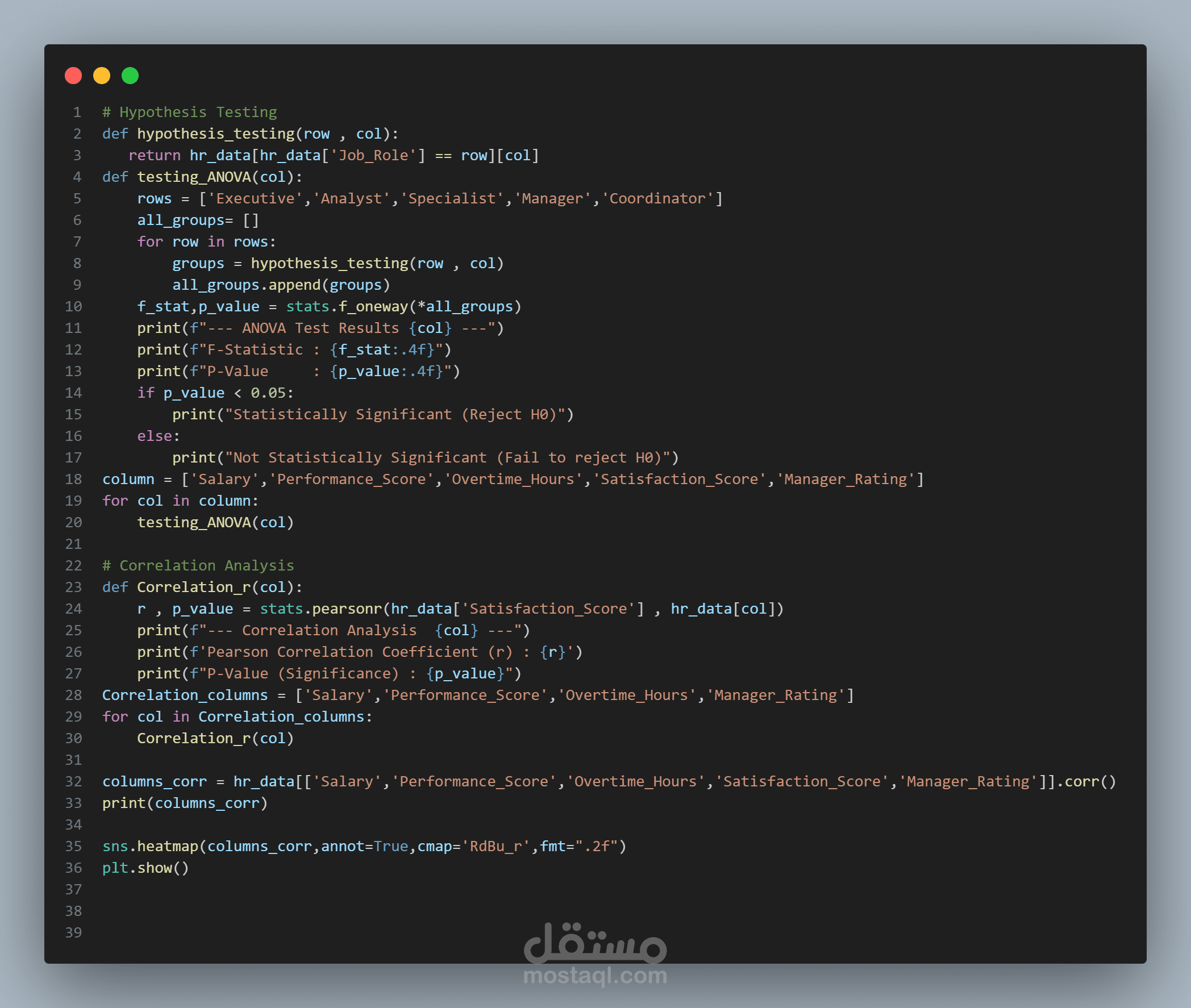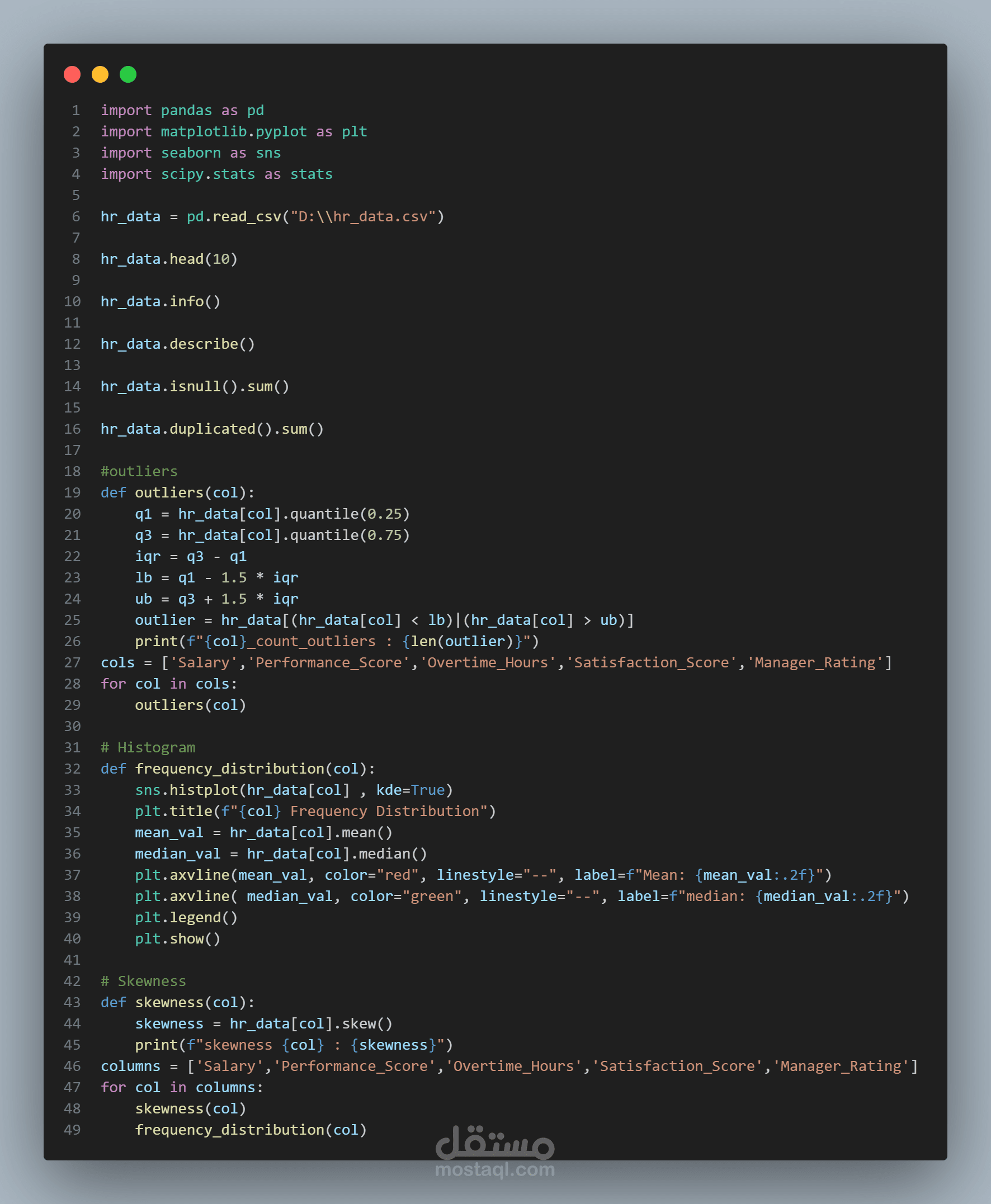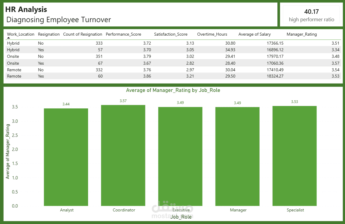 قمت بتنفيذ مشروع متكامل لتحليل بيانات الموارد البشرية بهدف فهم العوامل المؤثرة على الرضا الوظيفي واحتمالية الاستقالة، مع تقديم توصيات عملية مبنية على التحليل الإحصائي
