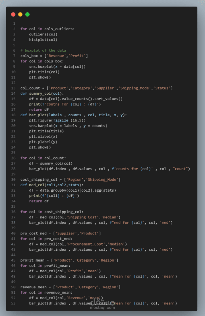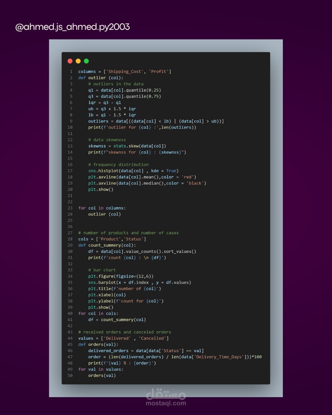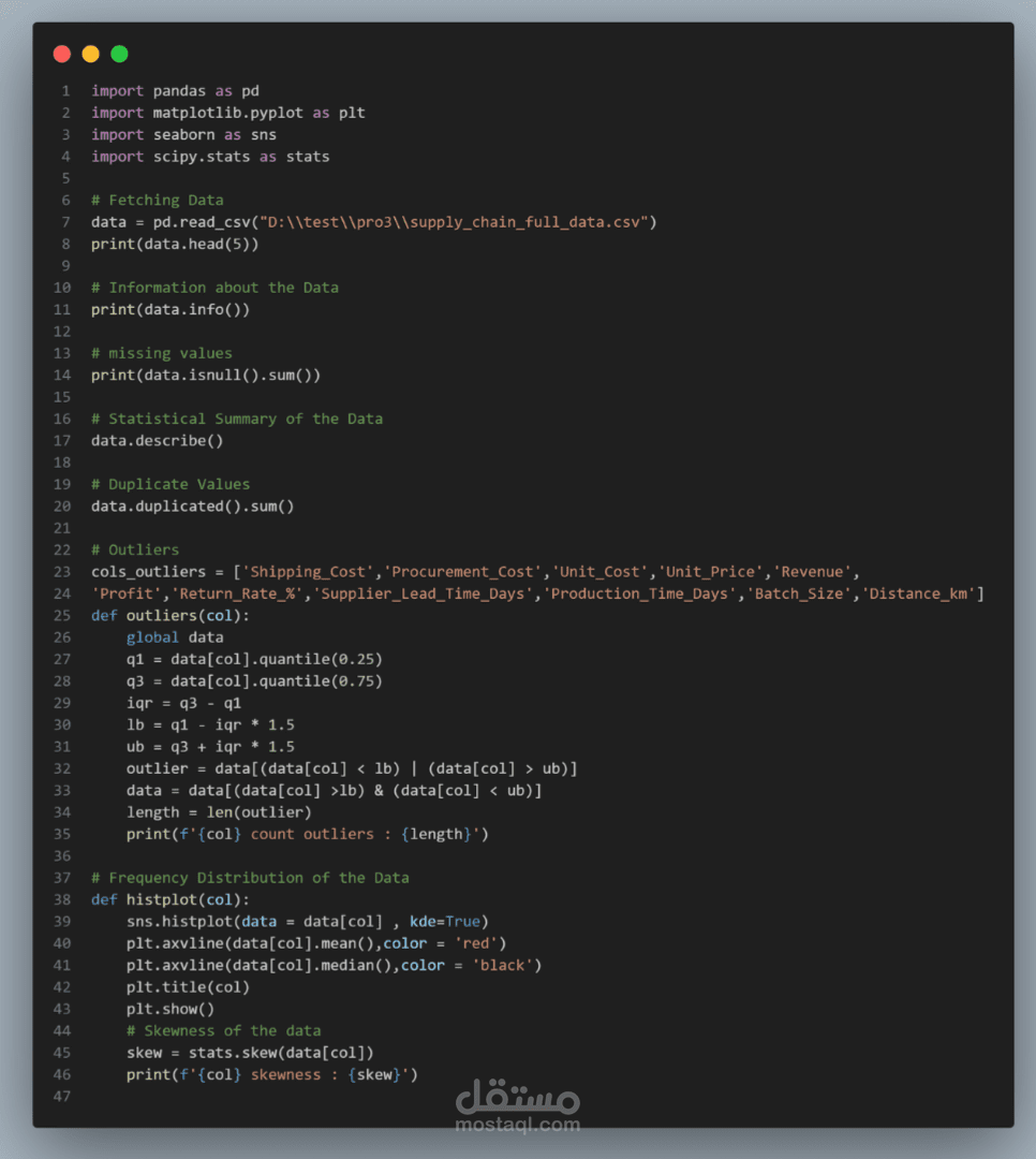 تم تنفيذ المشروع باستخدام Python (Pandas – Seaborn – Matplotlib) وشمل تحليل البيانات، معالجة القيم الشاذة، تحليل التوزيعات، دراسة العلاقات الارتباطية، واستخلاص مؤشرات أداء تشغيلية ومالية.