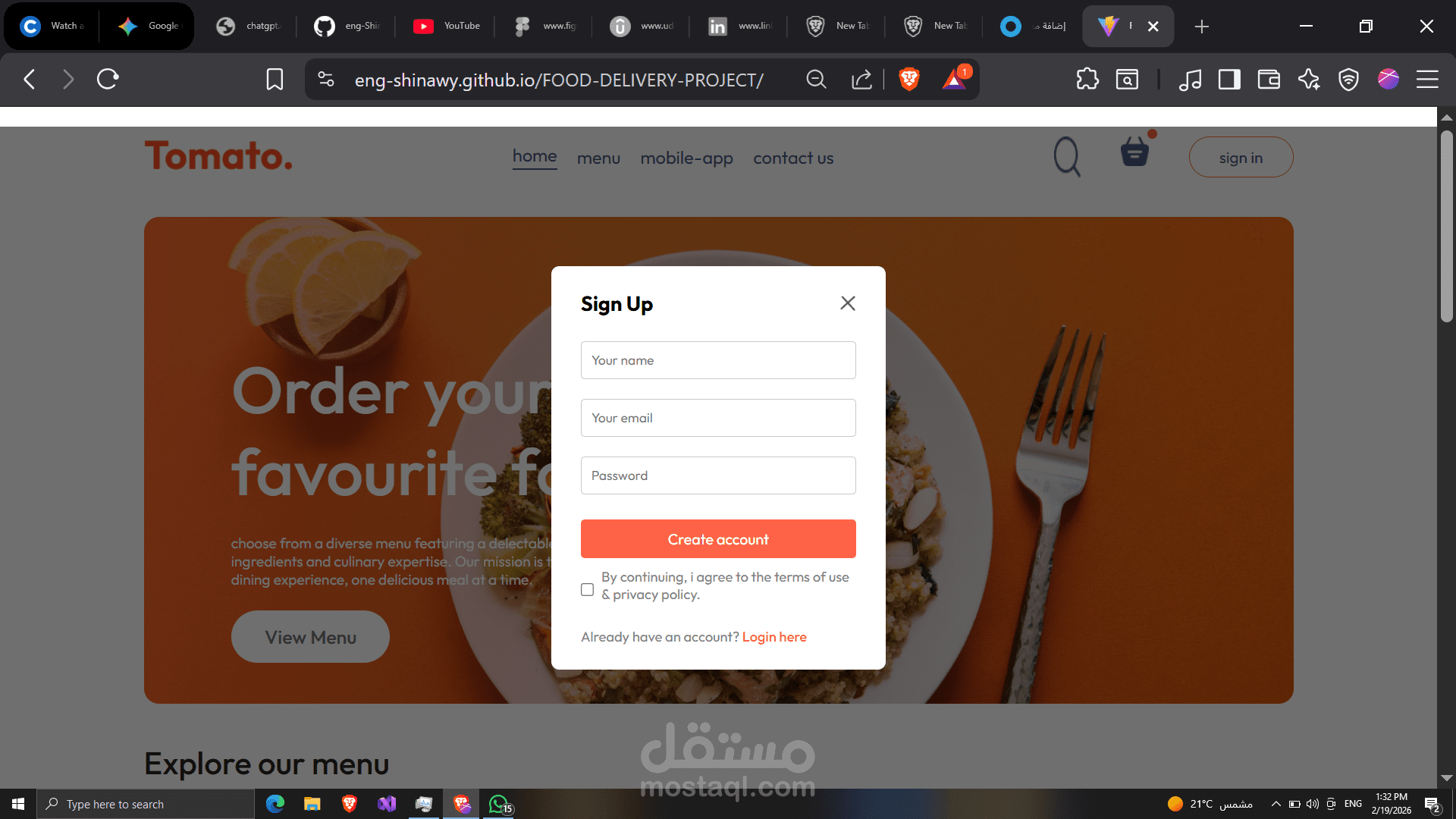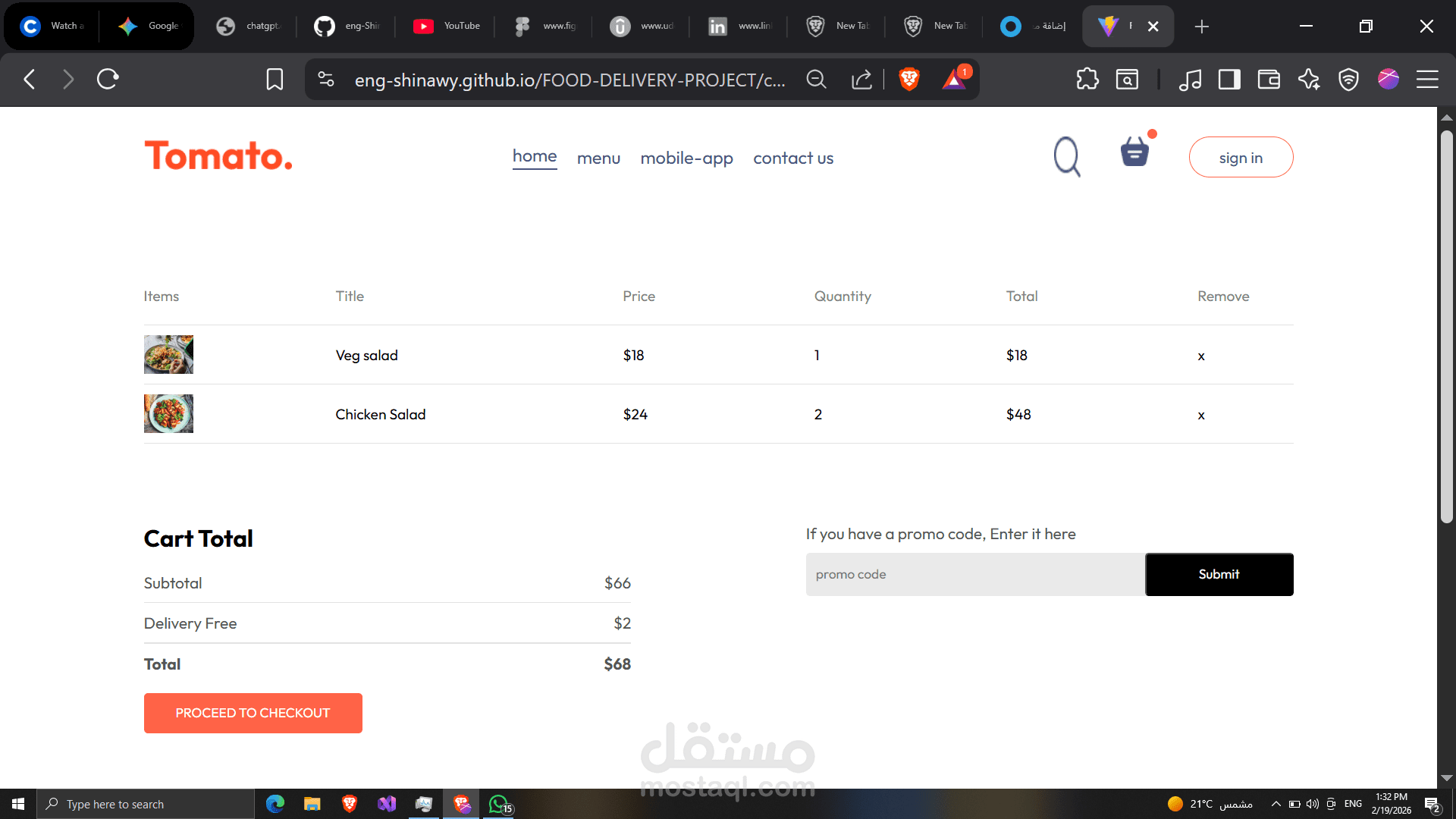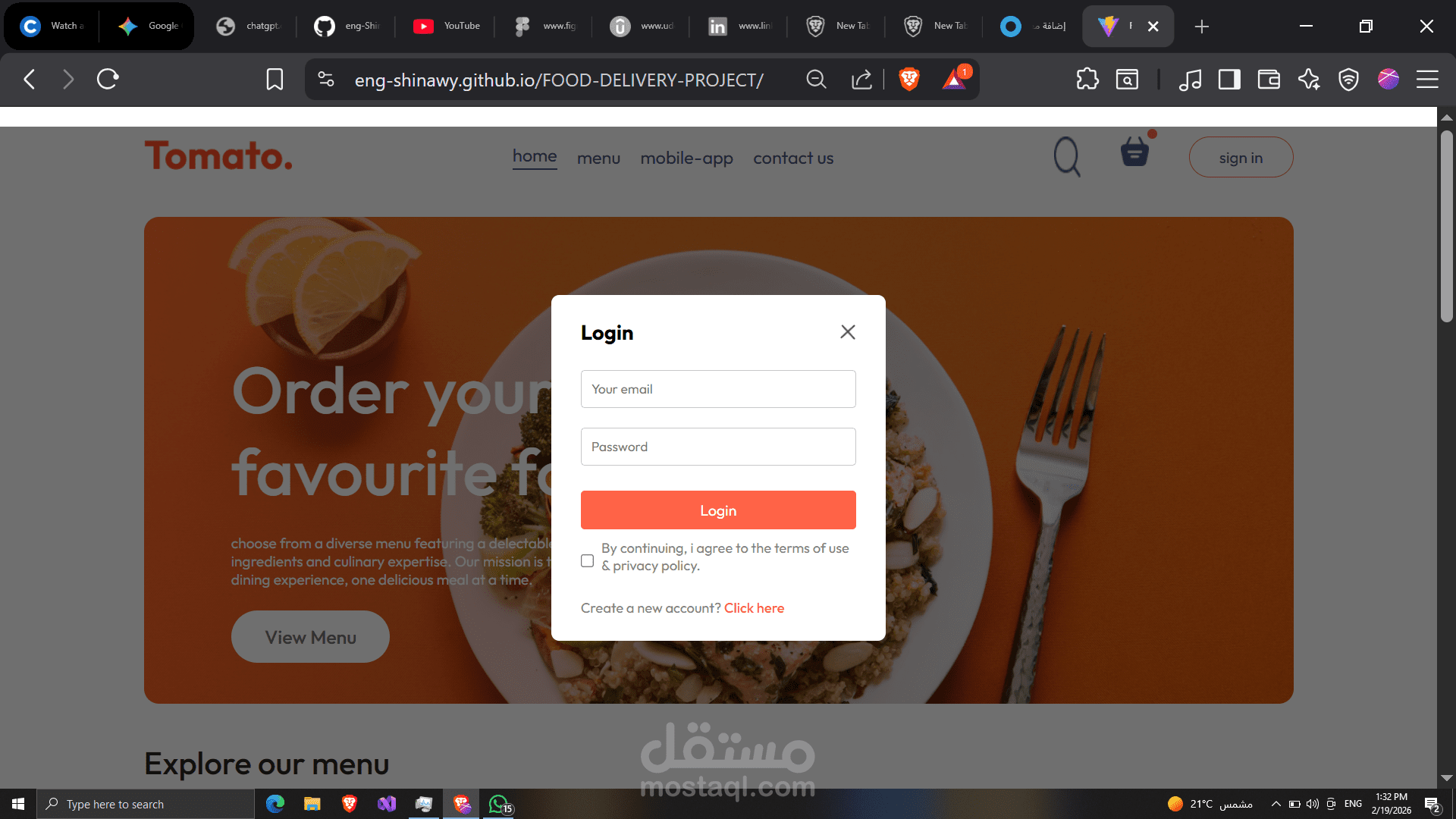 تطبيق ويب متكامل يهدف إلى تسهيل عملية طلب الطعام وتوصيله، تم بناؤه باستخدام تقنيات حديثة لضمان السرعة والكفاءة. المنظومة تتكون من ثلاث واجهات أساسية: واجهة المستخدم (Client)، لوحة تحكم الإدارة (Admin Dashboard)، وخادم خلفي (Backend API) قوي.