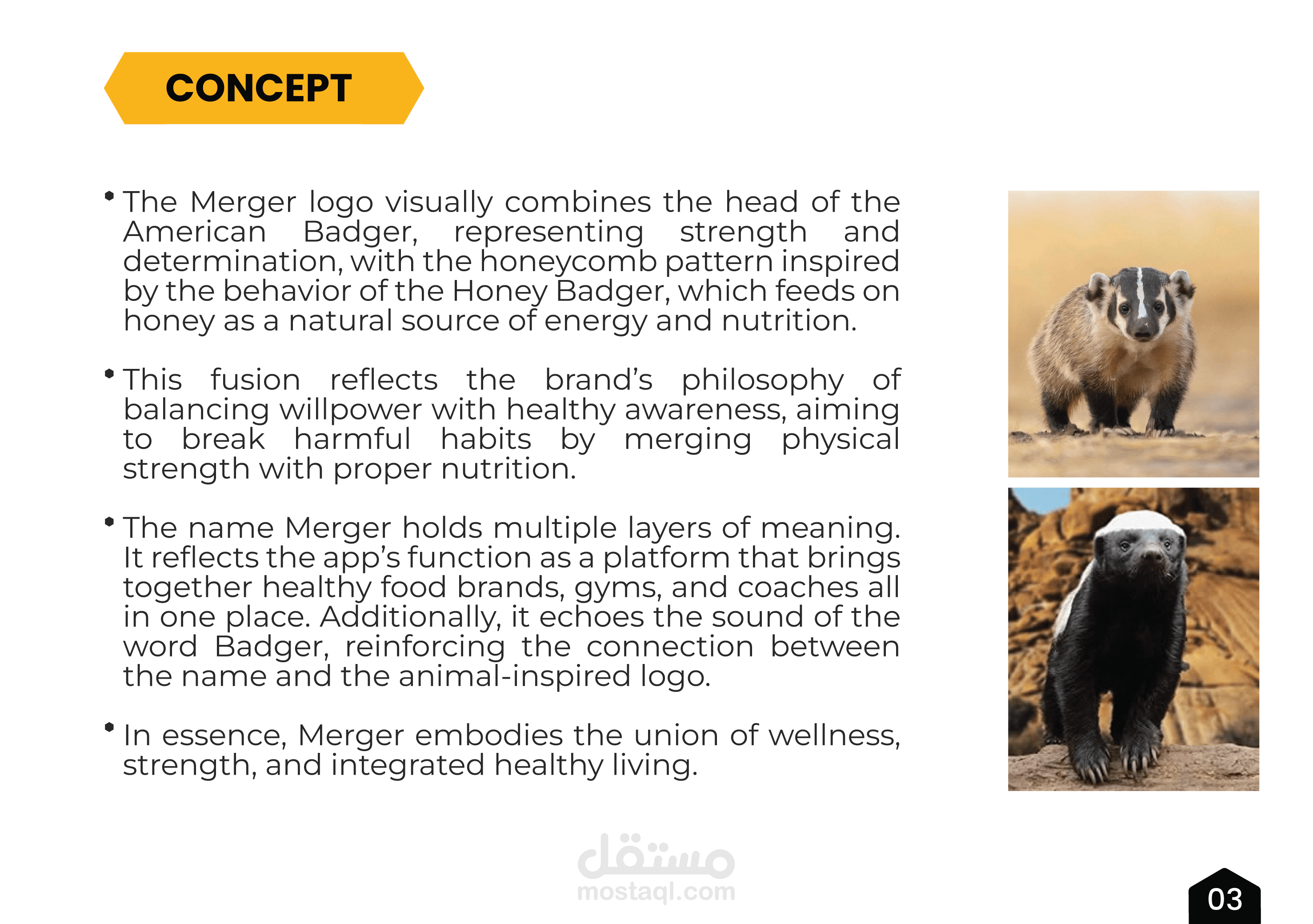 • يحمل اسم Merger عدة طبقات من المعاني؛ فهو يعكس وظيفة التطبيق كمنصة تجمع علامات الأطعمة الصحية، والصالات الرياضية، والمدربين في مكان واحد. كما أنه يحاكي صوت كلمة Badger، مما يعزز الارتباط بين الاسم والشعار المستوحى من الحيوان.